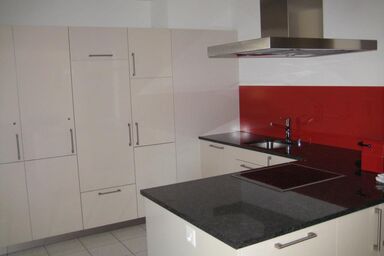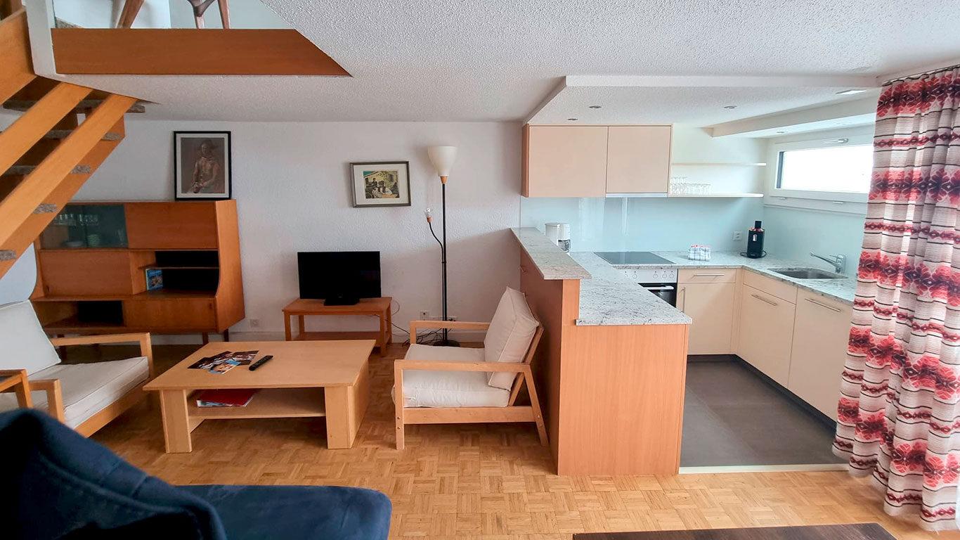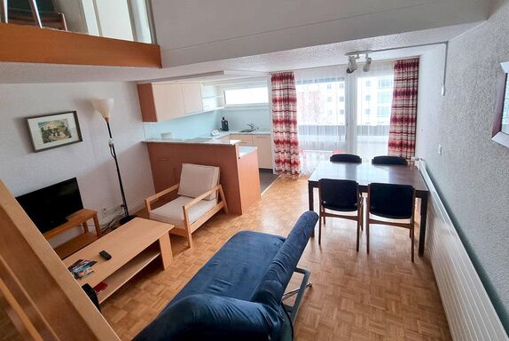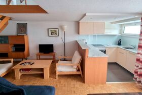 3-Zimmerwohnung auf 2 Etagen: Wohn-/Esszimmer mit 1 Bettsofa, 1 Doppelschlafzimmer, 1 Zweibettzimmer (ähnlich einer Gallerie), offene Wohnküche mit Geschirrspüler, Dusche/WC, zusätzliches WC, 2 Südbalkone, gratis WiFi, Radio, TV. Garage nur direkt beim Vermieter mietbar.