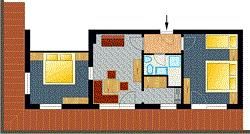 Rustikal eingerichtetes Appartement im 1. Stock mit komplett eingerichteter Wohnküche, Kabel-TV, Telefon, 2 Doppelzimmer (jedes Zimmer mit eigener Dusche), Vorraum, WC und Südbalkon. Größe: ca. 50m².