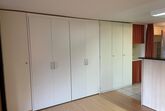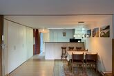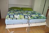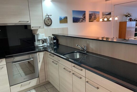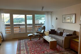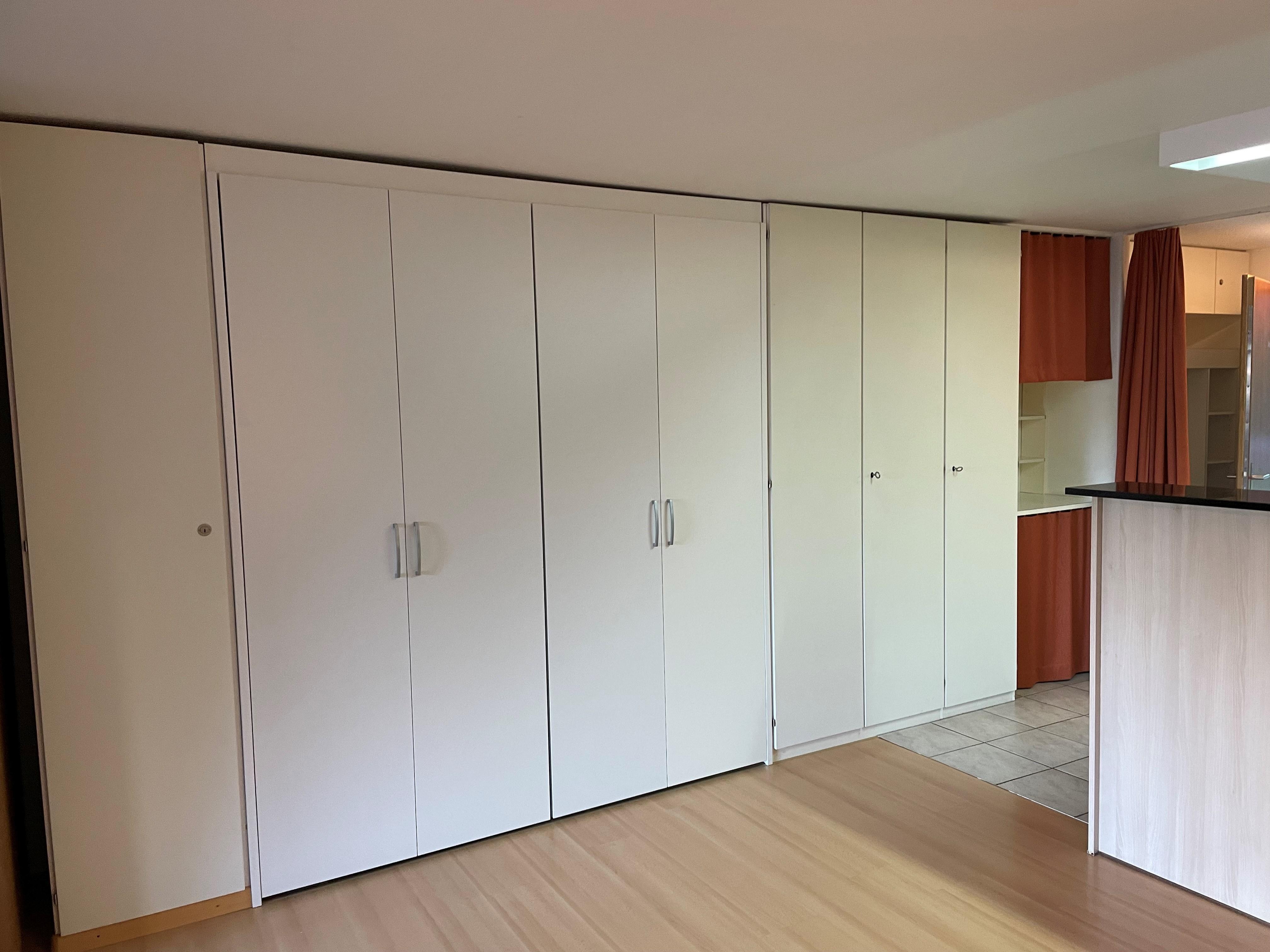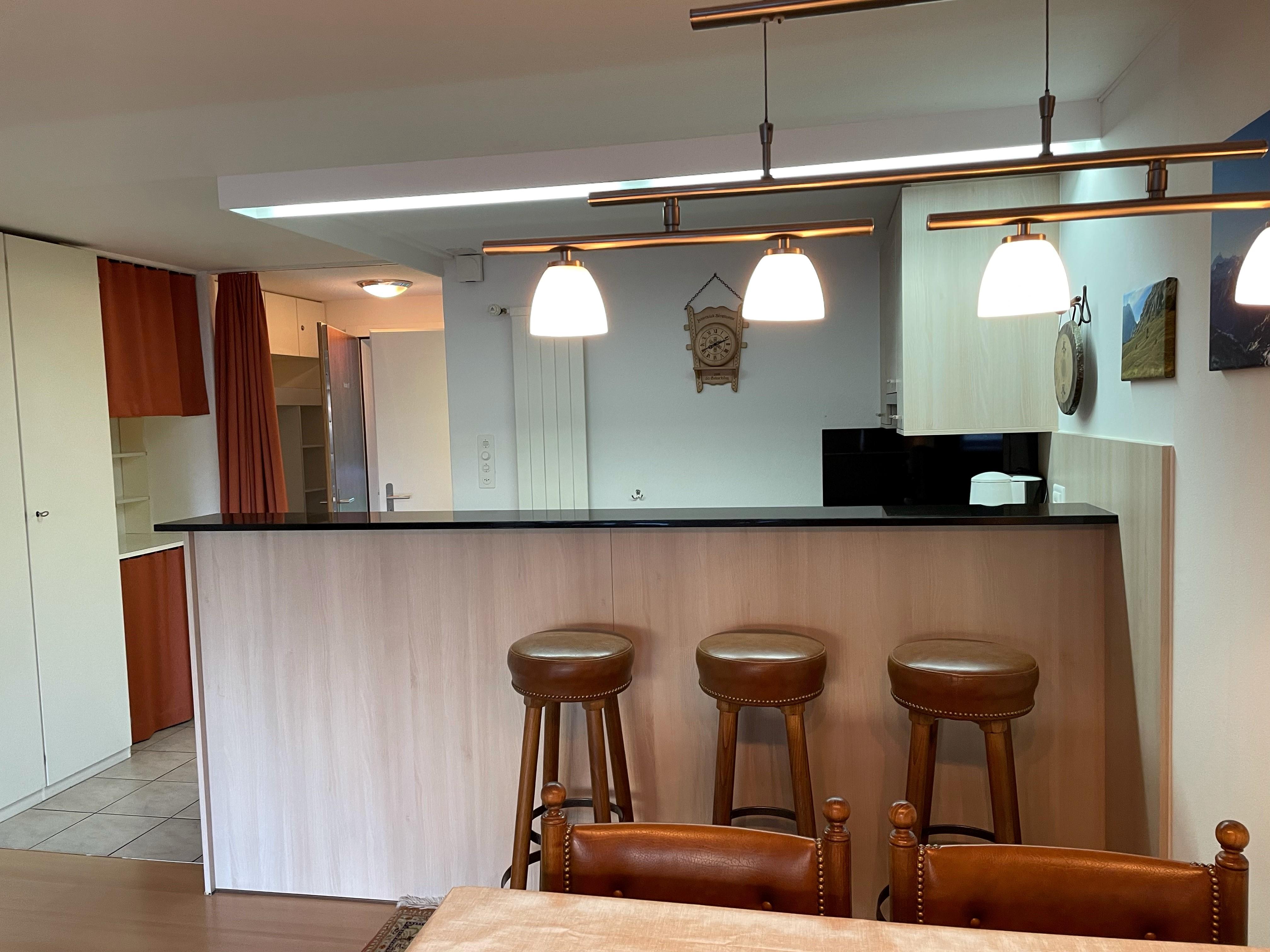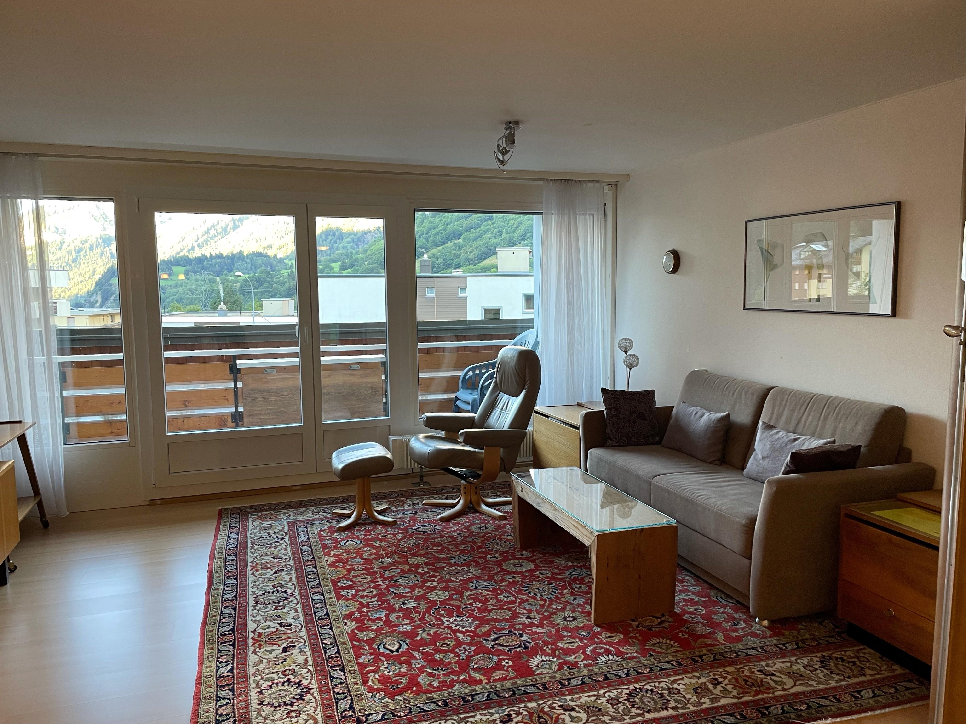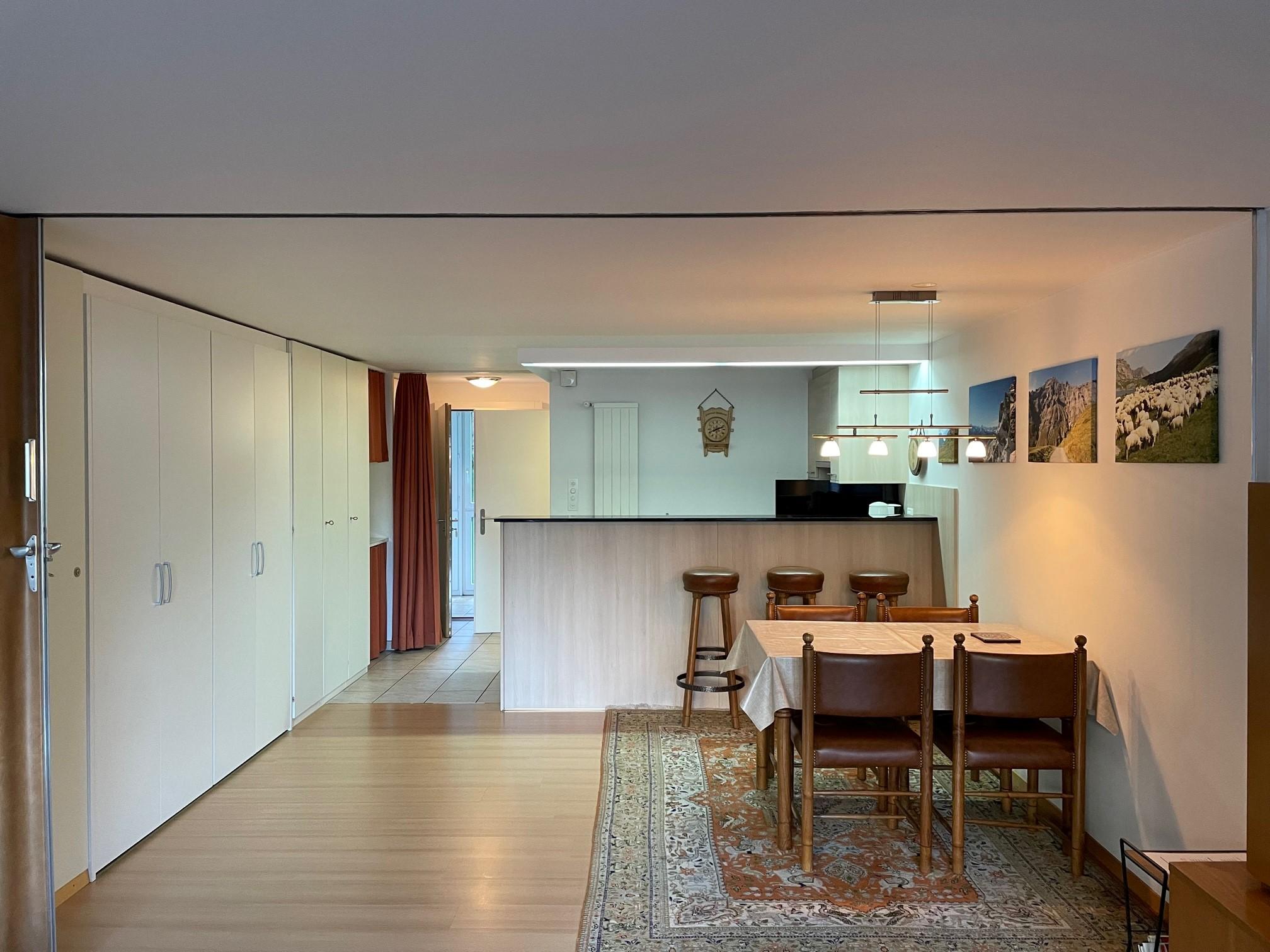 1-Zimmerwohnung (43m2): Wohn-/Esszimmer mit 2 Schrankbetten, offene Küche, Dusche/WC, Süd-Balkon, Radio, TV, gratis WiFi. Garage vorhanden. Ruhige Lage. In nächster Nähe: Haltestelle Ortsbus.