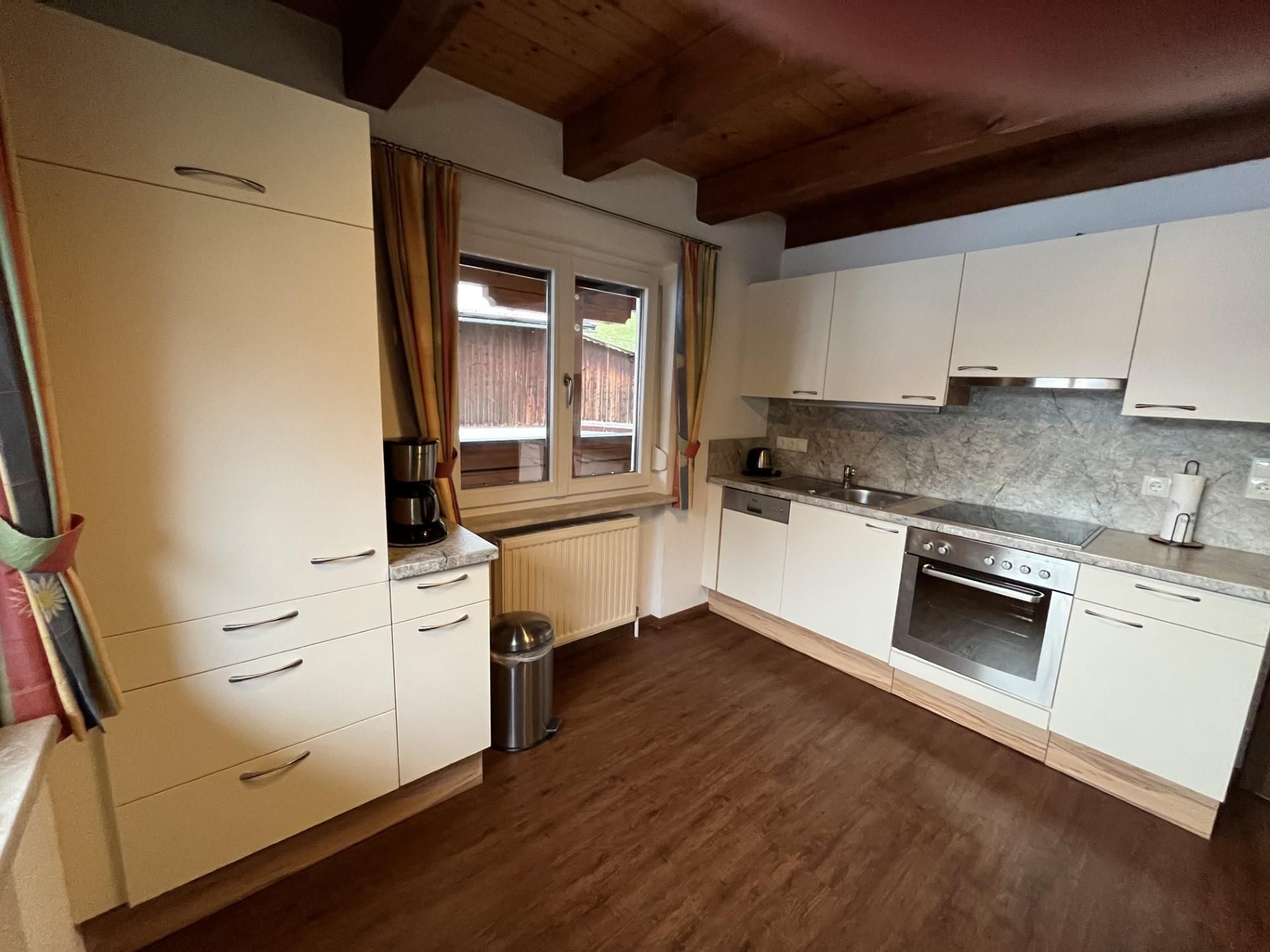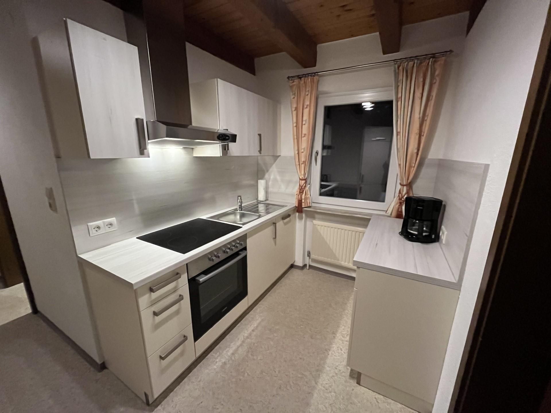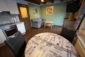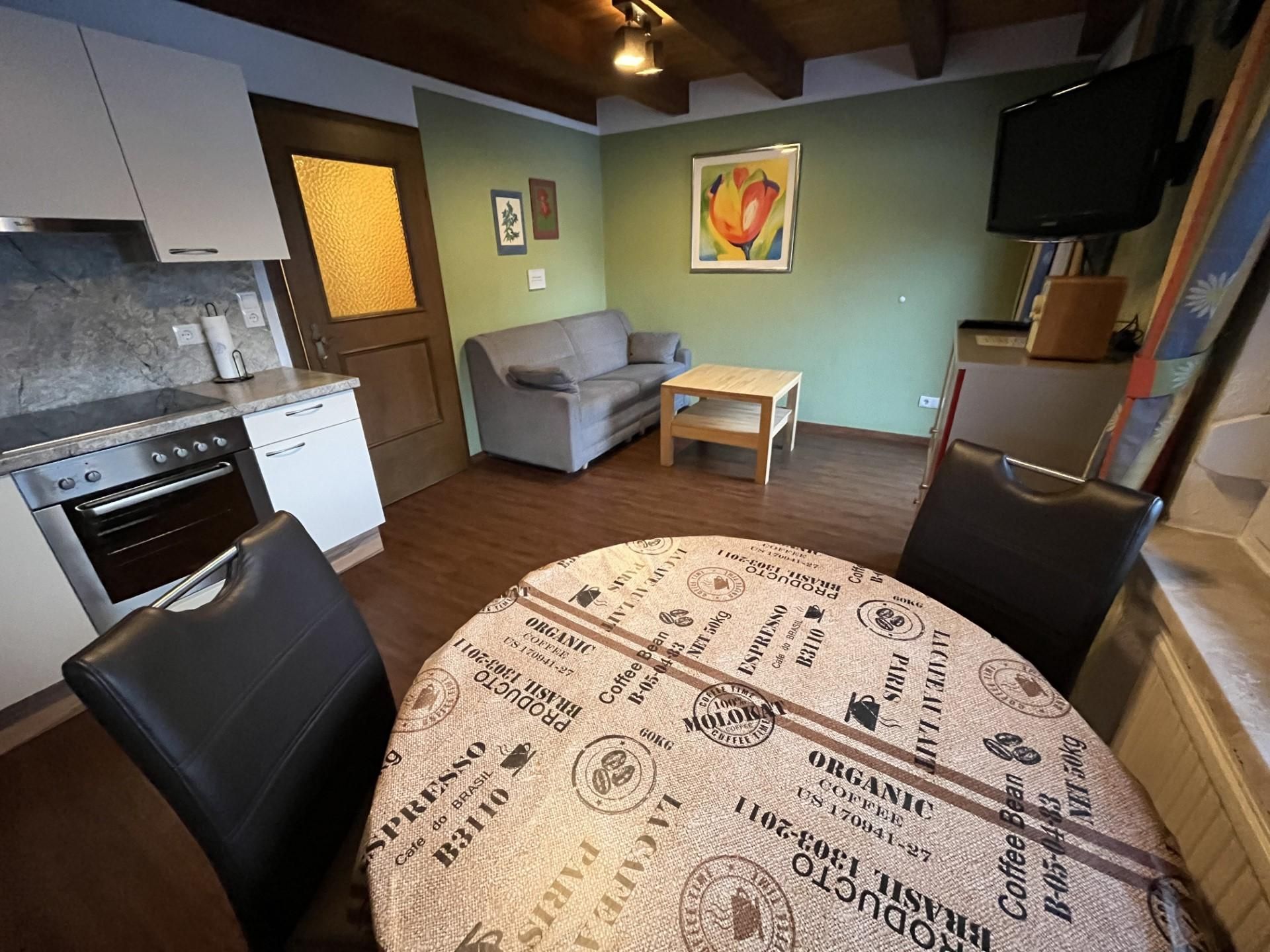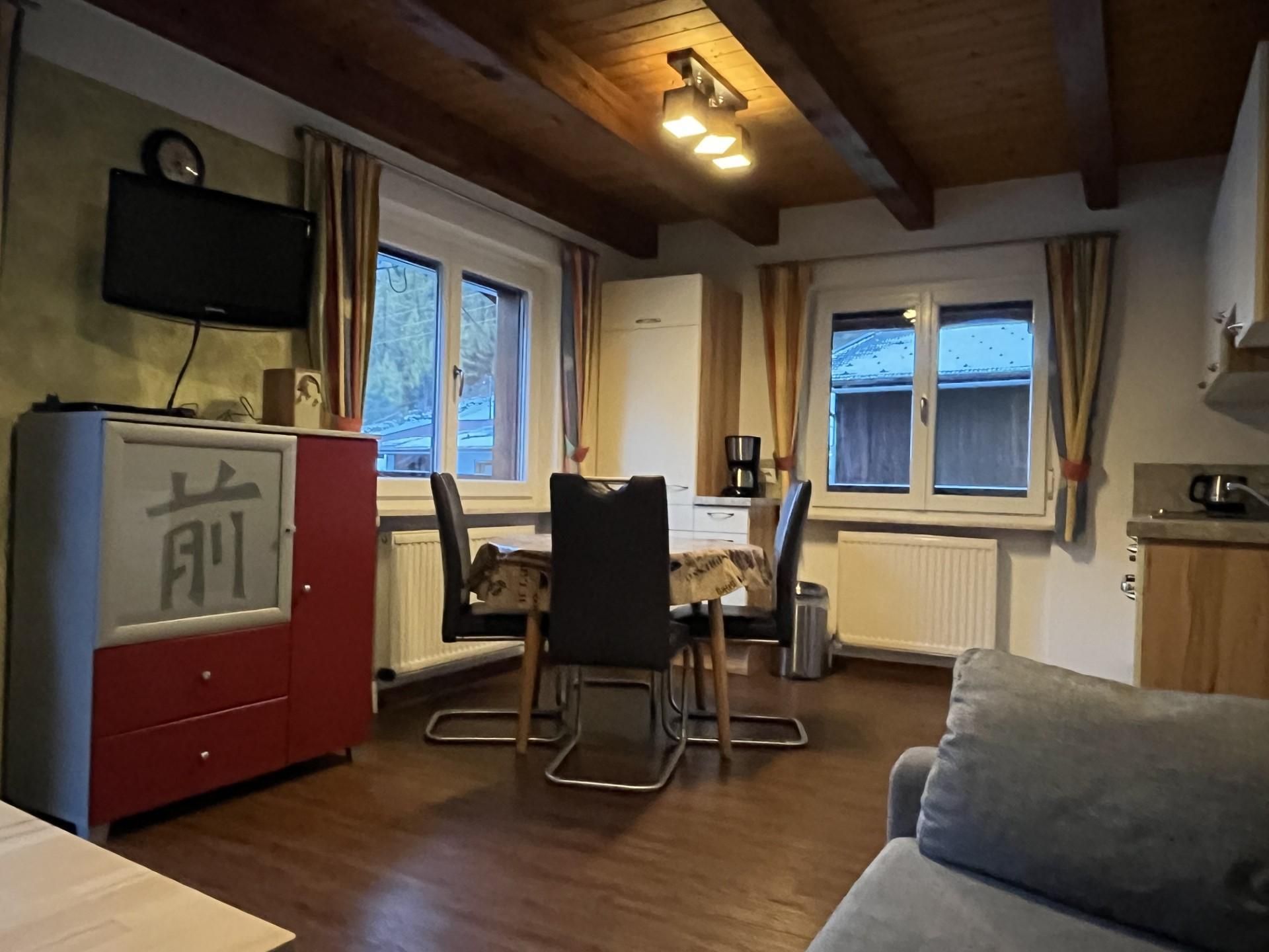 Großes Appartement für 2-3 Personen mit 1 Schlafzimmer und 1 Zustellbett, Dusche/WC, Wohnküche (mit Kaffeemaschine, Toaster, Spülmaschine und Wasserkocher, Herd mit Ceranfeld und Backrohr, Besteck und Geschirr sowie Töpfen; Tisch- und Küchenwäsche) mit Flachbildschirm- Sat TV, Radio und Südwestbalkon. Größe: ca. 38 m².