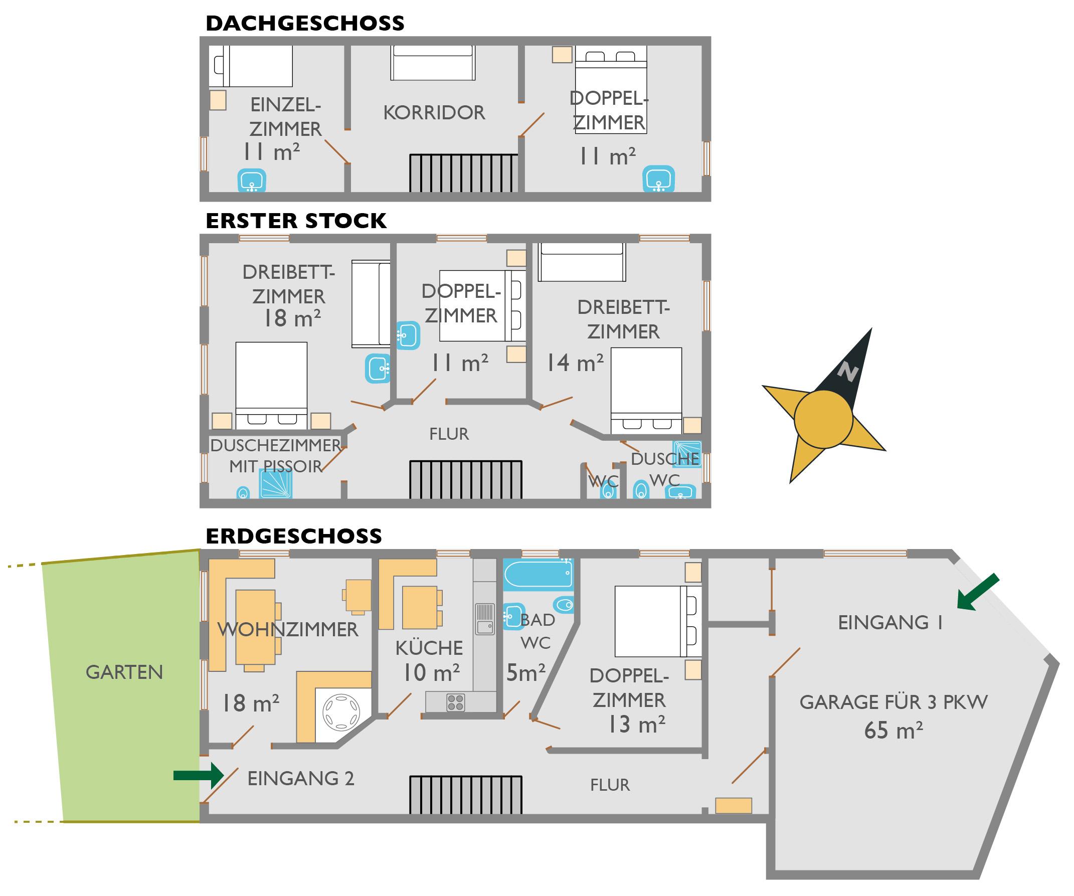 Ferienhaus mit ca. 140 m² auf 3 Etagen: 6 Schlafzimmer (je nach Wunsch als Einzel-, Doppel- oder Dreibett verfügbar); 1 Badezimmer mit WC; 1 separates WC; 2 Duschen (1 x mit Toilette und 1 x mit Pissoir); 1 Küche mit Geschirrspüler, großer Kühlschrank mit Gefrierfach, E-Herd mit Backrohr, Wasserkocher, Mikrowelle, Kaffeemaschine (Filter und Taps) und Waschmaschine; 1 Wohnzimmer mit Tiroler Bauernofen - im Winter und an kühlen Sommertagen ist der Ofen beheizt, Sat-TV,