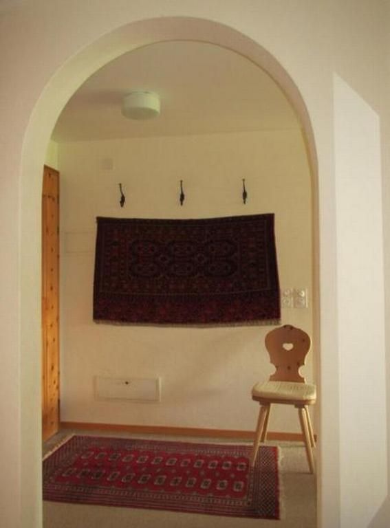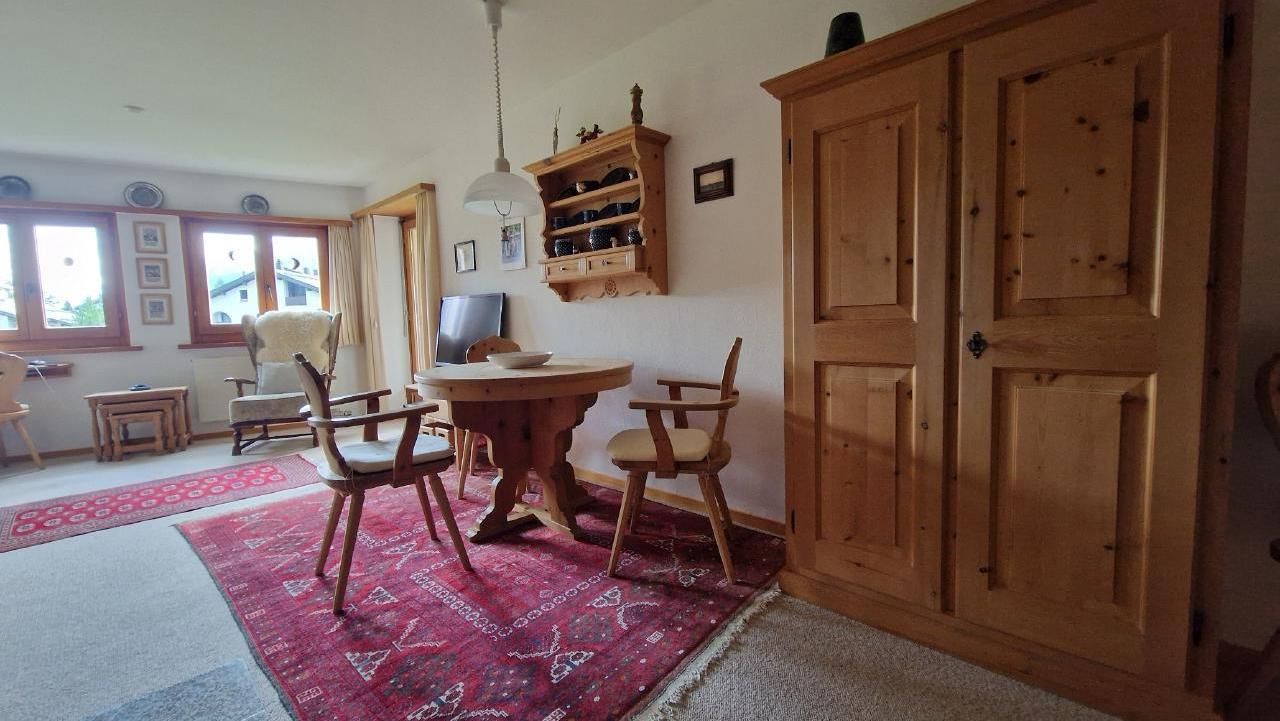 Innen erwartet Sie eine offene Küche, die keine Wünsche offen lässt: eine Abwaschmaschine, ein großer Kühlschrank mit Gefrierfach, ein Glaskeramik-Kochfeld sowie ein Backofen stehen zu Ihrer Verfügung. Das Wohnzimmer ist im gemütlichen Engadiner Stil gehalten, mit einer einladenden Sitzecke, einem ausziehbaren Sofa, einem Sessel, kleinen Satztischen und einem Bücherregal ausgestattet – der ideale Ort zum Entspannen. Ebenfalls zur Ausstattung gehören ein Flachbildfernseher HD-Qualität, Radio, CD-Player und Internet WLAN, deren Nutzung im Preis inbegriffen ist.