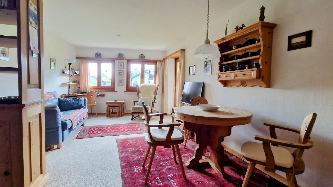 Der Außenbereich lässt ebenfalls keine Wünsche offen: Ein Lebensmittelgeschäft findet sich direkt im Quartier, und Ihr Auto parkt sicher in der Tiefgarage. Für Aktivitäten außerhalb der Wohnung bietet die direkte Umgebung Loipenanschlüsse und Wanderwege. Zudem sind Sie in nur 5 Minuten an der Haltestelle für den öffentlichen Verkehr.