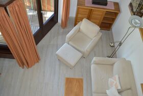 Sonstige Wohnzimmerausstattung (Wohnzimmer1): Geräumiger Wohnraum mit Sitzecke, Salontisch, Leselampe, Dig/-SAT TV, Radio, selbstwahl Telefon, Büffet, Essecke, Ausgang zur Balkon.