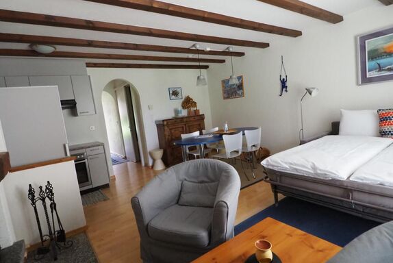 Es handelt sich um eine geschmackvoll möblierte 1.5 Zimmer-Parterre-Wohnung in einer Apartment- Siedlung in La Punt Chamues-ch an einer ruhigen und sehr sonnigen Lage mit unverbaubarer Aussicht. Die Wohnung im Erdgeschoss verfügt über einen gemütlichen Wohn-/Schlafraum mit Essecke, Cheminée, gut eingerichtete offene Küche, ein kleines Zimmer mit Etagenbett, Bad/WC, Gartensitzplatz, Autoeinstellplatz. *4 Plattenherd, Backofen, Kühlschrank mit Gefrierfach, Geschirrspülautomat. Hunde nur auf Anfrage.