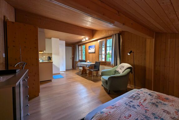 Entdecken Sie die ideale Ferienwohnung für Alleinreisende in Grindelwald, einem Juwel im Kanton Bern. Die charmante 1-Zimmerwohnung befindet sich auf der 2. Etage eines freistehenden Hauses und wurde konzipiert, um Ihren Aufenthalt so angenehm wie möglich zu gestalten. Hier verschmelzen Gemütlichkeit und Funktion zu einem harmonischen Wohnkonzept, das sowohl zum Entspannen als auch zum Erkunden der beeindruckenden Umgebung einlädt.
