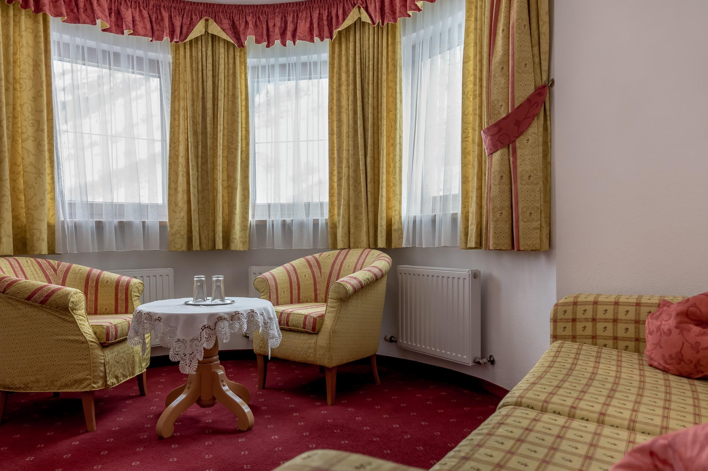 Junior Suite Nord: Ein großes, sehr schön ausgestattetes Doppelzimmer, teilweise mit Balkon zur Nordseite, Selbstwahltelefon, W-Lan, Zimmersafe, Kabel-TV mit Flat-Screen, sowie Sitzecke mit Couch (ausziehbar) und Fauteuils. Badezimmer mit Badewanne, Fön, Kosmetikspiegel und getrenntem WC. Größe ca. 35-40 m²
