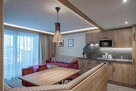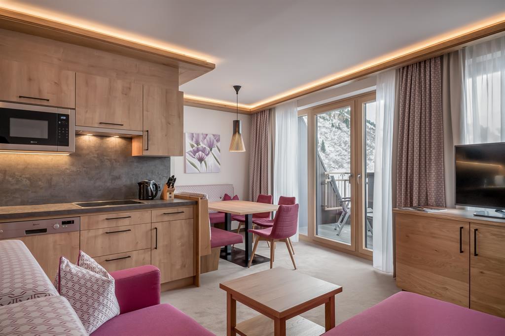 Neues Apartment Panorama (ca. 50 m²). Ideal für Menschen die Unabhängigkeit und Platz im Urlaub lieben. Doppelzimmer, offener Wohnbereich mit Küchenzeile (4-Platten-Herd, Kühlschrank, Mikrowelle, Toaster, Kaffeemaschine, Küchen- und Essgeschirr, Besteck), Essecke und ausziehbarer Couchecke mit Schlafsofafunktion zum Entspannen. Badezimmer mit Badewanne und Dusche, Pflegeprodukte, Haarfön, Kosmetikspiegel und separatem WC. Weitere Ausstattung: zwei Kabel-TV mit Flat-Screen, Selbstwahltelefon und Zimmersafe.