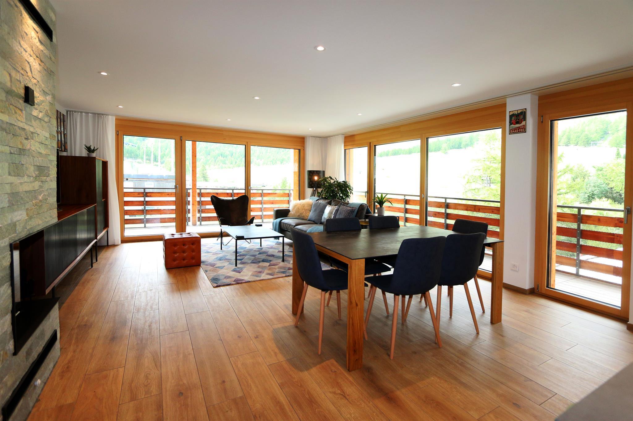 Die Wohnung verfügt über eine offene Küche mit Essbereich, Wohnzimmer mit Kamin und Flachbildfernseher. Die Küche ist komplett ausgestattet mit Geschirrspüler, Backofen, Herd, Kaffeemaschine, Toaster, Wasserkocher, Käsefondue-Set und Raclette-Ofen. Von der Wohnung hat man einen herrlichem Panoramablick auf die Berge. Es hat einen grossen privaten Balkon. Die Wohnung verfügt über drahtloser Internetzugang.