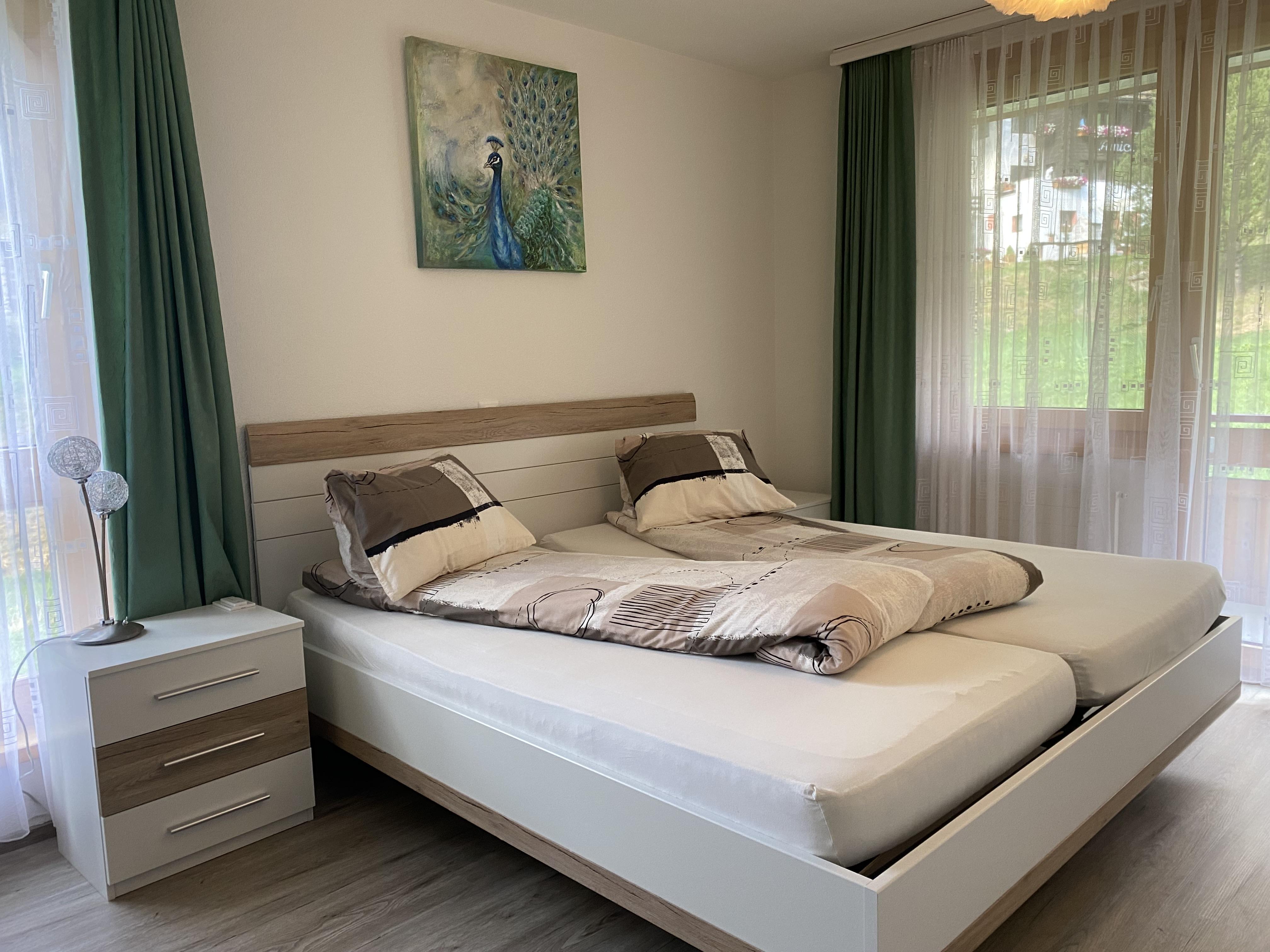 Eines der Schlafzimmer hat einen Balkon zur Westseite mit Blick auf die Ausläufer der Mischabelkette. Das 2. Schlafzimmer befindet sich auf der Südseite mit Blick in den Garten und verfügt über ein eigenes Badezimmer (Badewanne / WC / Waschbecken / Fön).