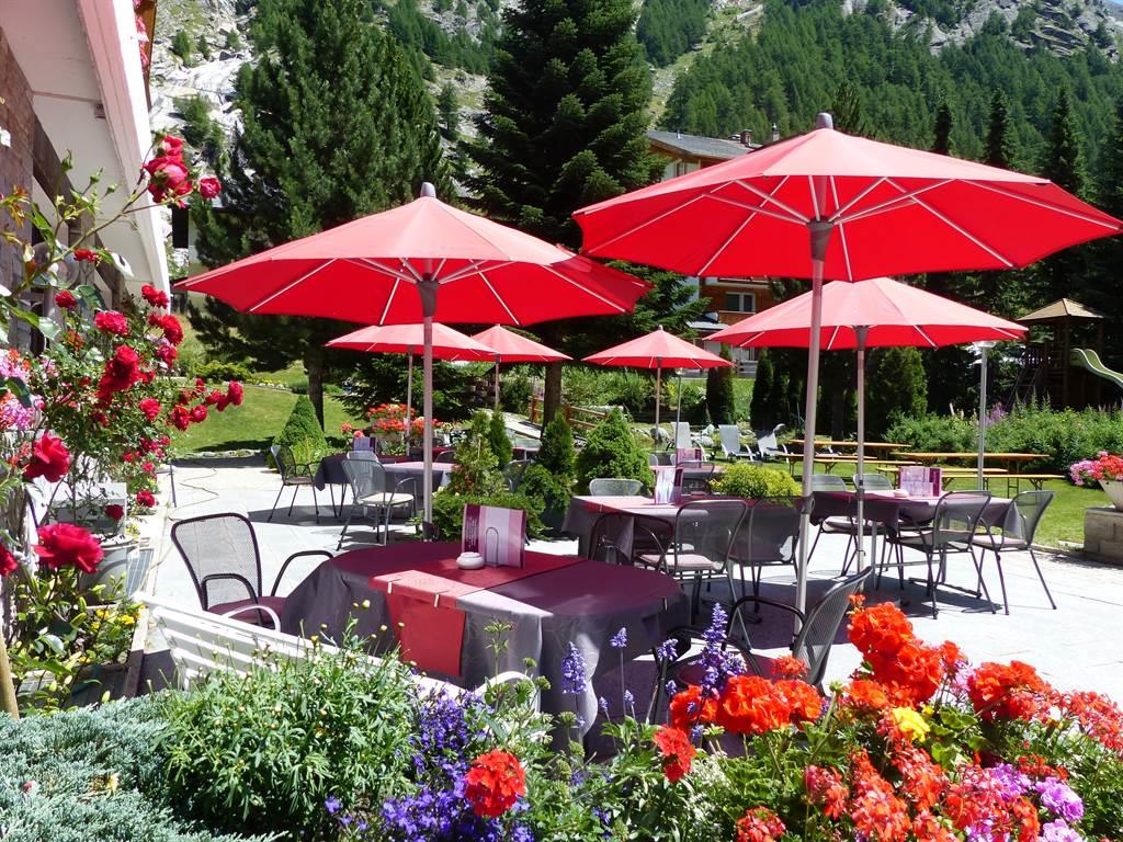 im Sommer lädt das blumengeschmückte Garten-Restaurant auf der Südseite des Hotels zum Verweilen ein. Auch der angrenzender Spielplatz dürfen die Kinder mitnutzen.