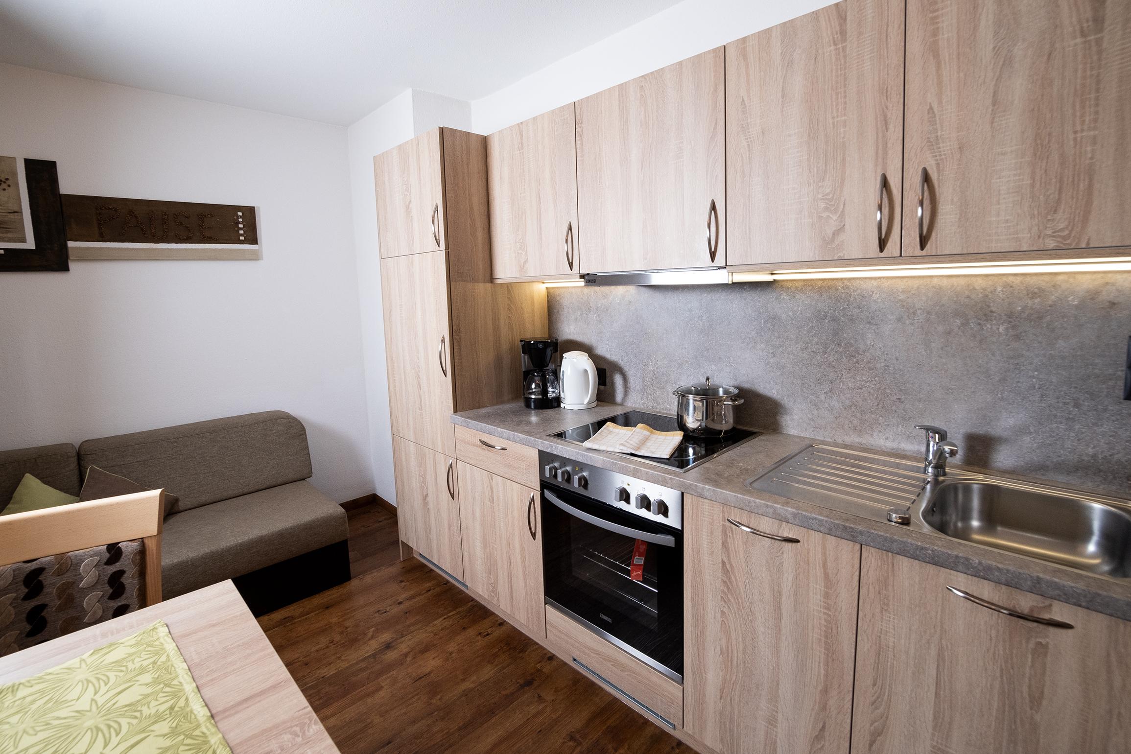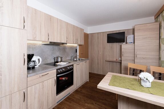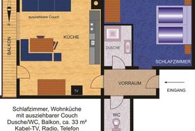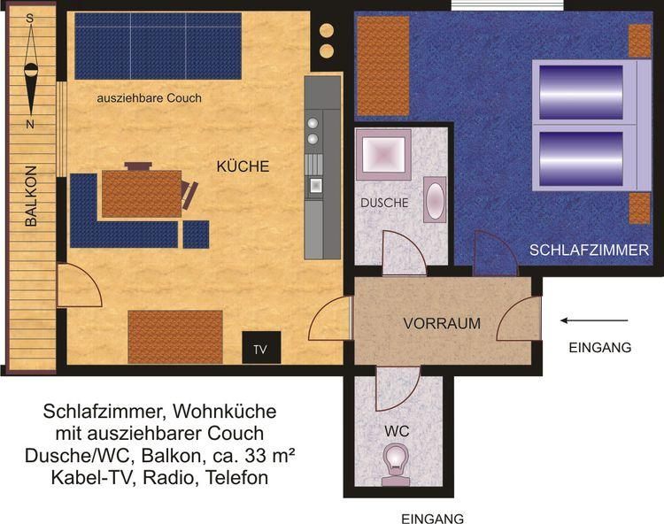 Gut ausgestattetes Appartement im 1. Stock mit großer Wohnküche, Sofa, Doppelzimmer mit Dusche und Föhn, separates WC, Balkon, Radio, Kabel-Flat-TV, Geschirrspüler, Toaster, Wasserkocher etc. Bettwäsche und Handtuch-Service. Größe: ca. 33 m².