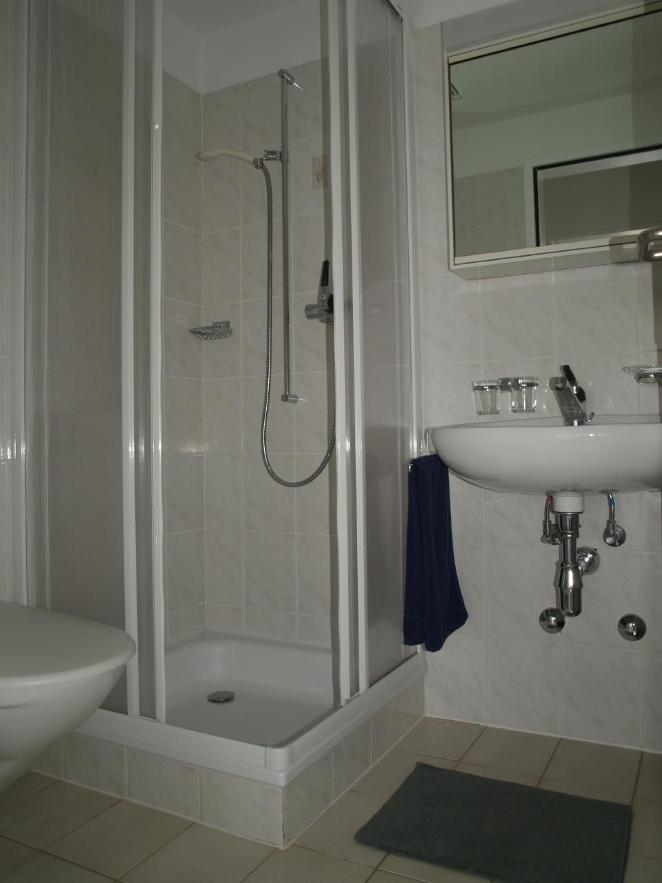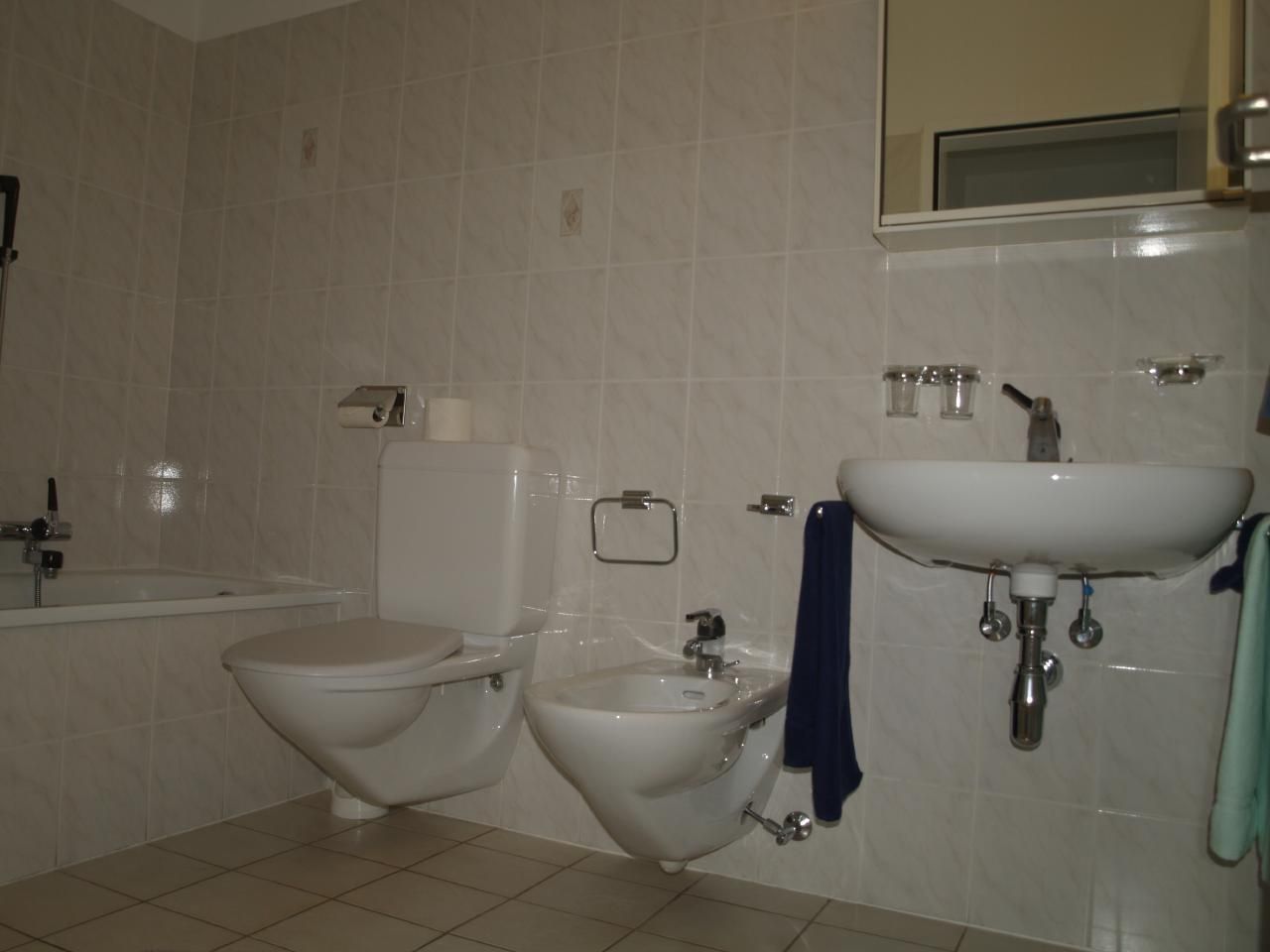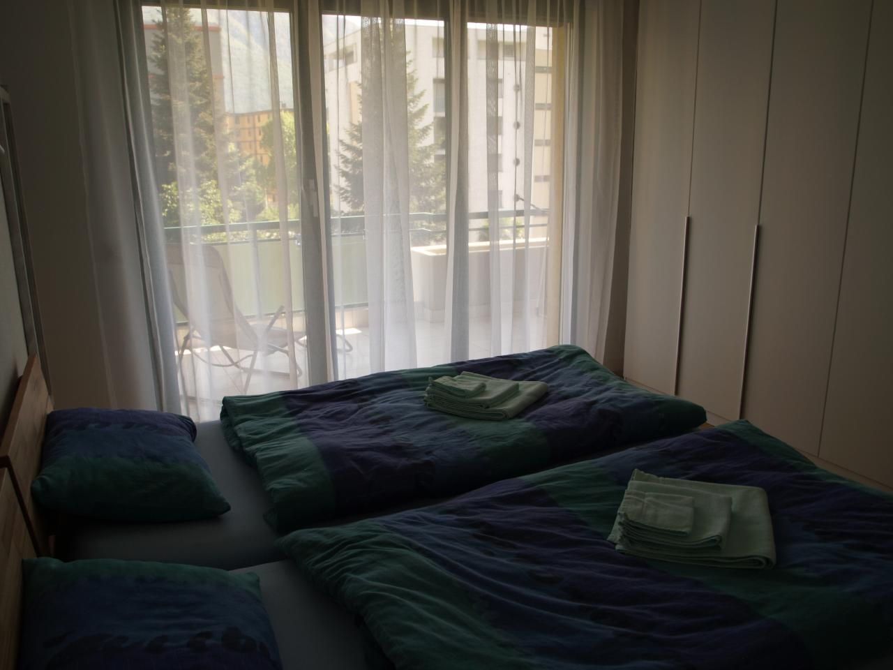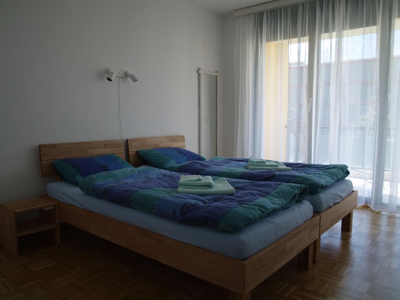 Im Schlafzimmer stehen zwei Einzelbetten (90x200cm) und ein grosser Kleiderschrank. Die Wohnung ist mit zwei Badezimmer ausgestattet, eine Dusche / WC, das zweite Badewanne / WC.