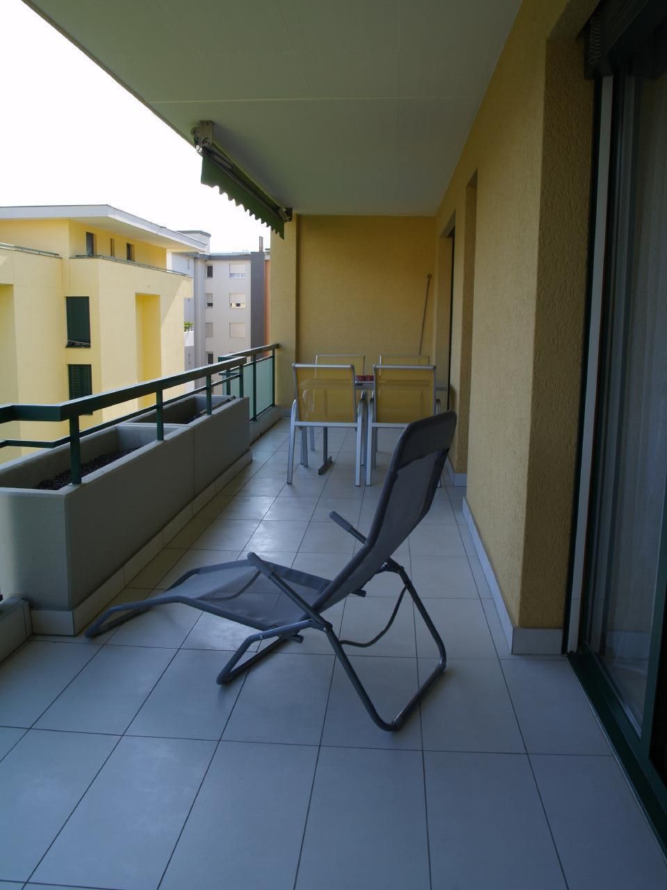 Grosser Balkon mit Liegestuhl und Esstisch für 4 Personen