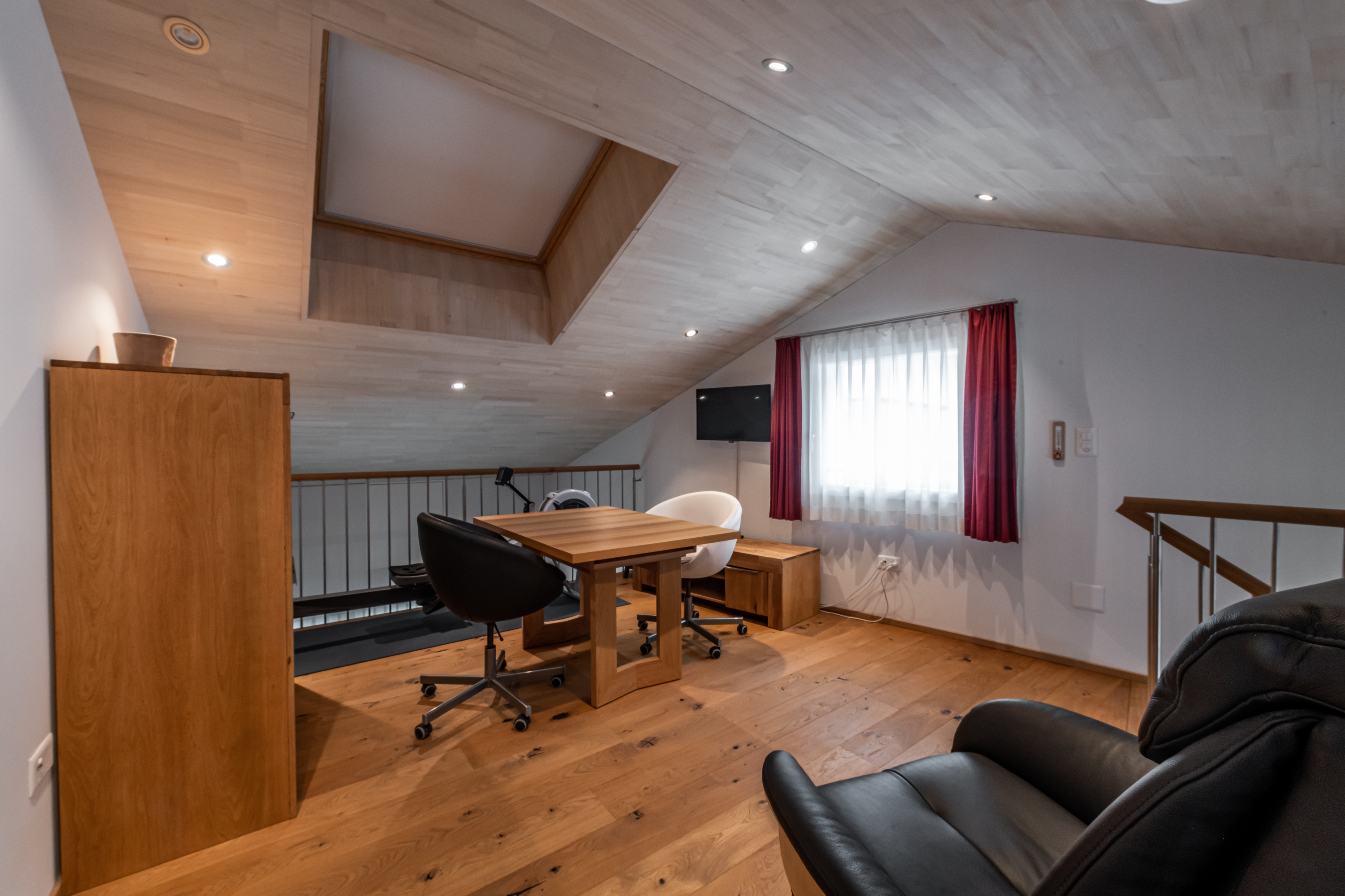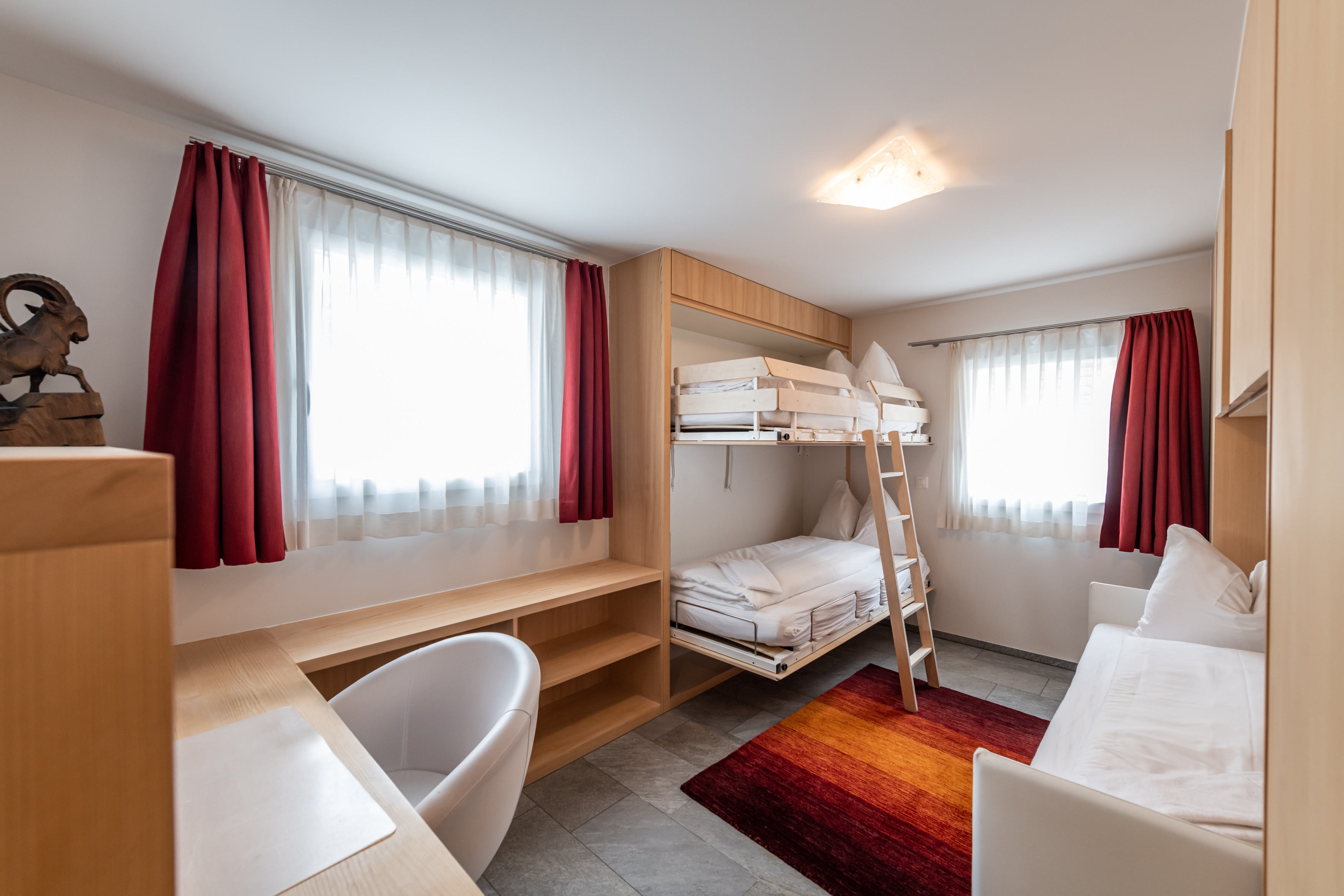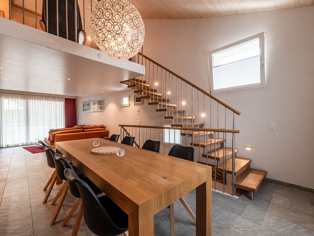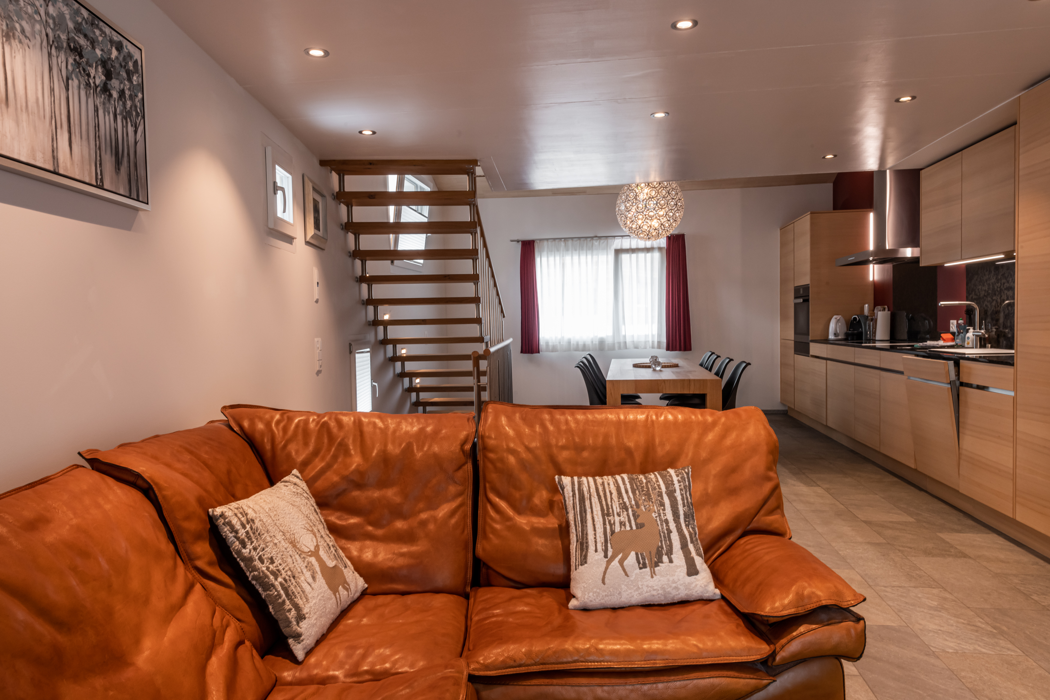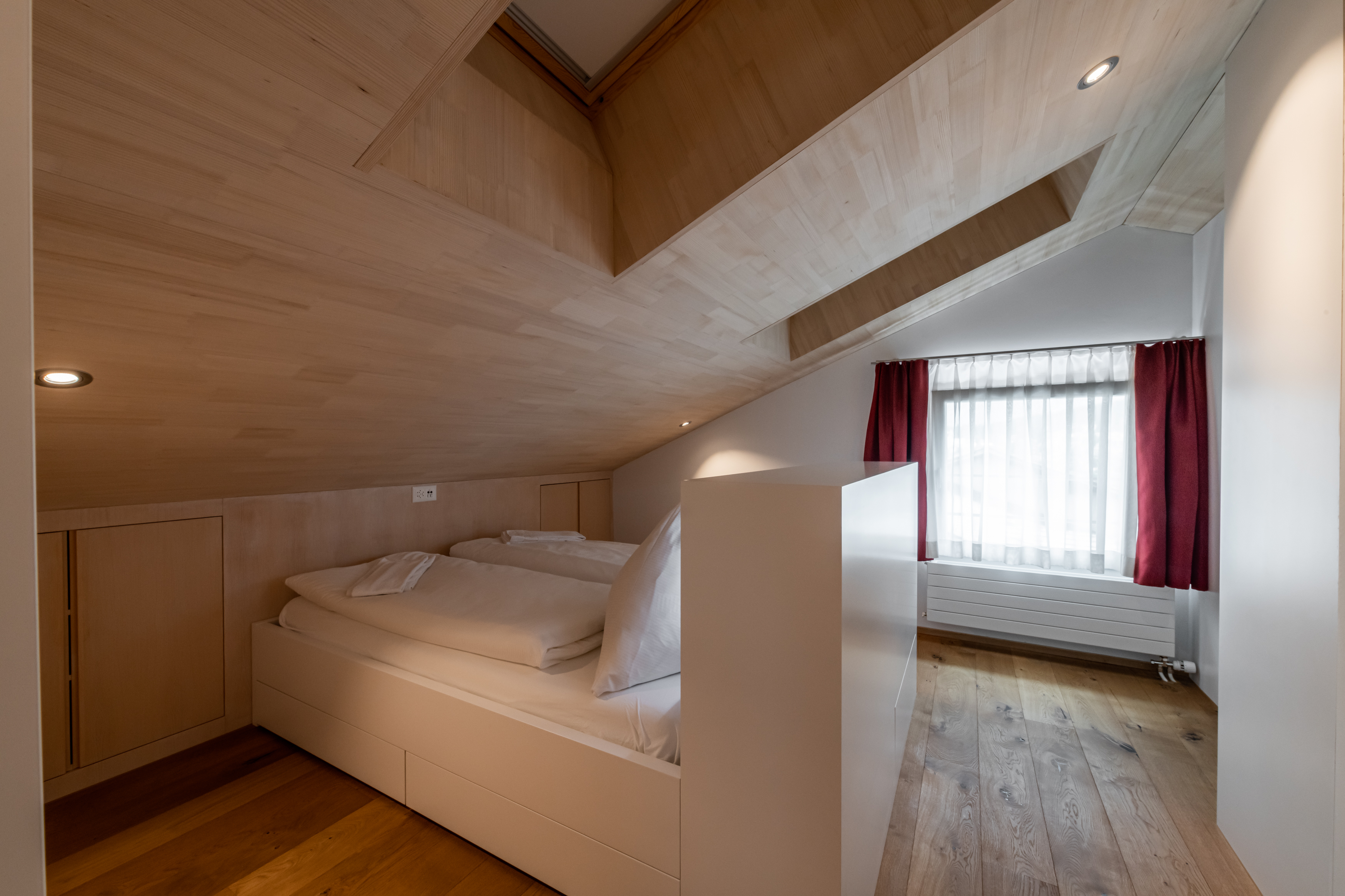 Die modern eingerichtete Wohnung bietet Platz für 6 Personen. Die geräumige Küche mit Wohnzimmer und Balkon, lädt für gesellige Abende drinnen, wie draussen ein. Nebst dem grossen Esstisch und dem gemütlichen Sofa, bringt das heimelige Cheminée eine entspannte Atmosphäre in den Raum. Im Erdgeschoss gibt es ein Kinderzimmer mit einem Kajüten- bzw. Wandbett und einem Sofabett. Im Zimmer daneben befindet sich ein Extrabett für eine Einzelperson, wobei sich im selben Raum auch die Waschmaschine und der Trockner befindet. Ebenfalls können dort Skis und Snowboards gelagert werden. Wichtig: Bei diesem Bett handelt es sich um ein Extrabett und die Person, die dort schläft, ist sich bewusst, dass dieses Zimmer nicht den gleichen Standard wie die weiteren Schlafräume aufweisen kann, da dort womöglich Skis und Snowboards aufbewahrt werden und sich die Waschmaschine und der Trockner darin befinden. Alternativ können die Wintersportgeräte oder Bikes in der Garage aufbewahrt werden. Im Erdgeschoss gibt es eine Nasszelle mit Toilette und Dusche. Oberhalb der Küche und des Wohnraumes im ersten Stock, befindet sich eine Galerie mit Schreibtisch und TV. Dahinter folgt ein separates Zimmer mit weiterem Doppelbett und einem Badezimmer mit begehbarer Badewanne/Dusche und Toilette.