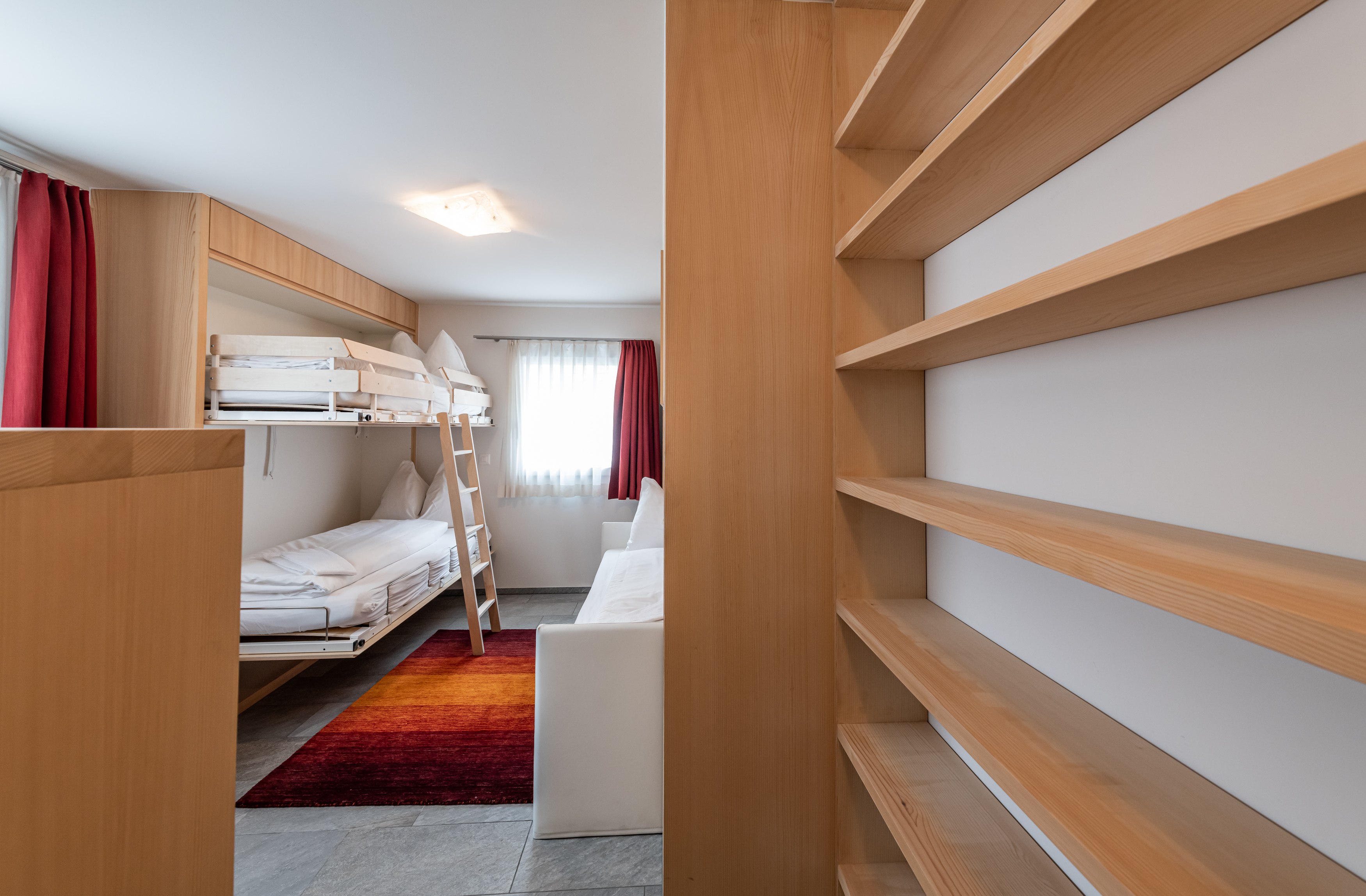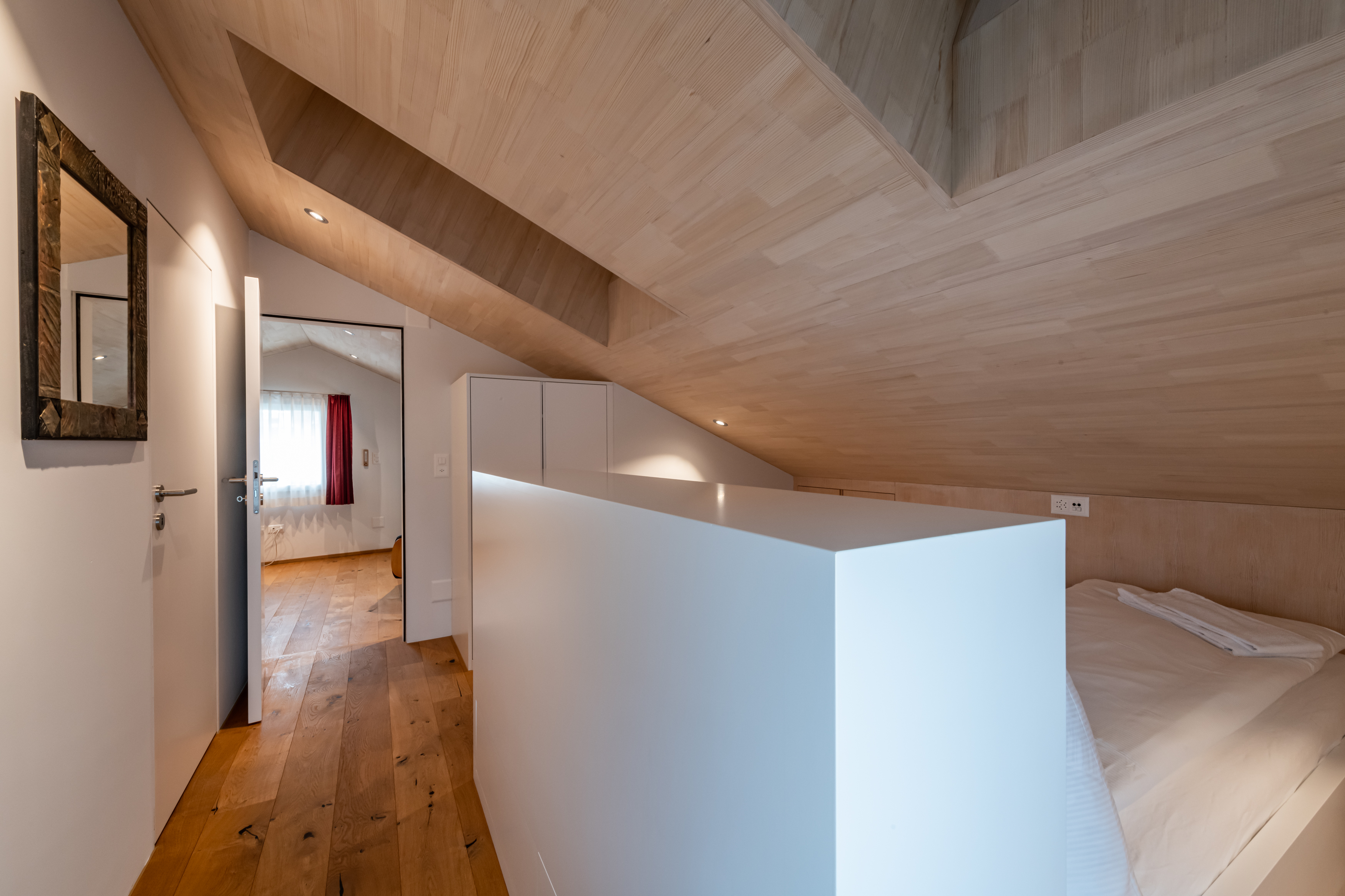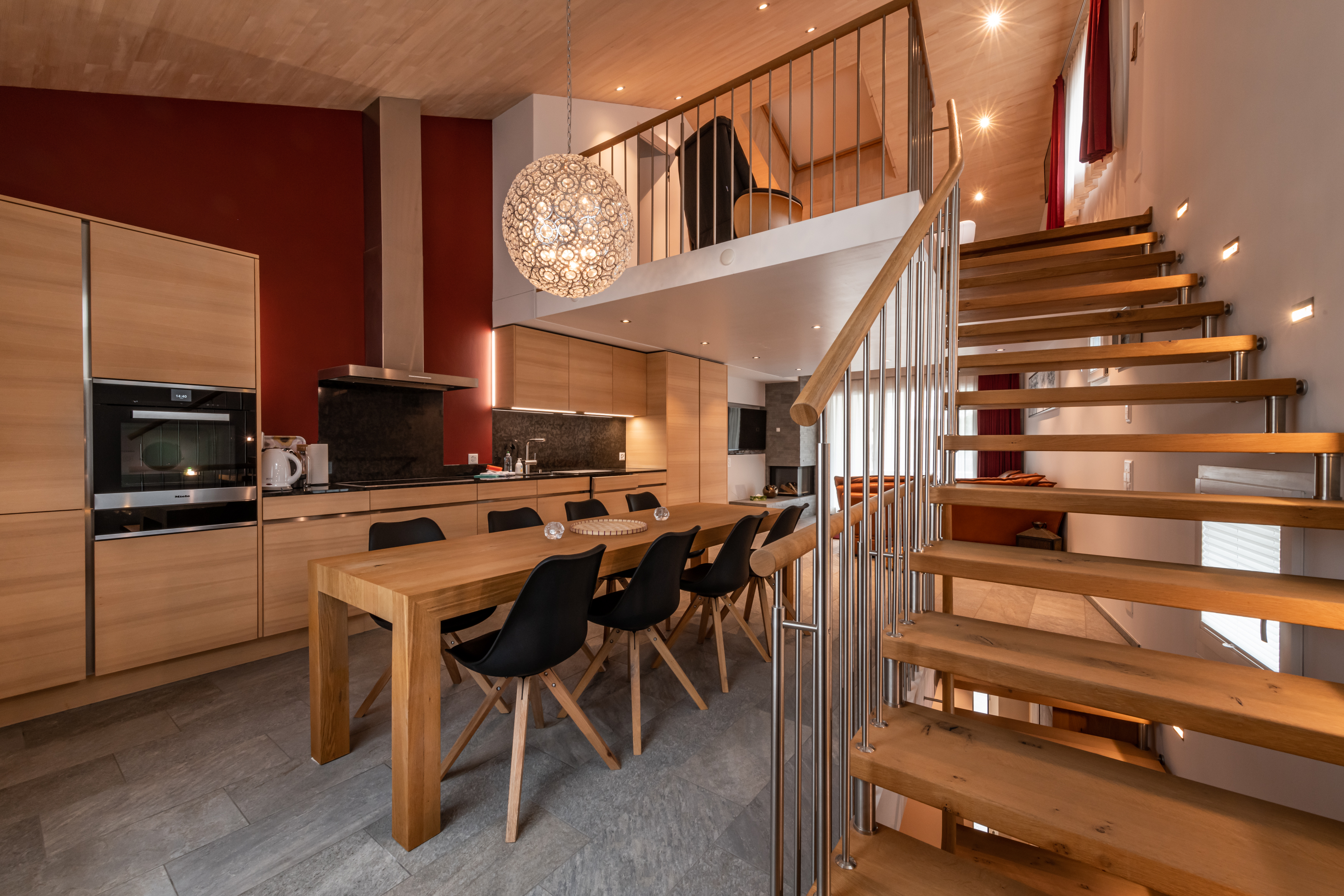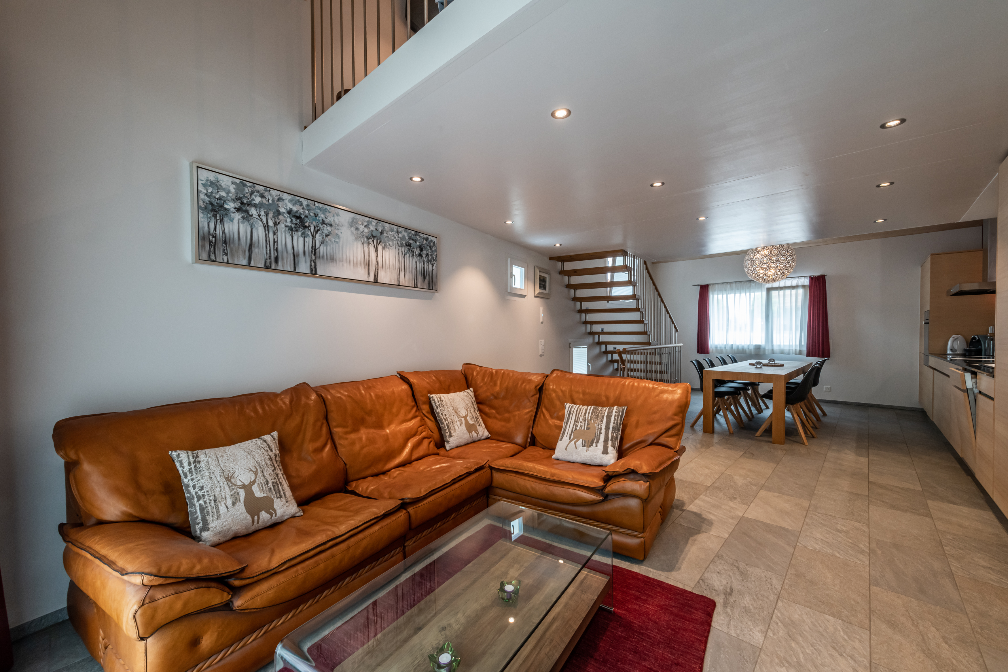 Die modern eingerichtete Wohnung bietet Platz für 6 Personen. Die geräumige Küche mit Wohnzimmer und Balkon, lädt für gesellige Abende drinnen, wie draussen ein. Nebst dem grossen Esstisch und dem gemütlichen Sofa, bringt das heimelige Cheminée eine entspannte Atmosphäre in den Raum. Im Erdgeschoss gibt es ein Kinderzimmer mit einem Kajüten- bzw. Wandbett und einem Sofabett. Im Zimmer daneben befindet sich ein Extrabett für eine Einzelperson, wobei sich im selben Raum auch die Waschmaschine und der Trockner befindet. Ebenfalls können dort Skis und Snowboards gelagert werden. Wichtig: Bei diesem Bett handelt es sich um ein Extrabett und die Person, die dort schläft, ist sich bewusst, dass dieses Zimmer nicht den gleichen Standard wie die weiteren Schlafräume aufweisen kann, da dort womöglich Skis und Snowboards aufbewahrt werden und sich die Waschmaschine und der Trockner darin befinden. Alternativ können die Wintersportgeräte oder Bikes in der Garage aufbewahrt werden. Im Erdgeschoss gibt es eine Nasszelle mit Toilette und Dusche. Oberhalb der Küche und des Wohnraumes im ersten Stock, befindet sich eine Galerie mit Schreibtisch und TV. Dahinter folgt ein separates Zimmer mit weiterem Doppelbett und einem Badezimmer mit begehbarer Badewanne/Dusche und Toilette.