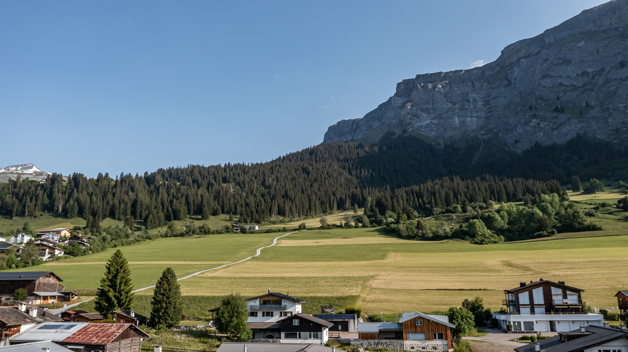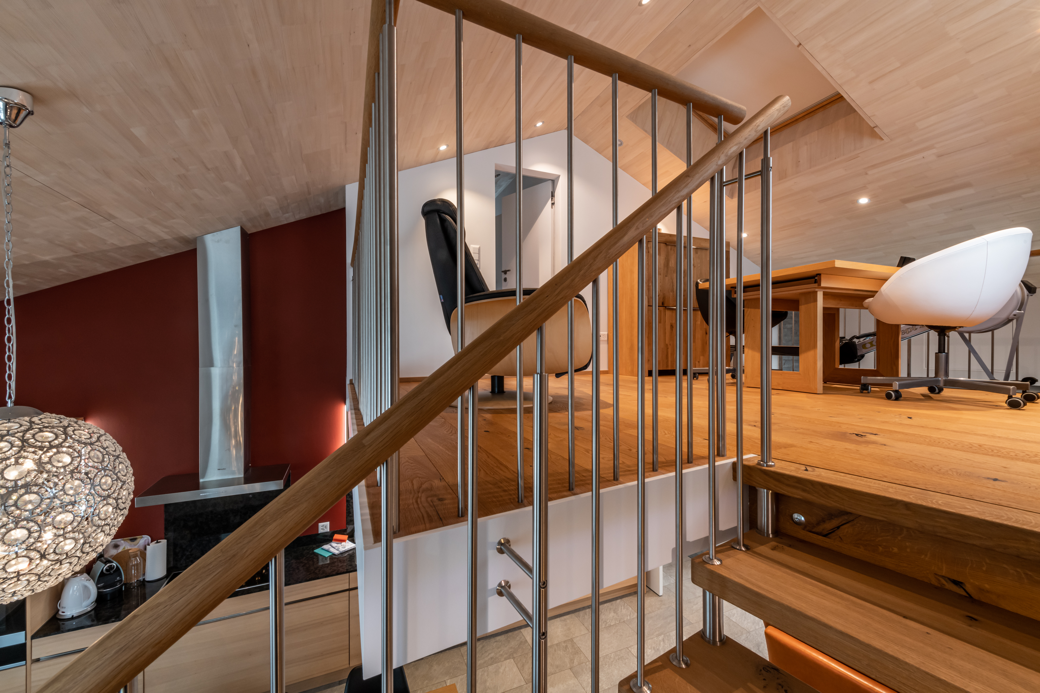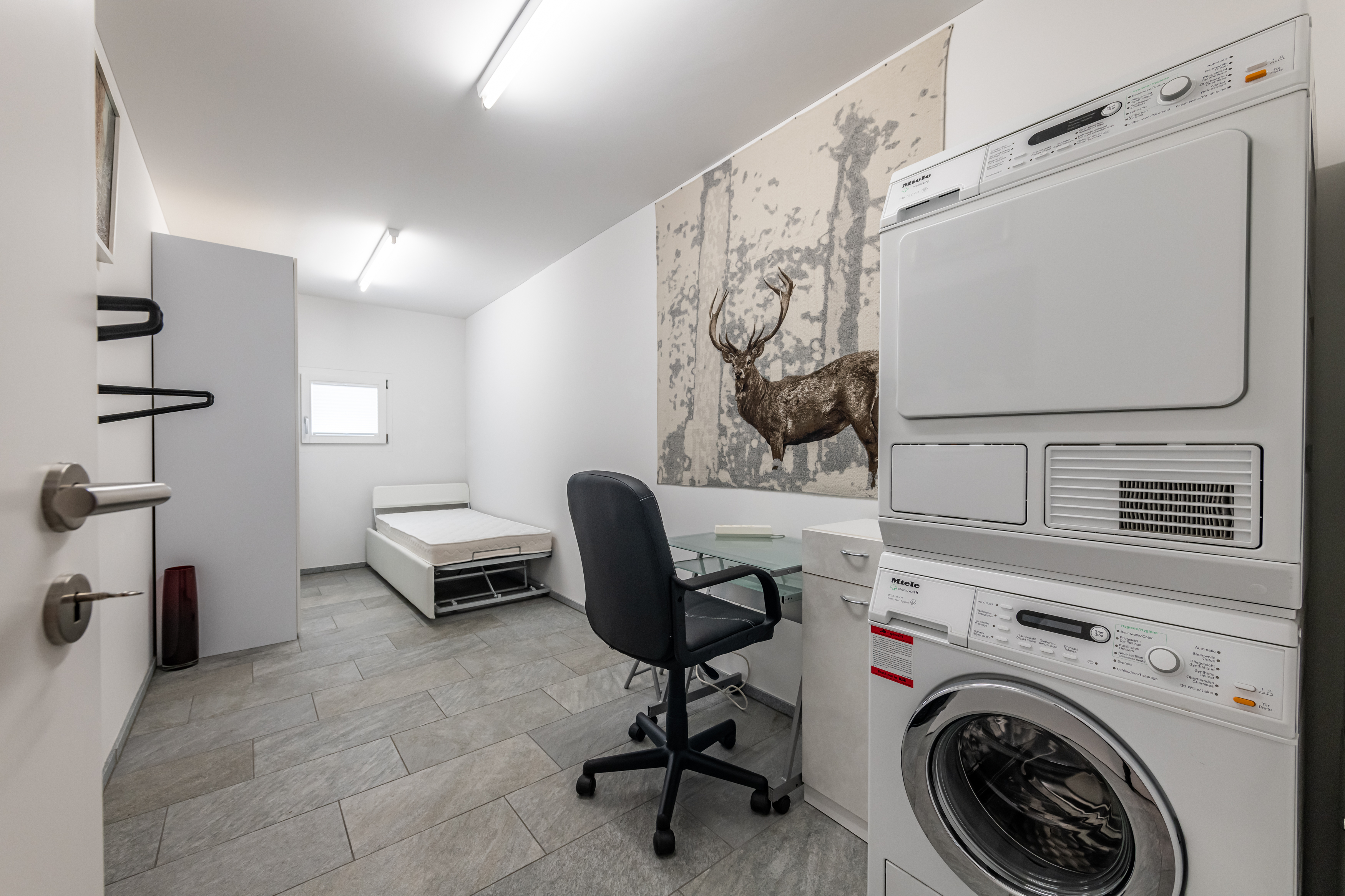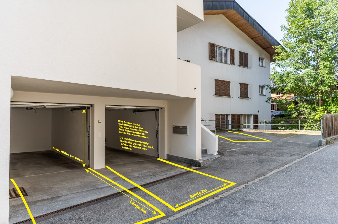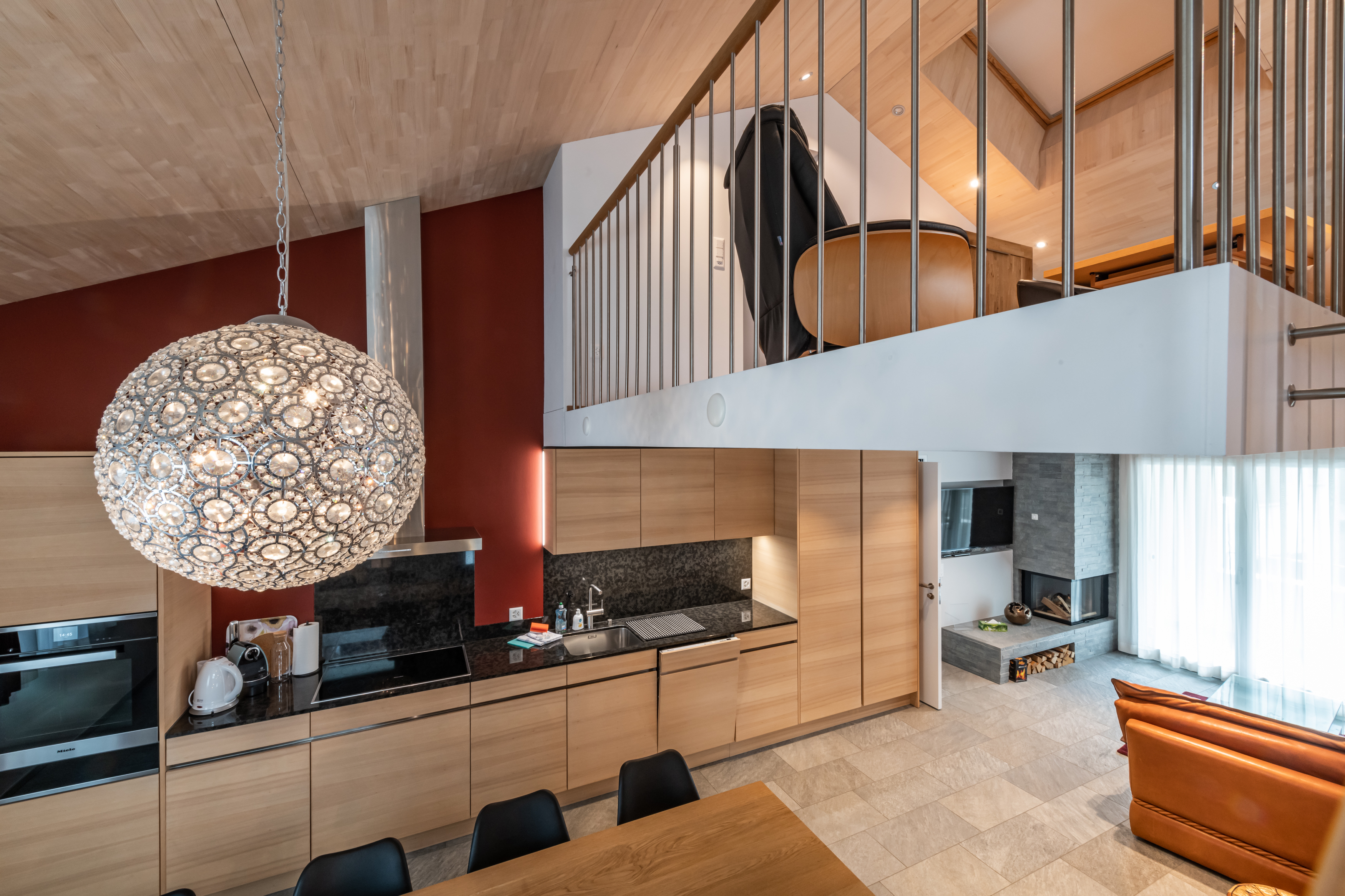 Die modern eingerichtete Wohnung bietet Platz für 6 Personen. Die geräumige Küche mit Wohnzimmer und Balkon, lädt für gesellige Abende drinnen, wie draussen ein. Nebst dem grossen Esstisch und dem gemütlichen Sofa, bringt das heimelige Cheminée eine entspannte Atmosphäre in den Raum. Im Erdgeschoss gibt es ein Kinderzimmer mit einem Kajüten- bzw. Wandbett und einem Sofabett. Im Zimmer daneben befindet sich ein Extrabett für eine Einzelperson, wobei sich im selben Raum auch die Waschmaschine und der Trockner befindet. Ebenfalls können dort Skis und Snowboards gelagert werden. Wichtig: Bei diesem Bett handelt es sich um ein Extrabett und die Person, die dort schläft, ist sich bewusst, dass dieses Zimmer nicht den gleichen Standard wie die weiteren Schlafräume aufweisen kann, da dort womöglich Skis und Snowboards aufbewahrt werden und sich die Waschmaschine und der Trockner darin befinden. Alternativ können die Wintersportgeräte oder Bikes in der Garage aufbewahrt werden. Im Erdgeschoss gibt es eine Nasszelle mit Toilette und Dusche. Oberhalb der Küche und des Wohnraumes im ersten Stock, befindet sich eine Galerie mit Schreibtisch und TV. Dahinter folgt ein separates Zimmer mit weiterem Doppelbett und einem Badezimmer mit begehbarer Badewanne/Dusche und Toilette.