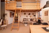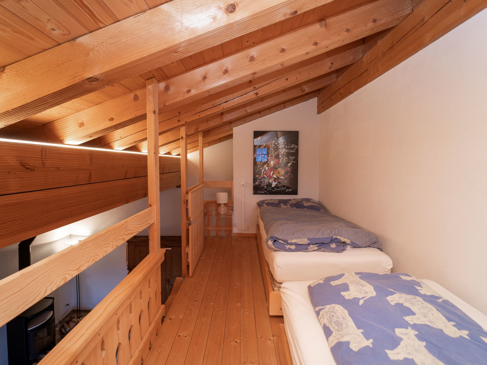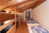 Ein Schlafzimmer mit Doppelbett und zwei Einzelbetten in der Galerie im Wohnzimmer