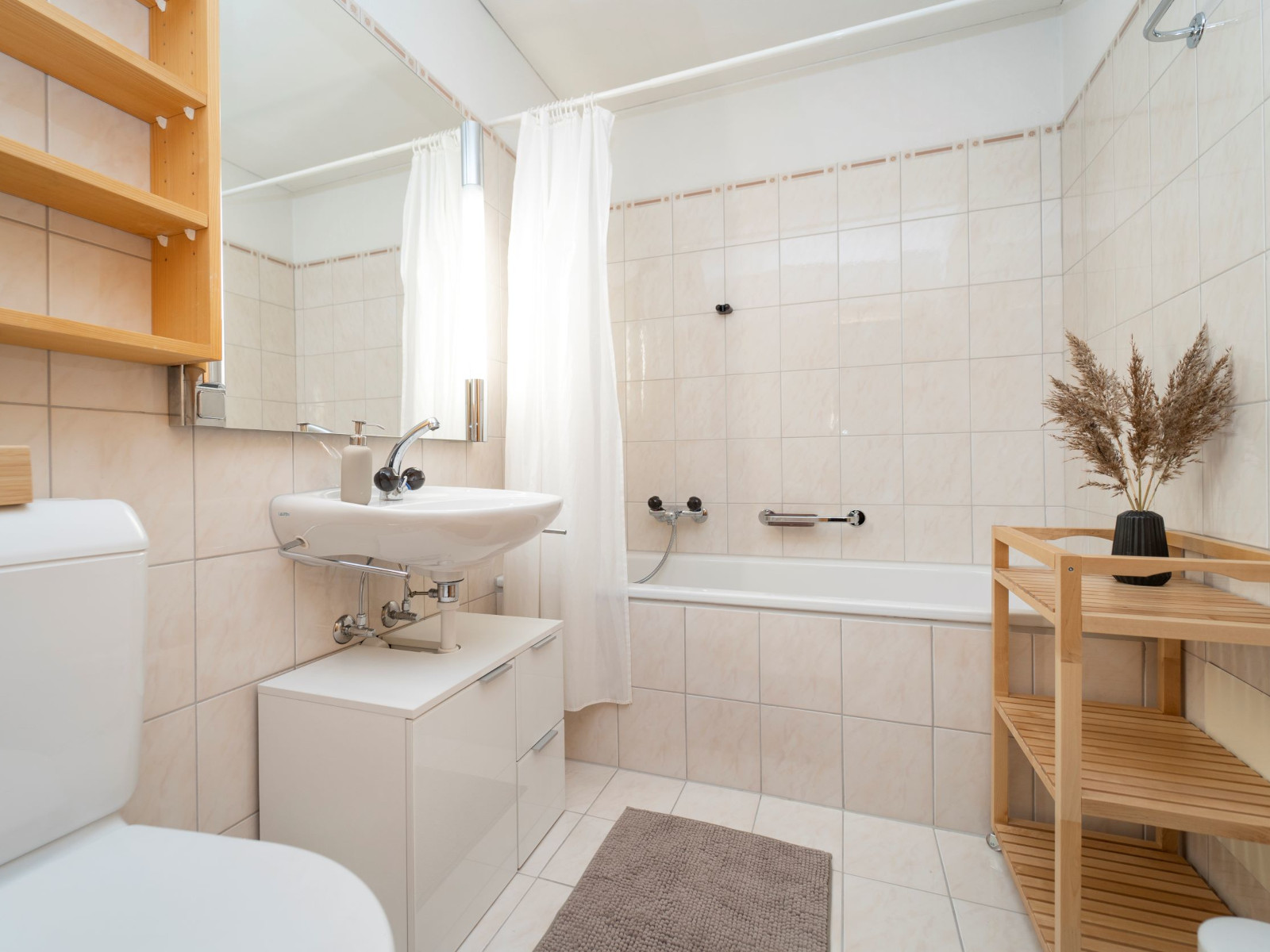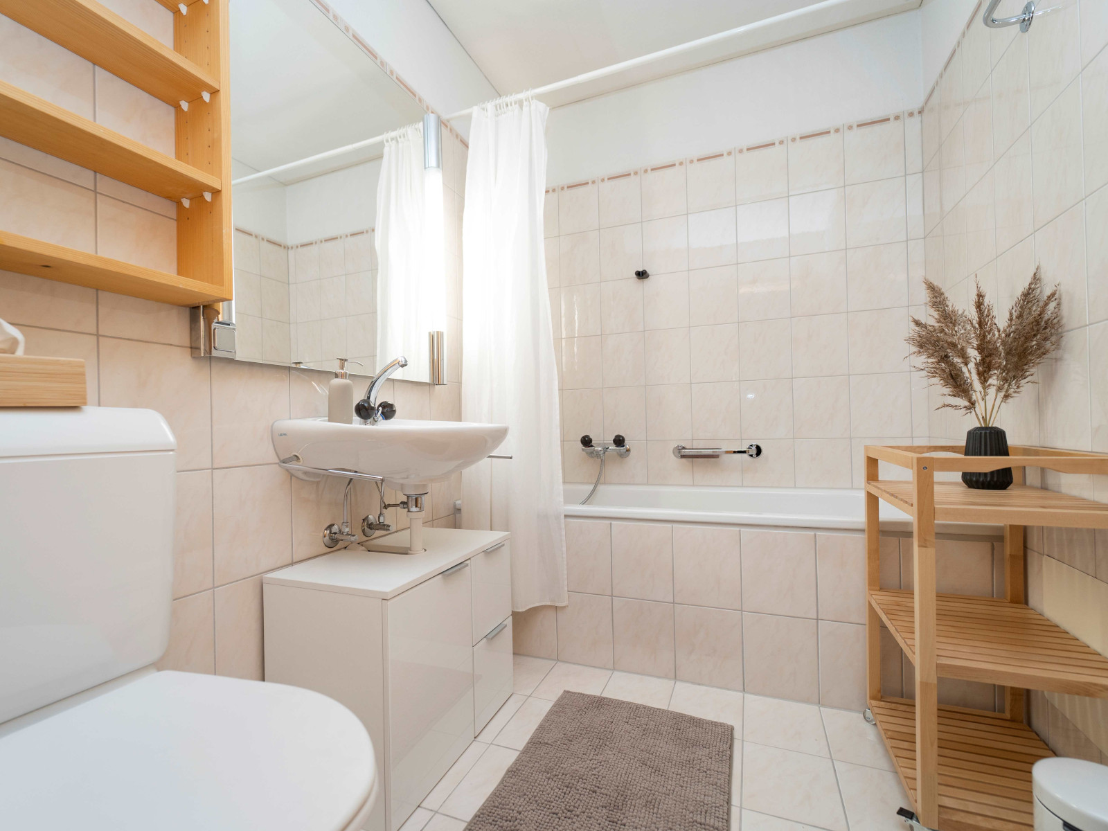 Badezimmer mit Badewanne, Dusche und WC und Föhn