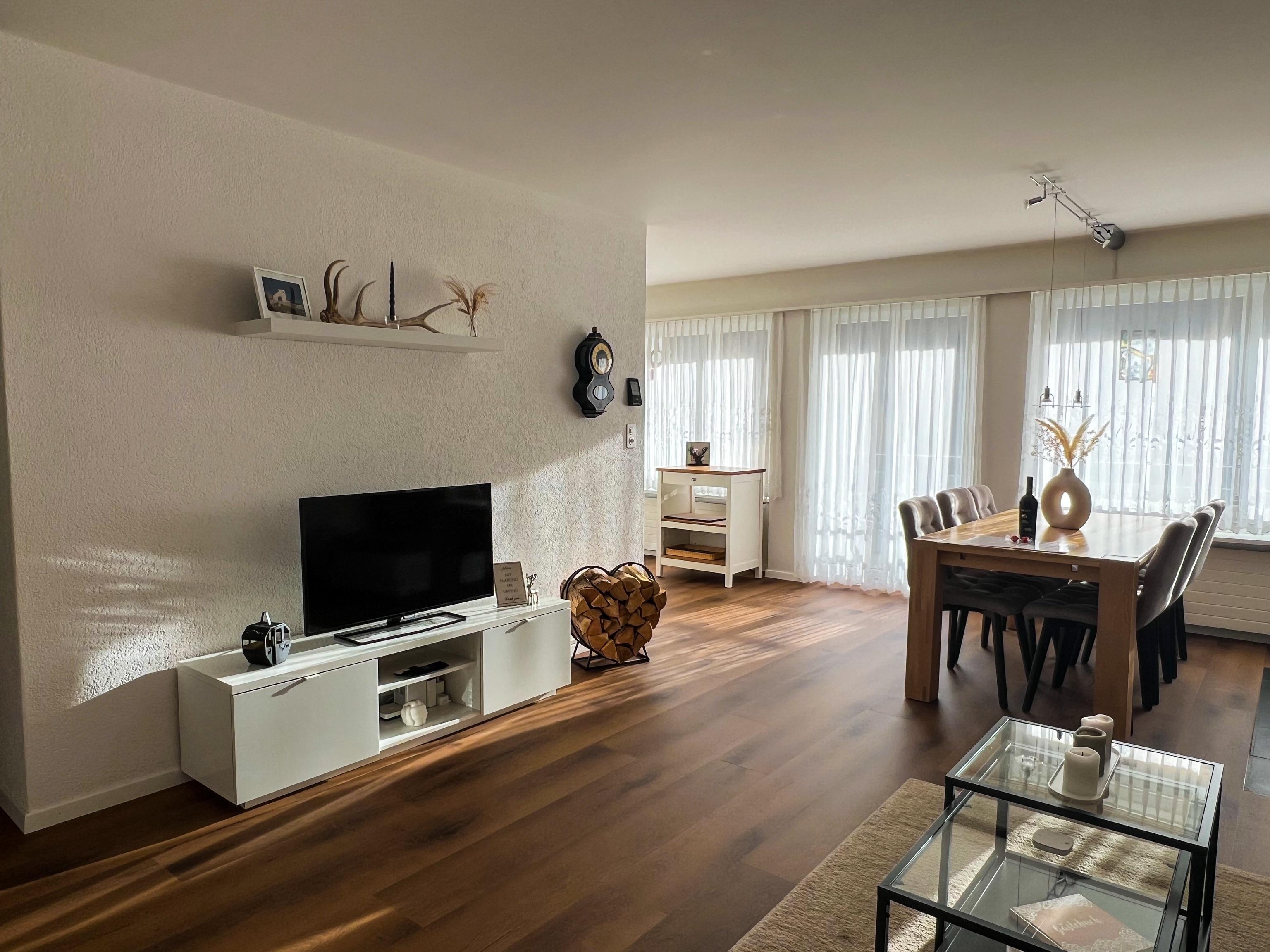 3 1/2-Zimmer-Wohnung im 1. Stock eines Mehrfamilienhauses, ca. 65 m2. 1 Schlafzimmer mit einem Doppelbett (180cm). 1 Schlafzimmer mit 3 Einzelbetten. Insgesamt 5 Schlafplätze. Bettwäsche, Frottéewäsche und Küchentücher vorhanden. Separate Küche mit Backofen/Steamer, Kühlschrank, Geschirrspülmaschine, Kaffeemaschine, Wasserkocher und Toaster. Racletteofen und Fondue-Caquelon. Dusche/WC. Haarföhn. Wohnzimmer. Cheminée. TV und Radio. WLAN. Netflix. Balkon. Garage. Skiraum. Garten zur Mitbenützung. Waschmaschine und Wäschetrockner im Haus. Haustiere nicht erlaubt. Nichtraucherwohnung. Kinderreisebett und Kinderhochstuhl Trip Trap auf Anfrage.