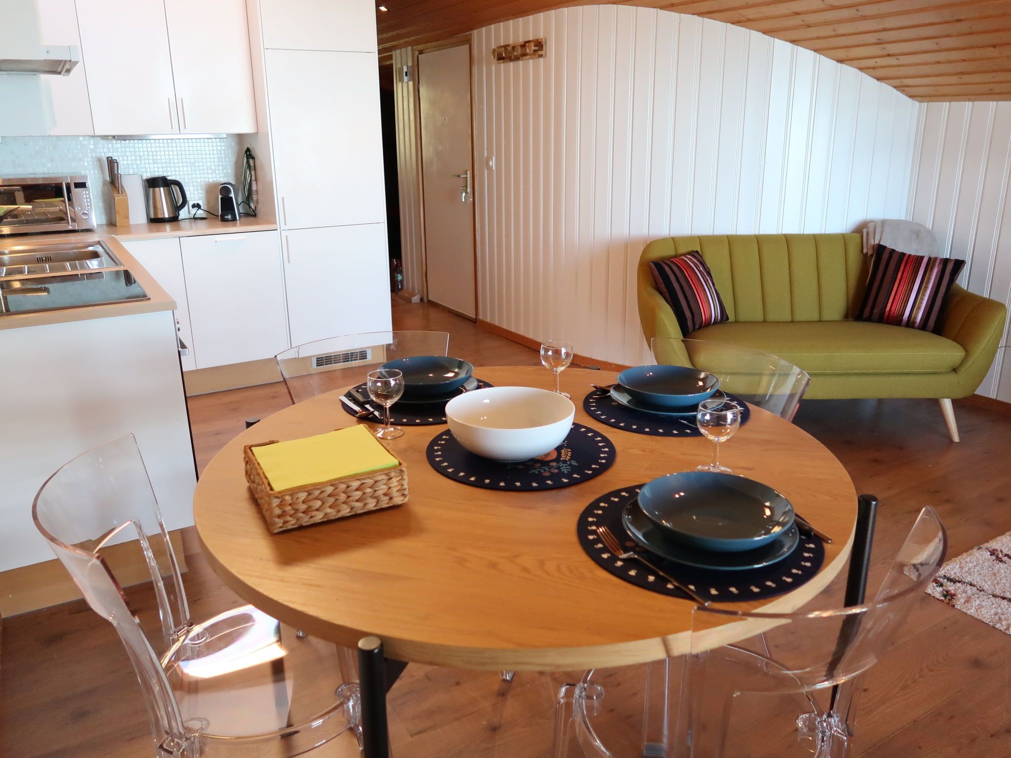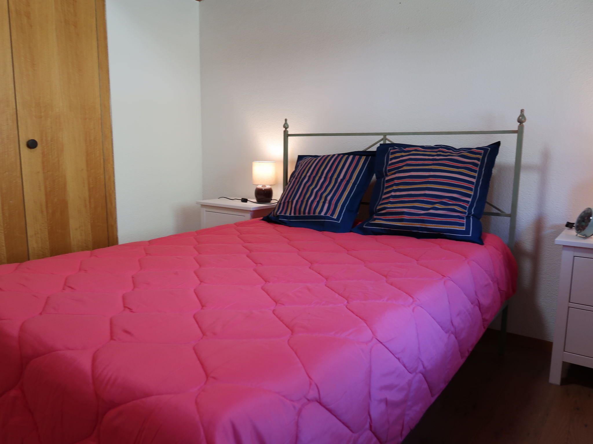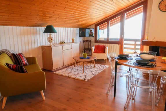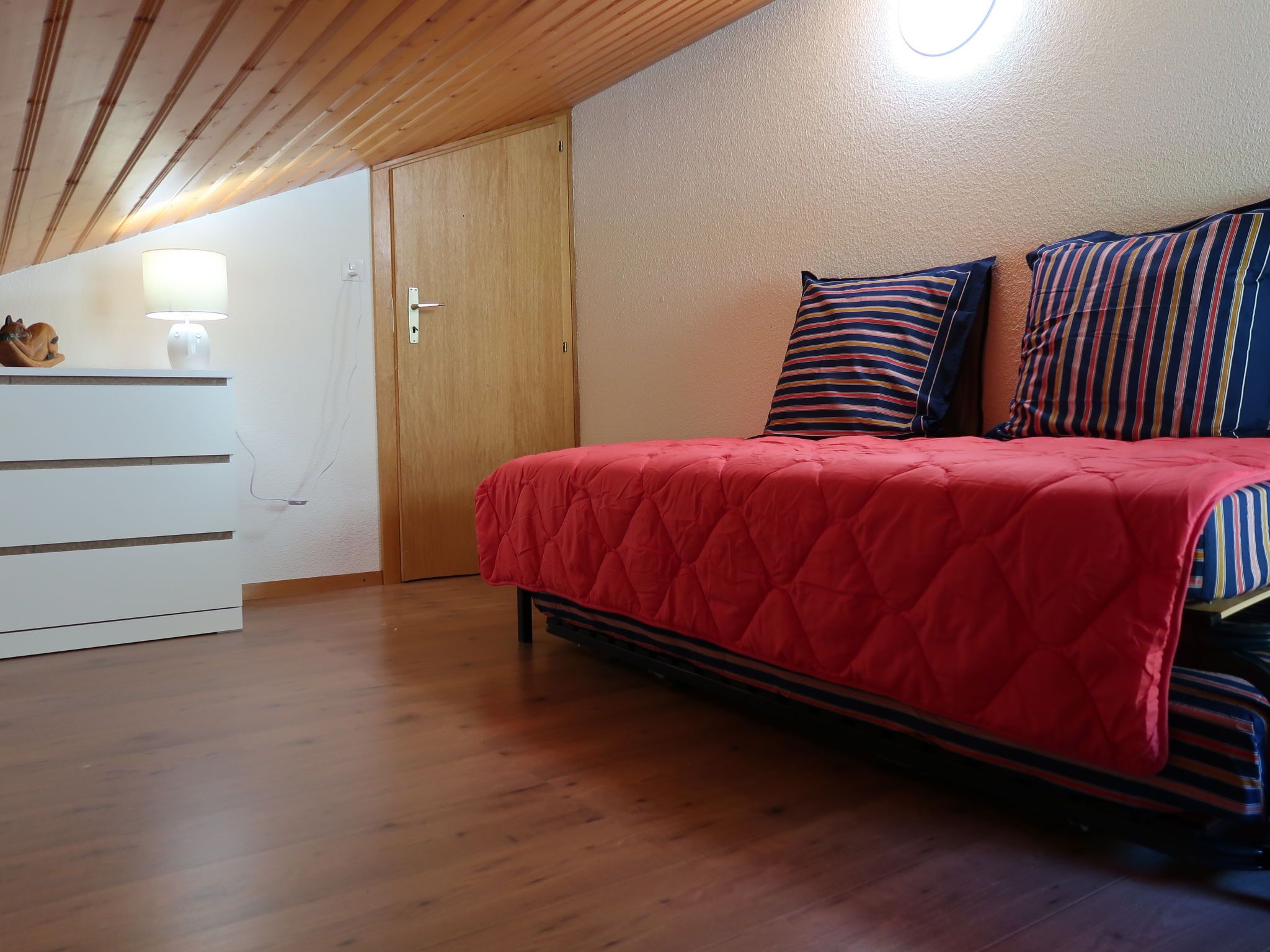 Cassiopée 26, 3-Zimmer-Attikawohnung 56 m2 im 3. Stock, Südlage. Objekt geeignet für 2 Erwachsene + 1 Kind. Hell, geschmackvoll und mit viel Holz eingerichtet: Wohn-/Esszimmer mit offenem Kamin (nur Deko), Essecke und TV. Ausgang zum Balkon. 1 Zimmer mit 1 Doppelbett (140 cm, Länge 200 cm). 1 abgeschrägtes kleines Kinderzimmer, Deckenhöhe 35 - 170 cm mit 1 Ausziehbett (2 Pers. 2 x 80 cm, Länge 200 cm). Offene Küche (Geschirrspüler, 4 Glaskeramikplatten, Toaster, Wasserkocher, Mikrowelle, Tiefkühler, elektrische Kaffeemaschine, Kapseln für die Kaffeemaschine (Nespresso), Racletteofen, Fondue Set (Käse)). Bad, sep. WC. G-Heizung. Balkon 8 m2, Südlage. Herrliche Sicht auf die Berge und das Tal. Zur Verfügung: Haartrockner. Internet (Wireless LAN, gratis). Bitte beachten: Nichtraucher-Unterkunft.