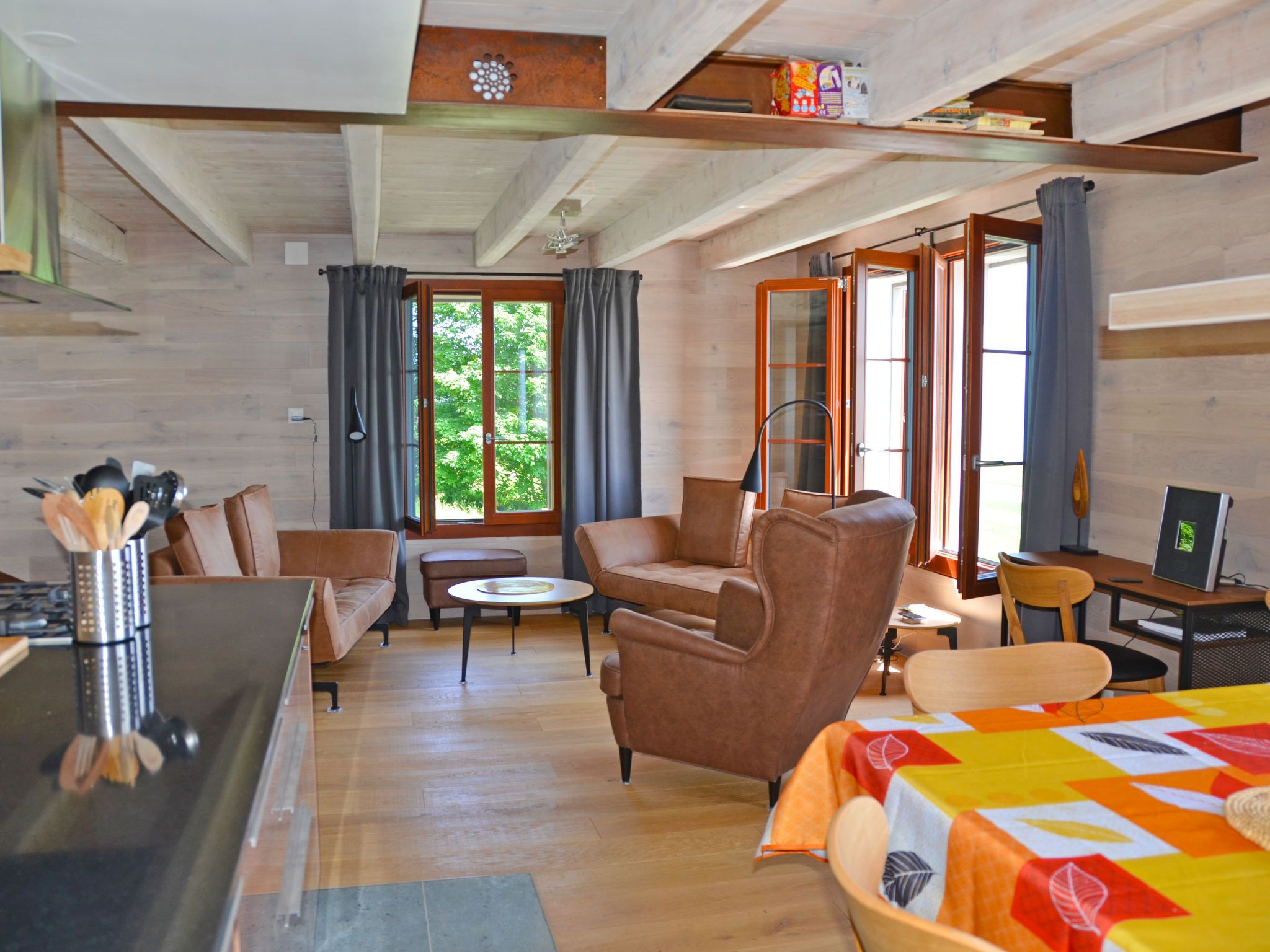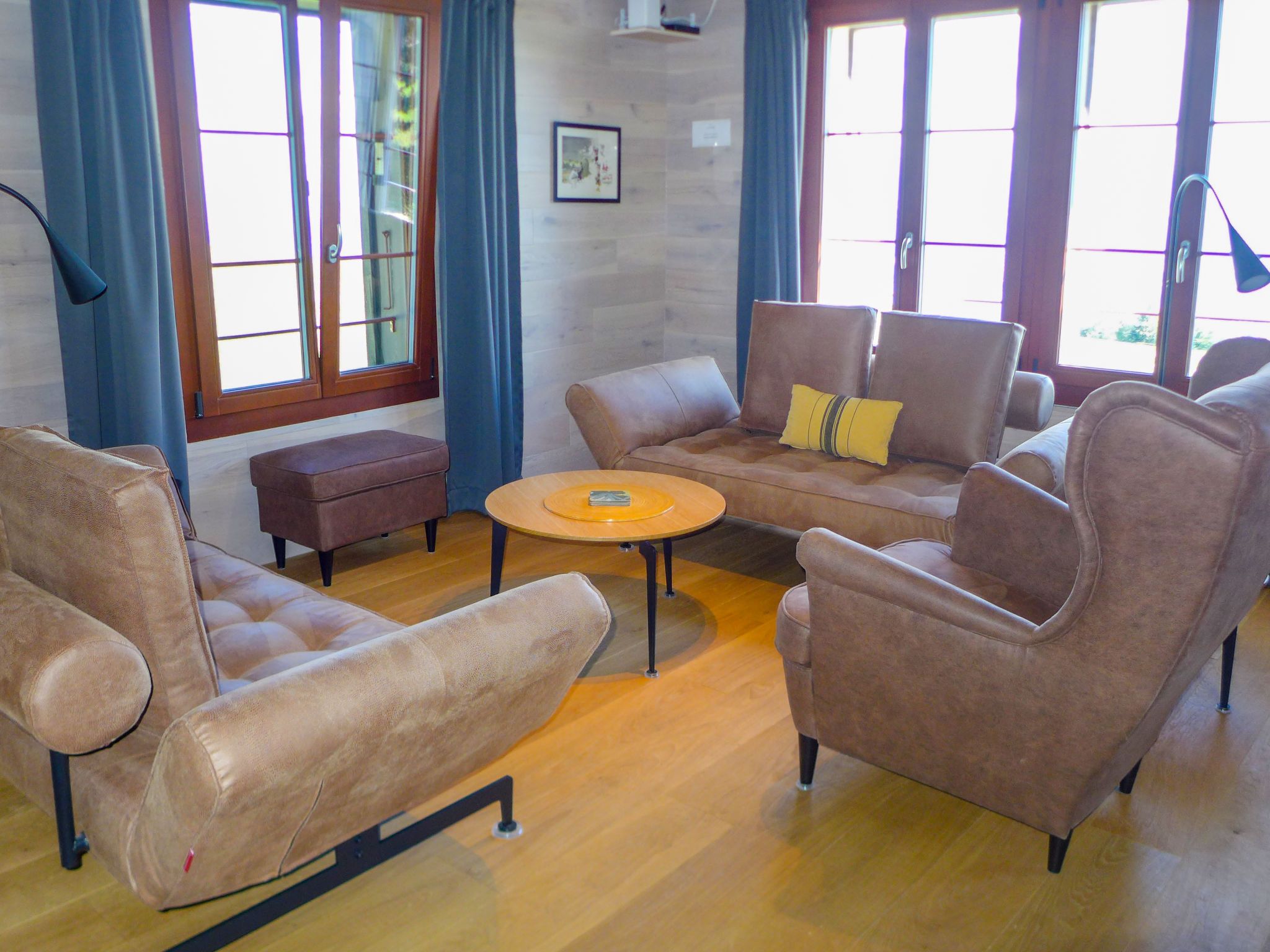 4-Zimmer-Chalet 100 m2 auf 2 Stockwerken. Komfortabel und geschmackvoll eingerichtet: Wohn-/Esszimmer mit Stereoanlage. 1 Zimmer mit 1 Doppelbett (160 cm, Länge 200 cm). Offene Küche (4 Kochplatten, Backofen, Geschirrspüler, Toaster, Wasserkocher, Mikrowelle, elektrische Kaffeemaschine, Racletteofen, Fondue Set (Käse)). Dusche/WC. Bodenheizung. Obergeschoss: 1 Zimmer mit 1 Doppelbett (140 cm, Länge 200 cm). 1 Zimmer mit 2 Betten (90 cm, Länge 200 cm). Dusche/WC. Terrassenmöbel. Herrliche Panoramasicht auf den See, die Berge und die Landschaft. Zur Verfügung: Waschmaschine. Internet (Wireless LAN, gratis). Parkplatz. Bitte beachten: Nichtraucher-Unterkunft. Maximal 1 Haustier/Hund erlaubt. Feuerlöscher. Im Winter ist der Weg zum Chalet für das Check-in frei. Während des Aufenthaltes ist der Kunde selber verantwortlich.