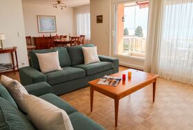 Montreux - Panorama, 4-Zimmer-Wohnung 129 m2 im 3. Stock. Geräumig und hell, einfach und zweckmässig eingerichtet: Wohn-/Esszimmer mit Esstisch und TV (Flachbildschirm). Ausgang zum Balkon. 1 Doppelzimmer mit 1 Doppelbett. Ausgang zum Garten. 1 Zimmer mit 1 Wandschrankbett. 1 Zimmer mit 1 Doppelbett (1 x 160 cm, Länge 200 cm). Offene Küche (Backofen, Geschirrspüler, 4 Glaskeramikplatten, Mikrowelle, Tiefkühler) mit kleinem Esstisch. Bad/Bidet/WC, 2 Duschen/WC. Grosser Balkon. Balkonmöbel. Sehr schöne Sicht auf den See, die Berge, die Landschaft und die Ortschaft. Zur Verfügung: Waschmaschine, Haartrockner. Internet (Wireless LAN, gratis). Garage, Höhe 190 cm, Breite 230 cm. Bitte beachten: Nichtraucher-Unterkunft. Maximal 1 Haustier/Hund erlaubt.