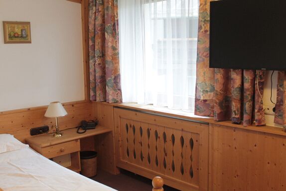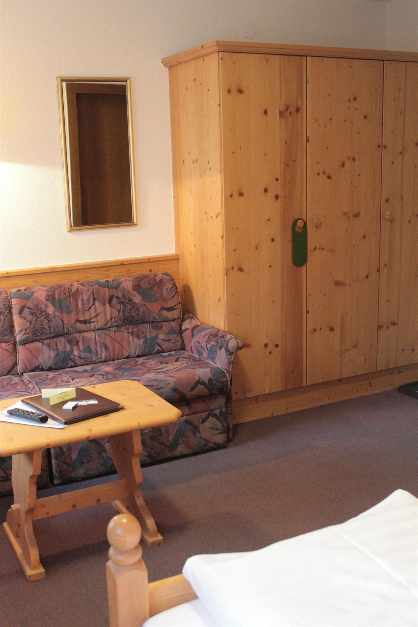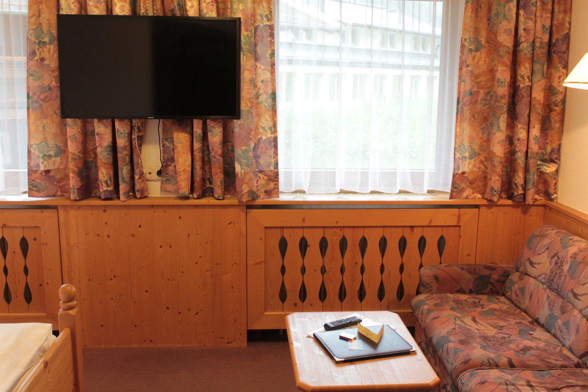 Einzelzimmer Superior mit Badezimmer mit Dusche/WC und Haarföhn, Sofa (Schlafmöglichkeit für eine 2. Person), Kabel-TV, Telefon, Safe und Wasserkocher und Gläser. Ohne Balkon. Größe ca. 16 m²