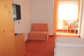 Doppelzimmer und Sofa und Balkon. Badezimmer mit Haarföhn, WC, Badewanne oder Dusche. Telefon, Kabel-TV, Safe und Wasserkocher und Gläser. Größe ca. 25 m²