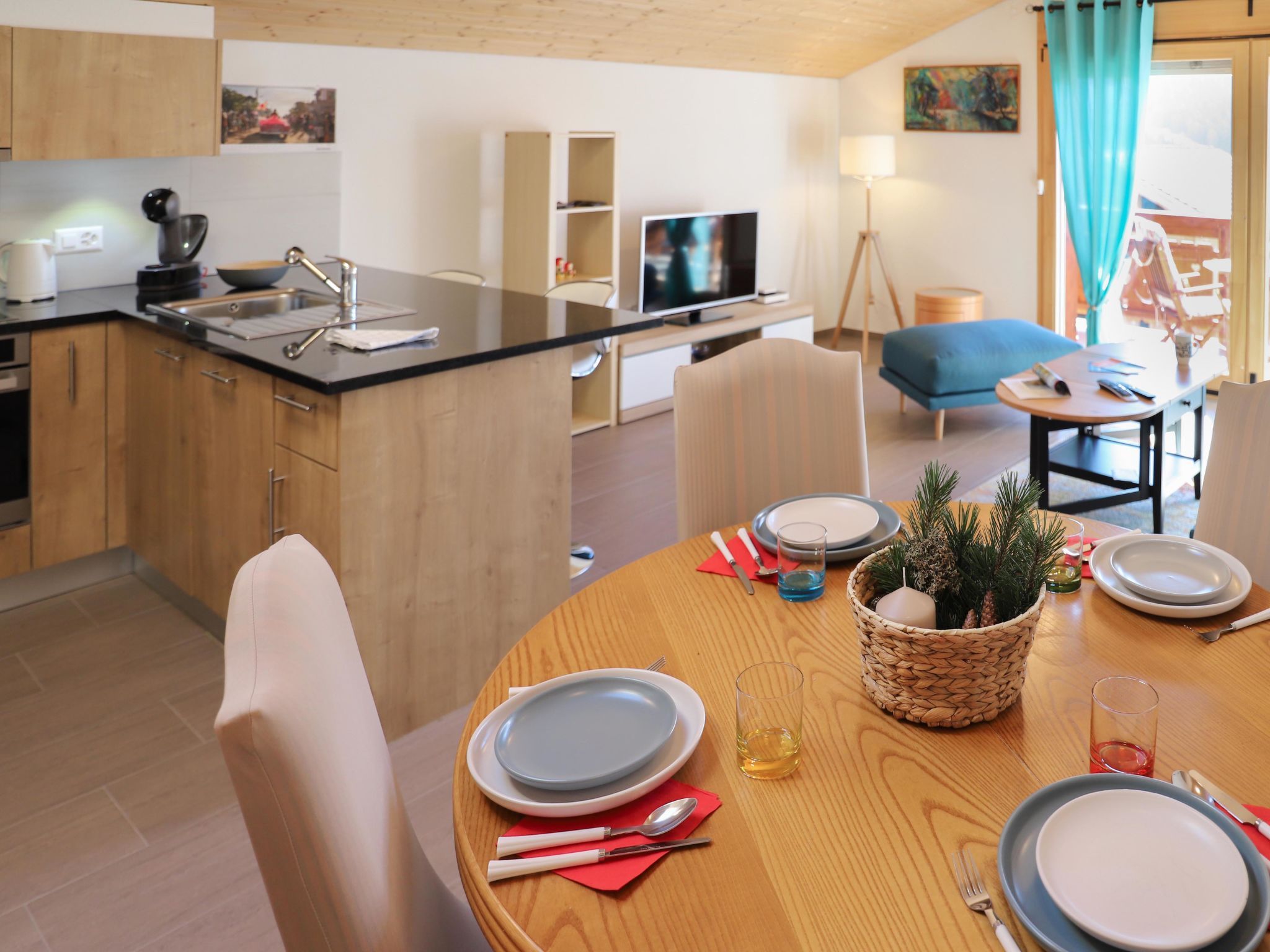 Les Savolaires 4, 2-Zimmer-Attikawohnung 56 m2 im 2. Stock, Südlage. Geräumig und hell, schön und modern eingerichtet: Wohn-/Esszimmer mit Esstisch und TV (Flachbildschirm). Ausgang zum Balkon, Richtung Süden. 1 Zimmer, ohne Schrank mit 1 franz. Bett (160 cm). Offene Küche (4 Kochplatten, Backofen, Geschirrspüler, 4 Glaskeramikplatten, Toaster, Wasserkocher, Mikrowelle, Tiefkühler, elektrische Kaffeemaschine, Kapseln für die Kaffeemaschine (Dolce Gusto) extra, Racletteofen, Fondue Set (Käse)) mit Bar. Bad/WC. Kleiner Balkon, Südlage. Balkonmöbel. Schöne Sicht auf die Berge. Zur Verfügung: Haartrockner. Internet (Wireless LAN, gratis). Bitte beachten: Nichtraucher-Unterkunft, kein Parkplatz.