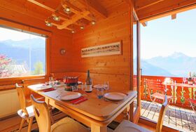 Chalet Zan-Fleuron, 5-Zimmer-Chalet 150 m2 auf 3 Stockwerken, Südlage. Komfortabel und schön eingerichtet: grosses Wohn-/Esszimmer mit offenem Kamin, Esstisch und TV (Flachbildschirm), CD und DVD. Ausgang zum Balkon, Richtung Süden und Richtung Westen. Offene Küche (Backofen, Geschirrspüler, 4 Glaskeramikplatten, Mikrowelle, elektrische Kaffeemaschine, Kapseln für die Kaffeemaschine (Nespresso) extra, Racletteofen, Fondue Set (Käse)). Sep. WC. E-Heizung. Unteres Geschoss: grosses Wohn-/Schlafzimmer mit 1 Ausziehbett (2 x 90 cm), Stereoanlage. Ausgang zur Terrasse, Richtung Süden. Dusche/WC. E-Heizung. Obergeschoss: 1 Zimmer mit 2 Betten (90 cm). Ausgang zum Balkon, Richtung Süden. 1 Zimmer mit 1 Doppelbett (2 x 90 cm). Ausgang zum Balkon, Richtung Süden. 1 kleines Zimmer 8 m2, ohne Schrank mit 2 Betten (90 cm). Bad/WC. E-Heizung. Grosser Balkon 15 m2, Südlage und Westlage, kleiner Balkon 5 m2, Südlage, grosse Terrasse 25 m2. Terrassenmöbel. Sehr schöne Panoramasicht auf die Berge und das Tal. Zur Verfügung: Waschmaschine, Wäschetrockner. Internet (Wireless LAN, gratis). Parkplatz (überdacht). Bitte beachten: Nichtraucher-Haus.