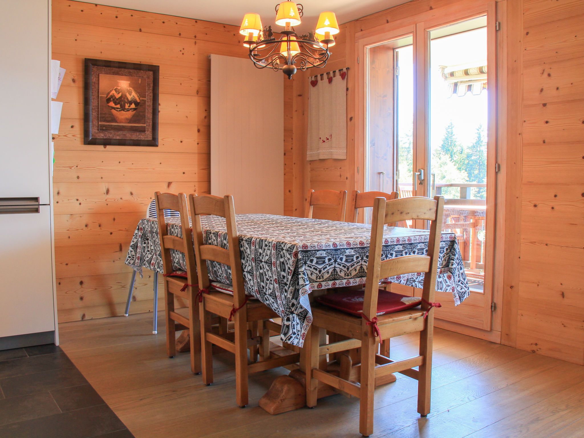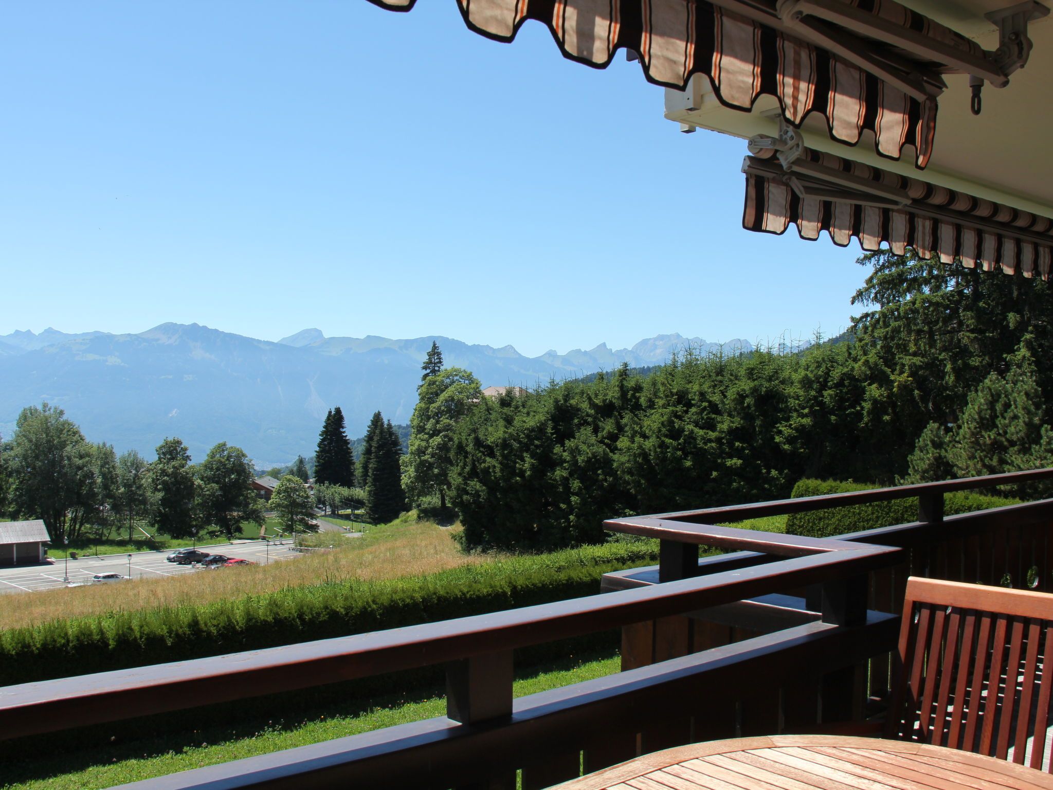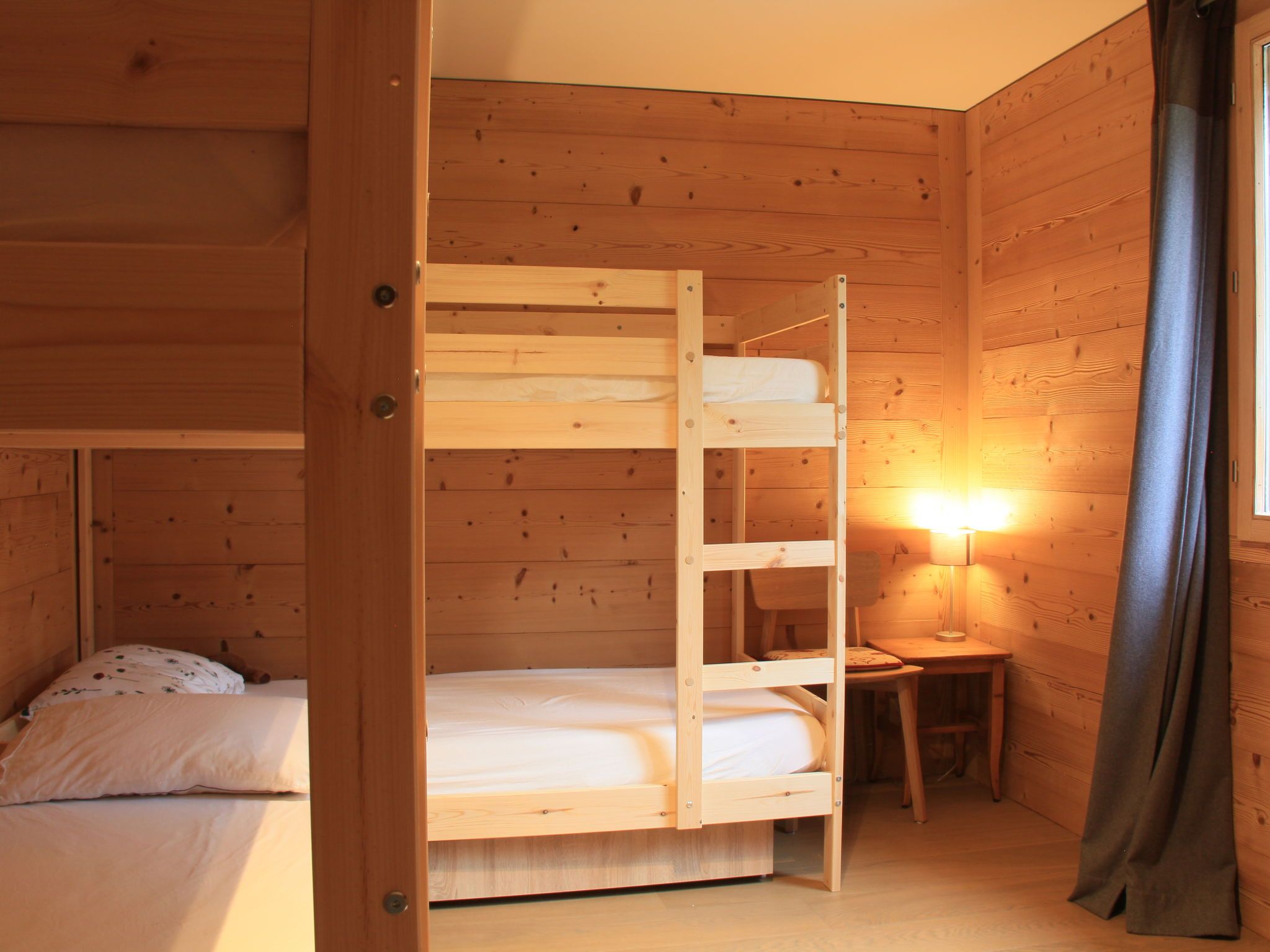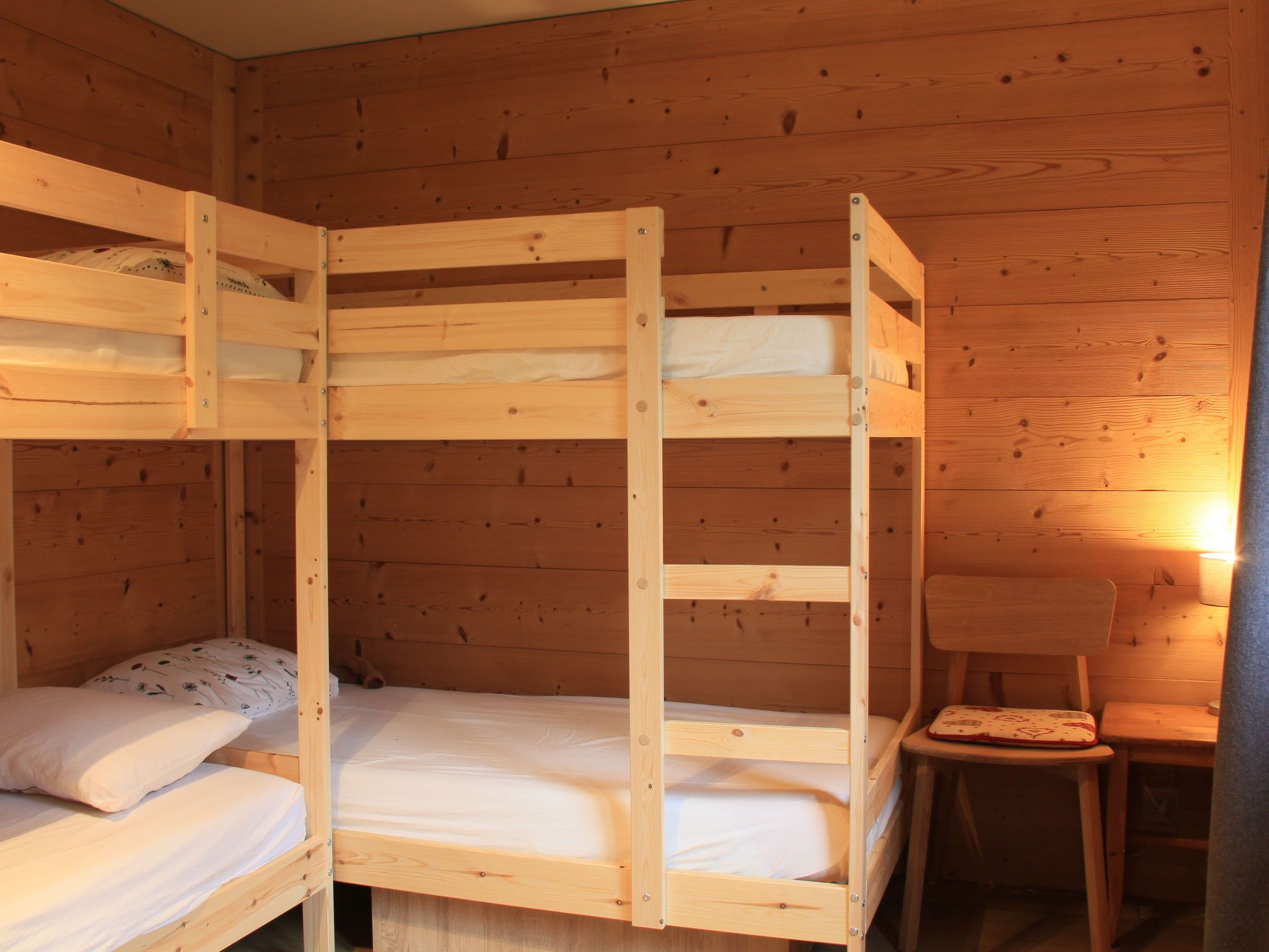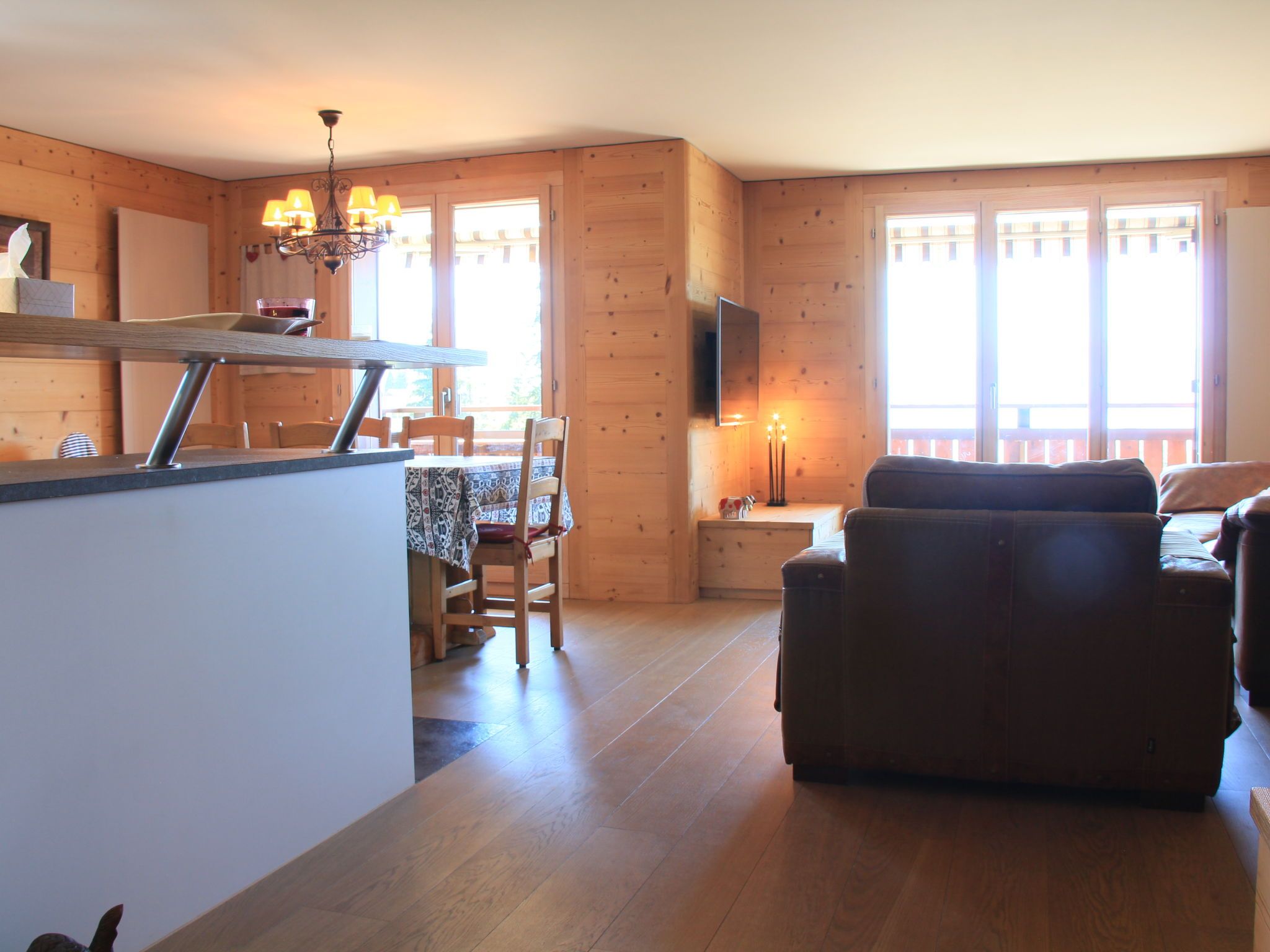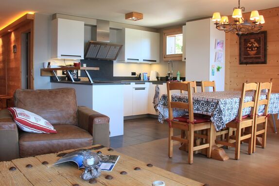 Sunset A 4, 3-Zimmer-Wohnung 76 m2 im 1. Stock, Südwestlage. Renoviert, komfortabel und geschmackvoll eingerichtet: Wohn-/Esszimmer mit offenem Kamin, Esstisch und TV (Flachbildschirm). Ausgang zum Balkon, Richtung Südwesten. 1 Zimmer mit 1 Doppelbett (2 x 90 cm), Bad/WC und TV (Flachbildschirm). 1 Zimmer mit 1 x 2 Etagenbetten (90 cm), TV (Flachbildschirm). Offene Küche (Backofen, Geschirrspüler, 4 Induktionskochplatten, elektrische Kaffeemaschine, Kapseln für die Kaffeemaschine (La Semeuse) extra, Racletteofen, Fondue Set (Käse)). Dusche/WC. Balkon 11 m2, Südwestlage. Balkonmöbel. Sehr schöne Sicht auf die Berge. Garage Nr. 15 (1 Auto). Bitte beachten: Nichtraucher-Unterkunft.