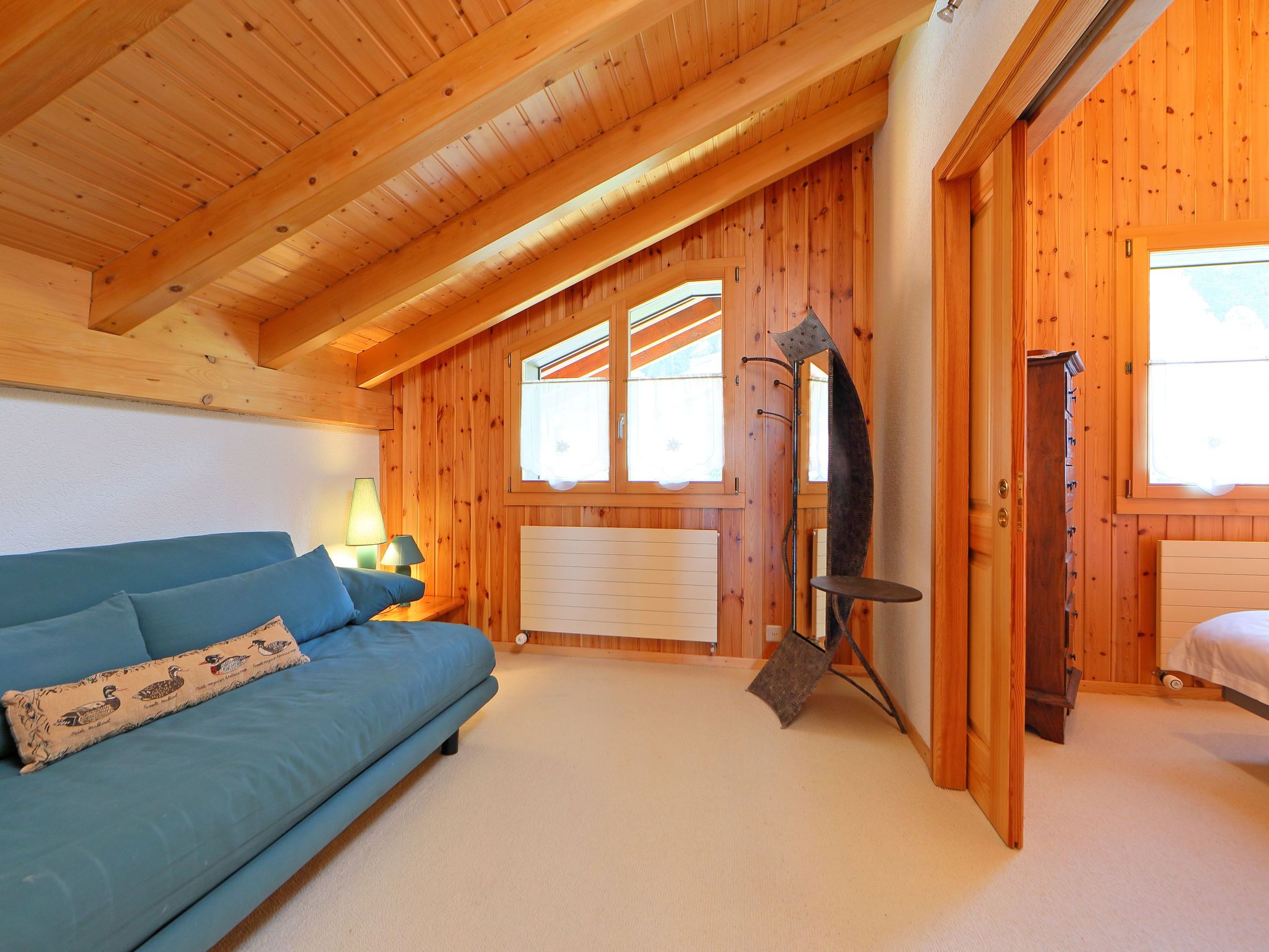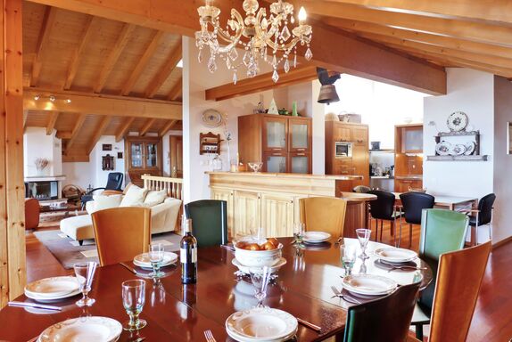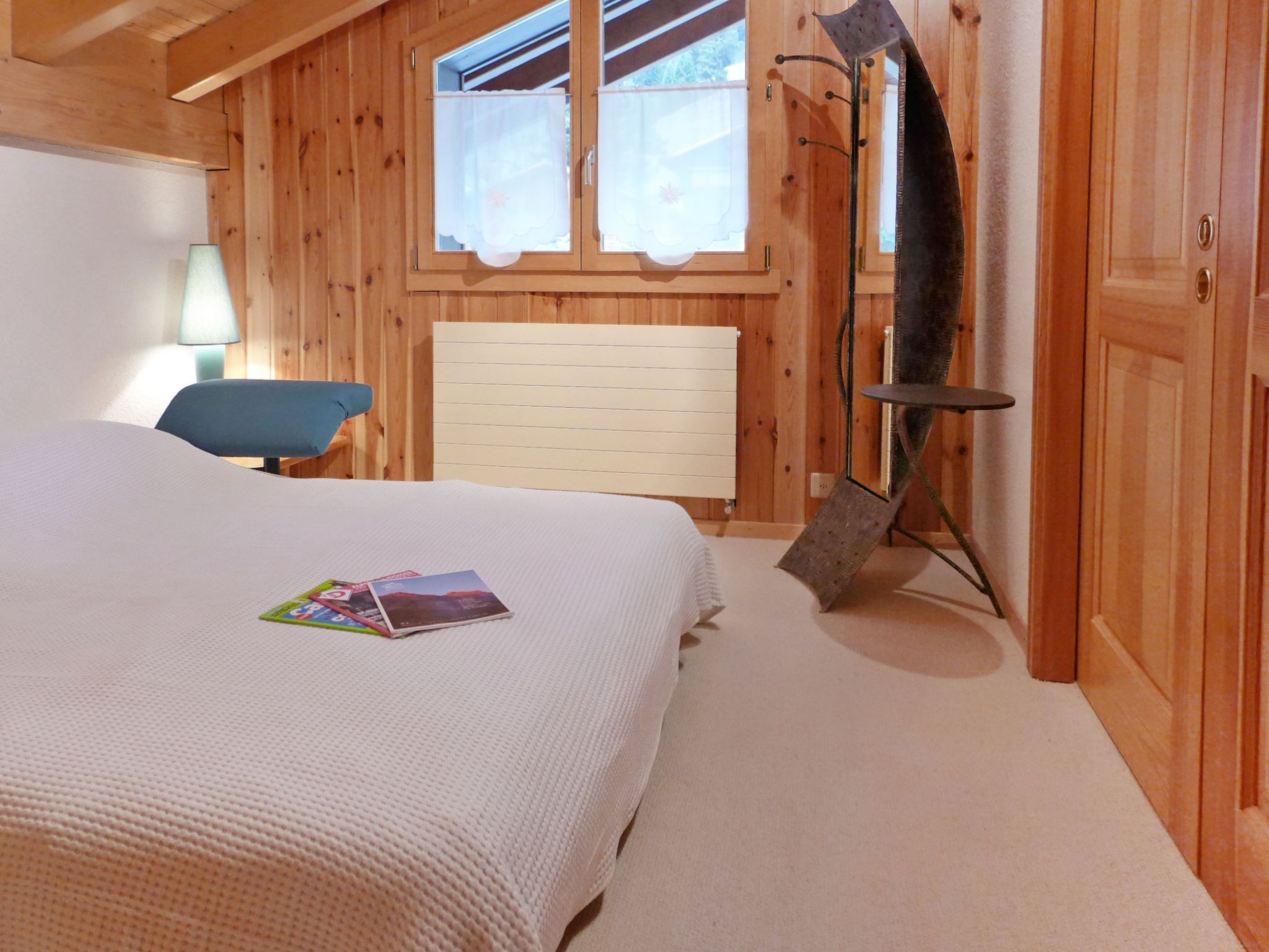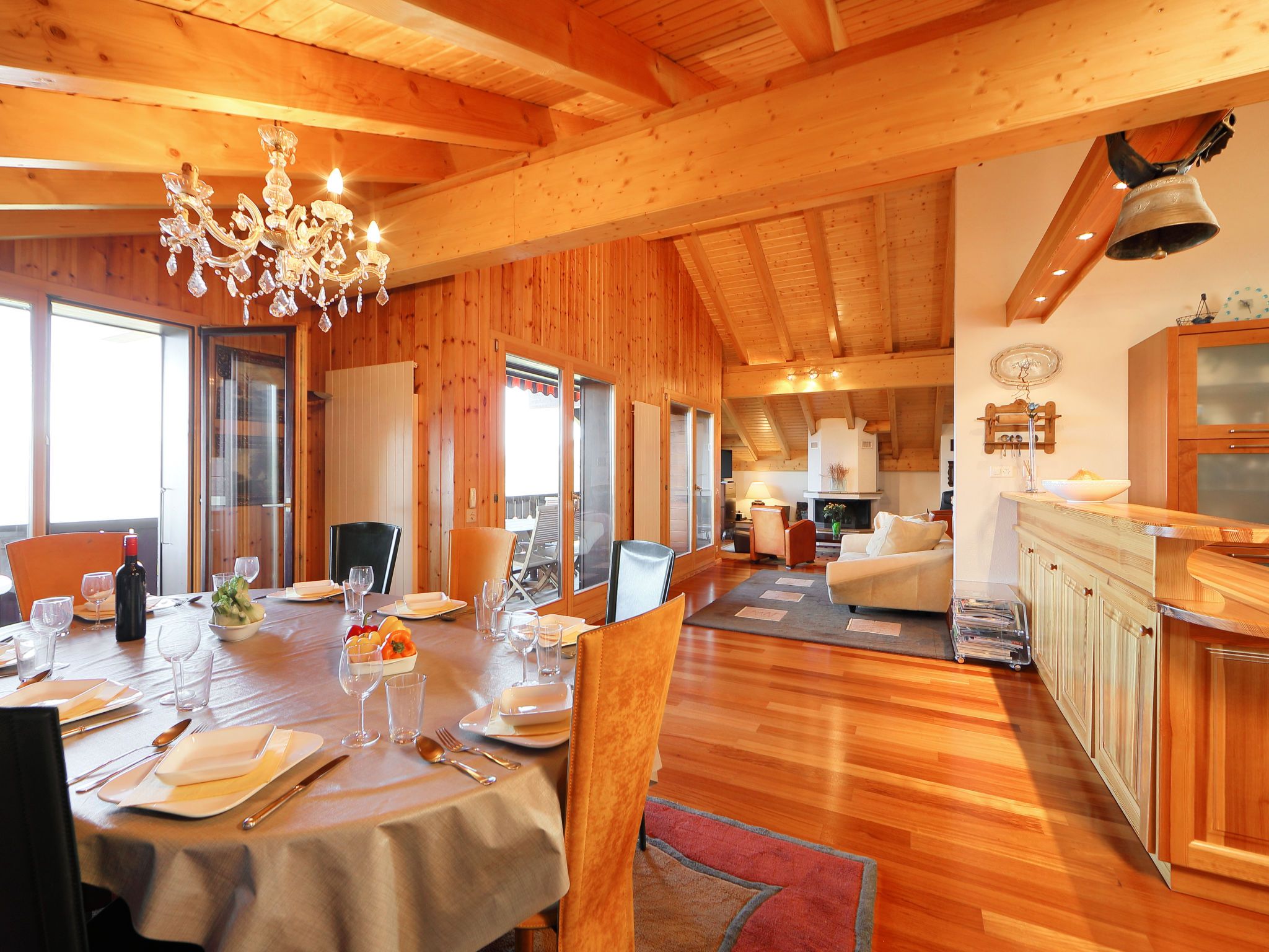 Sunset B 11, 8-Zimmer-Attikawohnung 240 m2 auf 2 Stockwerken im 5. Stock, Südlage. Geräumig, abgeschrägt, sehr komfortabel und geschmackvoll eingerichtet: abgeschrägtes grosses Wohn-/Esszimmer, Deckenhöhe 210 - 500 cm mit Panoramafenster mit offenem Kamin, Esstisch und TV (Flachbildschirm). Ausgang zum Balkon, Richtung Süden. 1 Zimmer mit 2 Betten (90 cm, Länge 200 cm), Bad/WC. 1 Zimmer mit 1 Diwanbett (150 cm). Salon mit TV (Flachbildschirm), DVD. Grosse, offene Küche (Backofen, Geschirrspüler, 4 Glaskeramikplatten, Toaster, Mikrowelle, Tiefkühler, elektrische Kaffeemaschine, Kapseln für die Kaffeemaschine (Nespresso) extra, Racletteofen, Fondue Set (Käse)). Sep. WC. Unteres Geschoss: 1 Zimmer mit 2 Betten (90 cm, Länge 200 cm), Bad/Dusche/WC. Ausgang zum Balkon, Richtung Süden. 1 Zimmer mit 1 franz. Bett (1 x 160 cm, Länge 200 cm). 1 Zimmer mit 2 Betten (90 cm, Länge 200 cm). Bad/WC, Dusche/WC. 2 grosse Balkone, Südlage. Balkonmöbel, Gartengrill. Sehr schöne Panoramasicht auf die Berge. Zur Verfügung: Waschmaschine. Internet (Wireless LAN, gratis). Garage Nr. 11 (2 Autos). Bitte beachten: Nichtraucher-Unterkunft. Raclettegerät : halber Laib Käse.