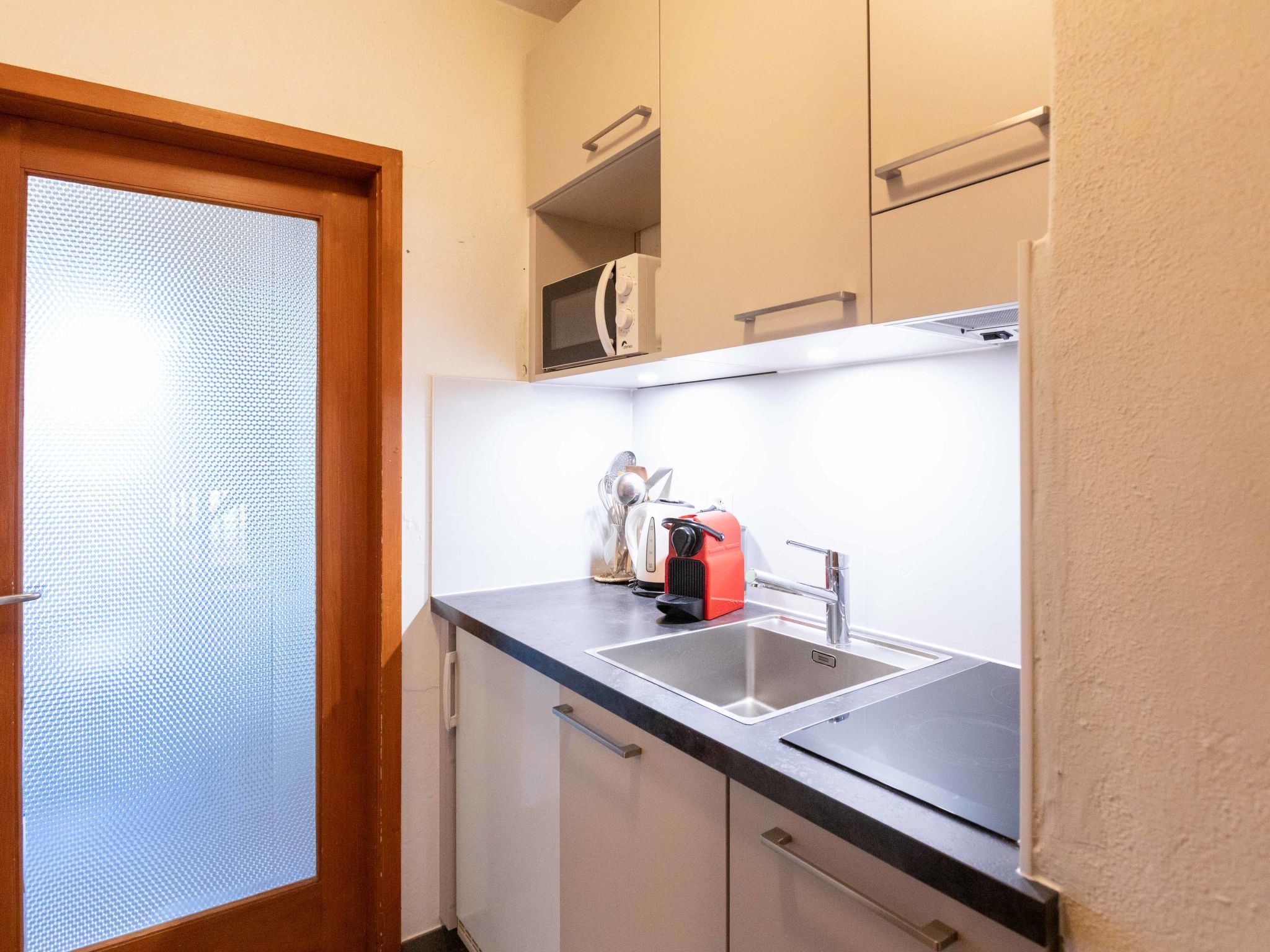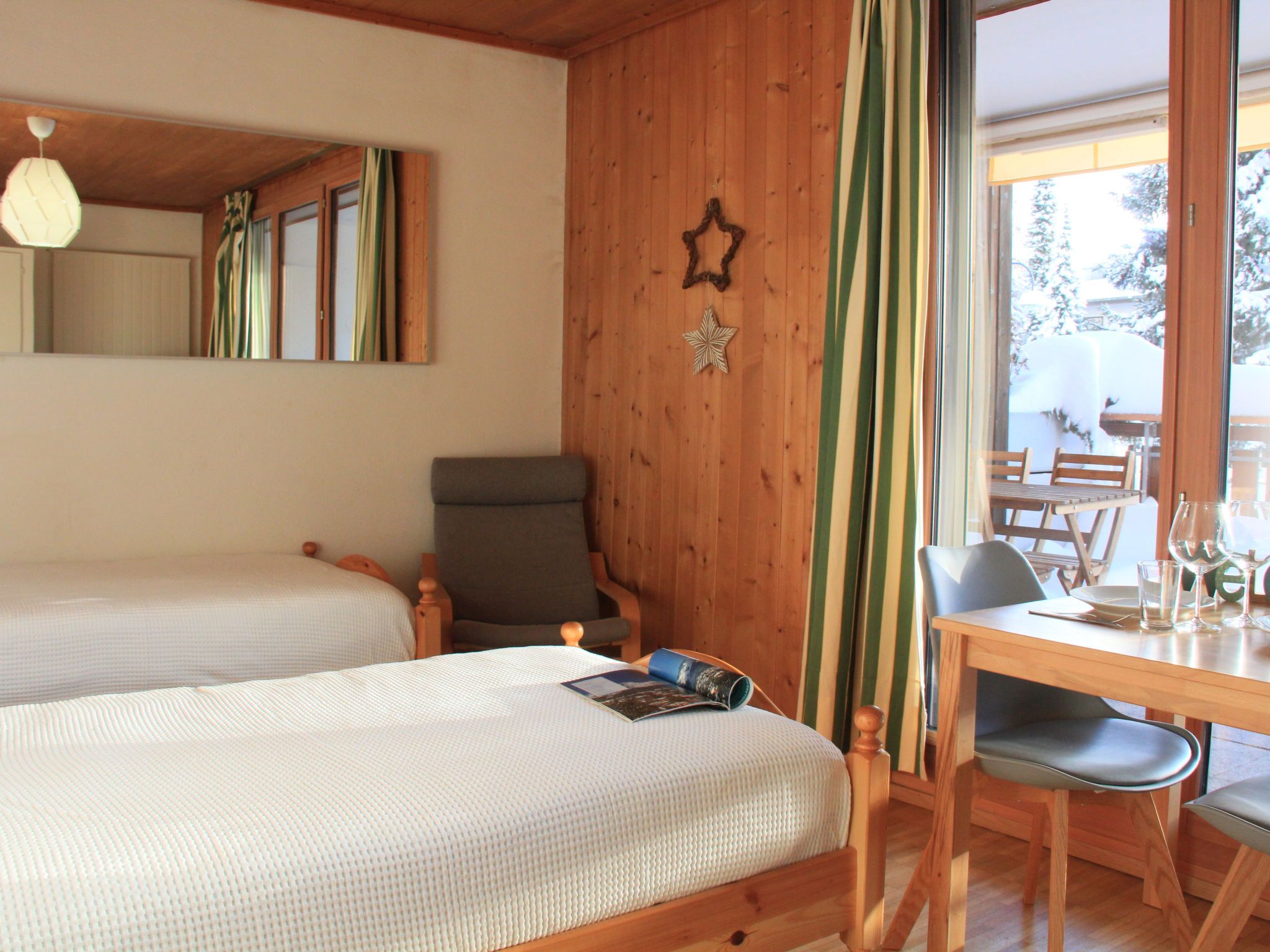 La Bercière 7, 1-Zimmer-Studio 22 m2, im Erdgeschoss, Südlage. Zweckmässig eingerichtet: Wohn-/Schlafzimmer mit Panoramafenster mit 2 Betten (90 cm), Esstisch und TV (Flachbildschirm). Ausgang zur Terrasse. Küche im Eingang (2 Kochplatten, Toaster, Wasserkocher, elektrische Kaffeemaschine, Kapseln für die Kaffeemaschine (nespresso) extra, Racletteofen). Bad/WC. Grosse Terrasse, Südlage. Liegestühle (2). Eingeschränkte Sicht auf die Landschaft. Zur Verfügung: Haartrockner. Internet (WLAN). Bitte beachten: Kühlschrank ohne Gefrierfach, Nichtraucher-Unterkunft. Maximal 1 Haustier/Hund erlaubt.