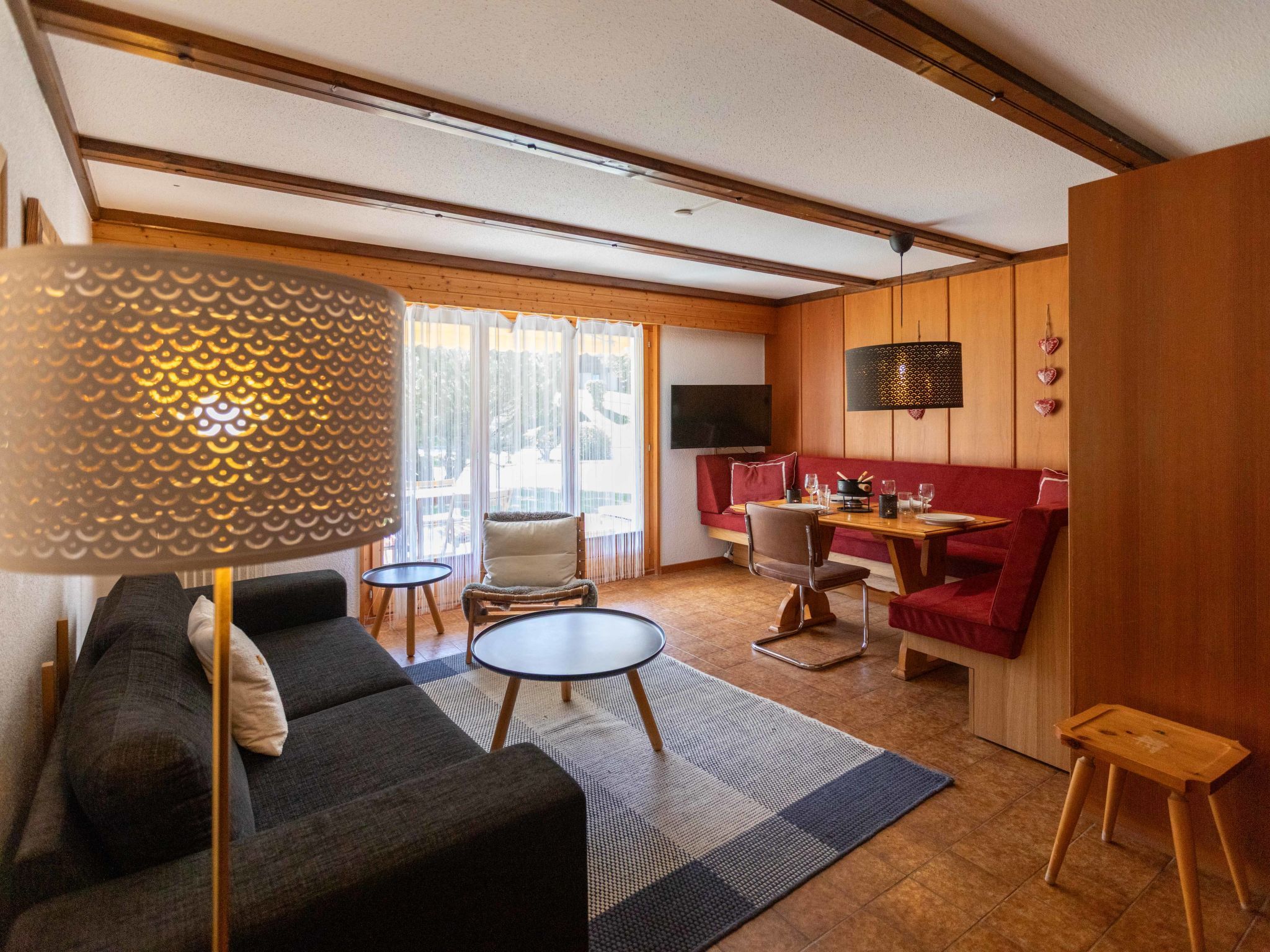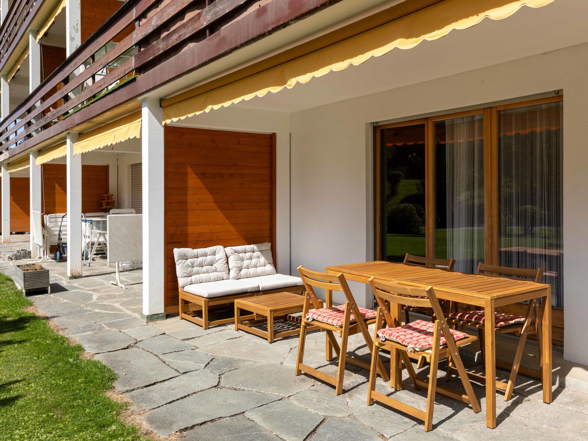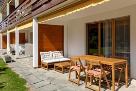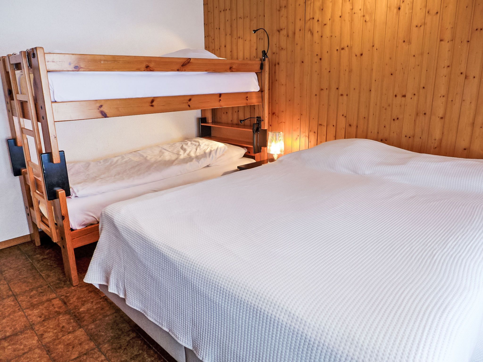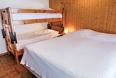Opale 4, 2-Zimmer-Wohnung 55 m2, im Erdgeschoss, Südlage. Teilweise renoviert im Jahre 2022, zweckmässig eingerichtet: Wohn-/Esszimmer 25 m2 mit Panoramafenster mit Essecke und Kabel-TV (Flachbildschirm). Ausgang zur Terrasse. 1 Zimmer mit 1 x 2 Etagenbetten (80 cm), 1 franz. Bett (160 cm, Länge 200 cm). Ausgang zur Terrasse. Offene Küche (3 Kochplatten, Backofen, Geschirrspüler, Toaster, Wasserkocher, Tiefkühler, elektrische Kaffeemaschine, Racletteofen, Fondue Set (Käse)). Dusche/WC. Terrasse. Terrassenmöbel. Eingeschränkte Sicht auf die Berge. Zur Verfügung: Haartrockner. Internet (Wireless LAN, gratis). Garage Nr. 21.