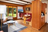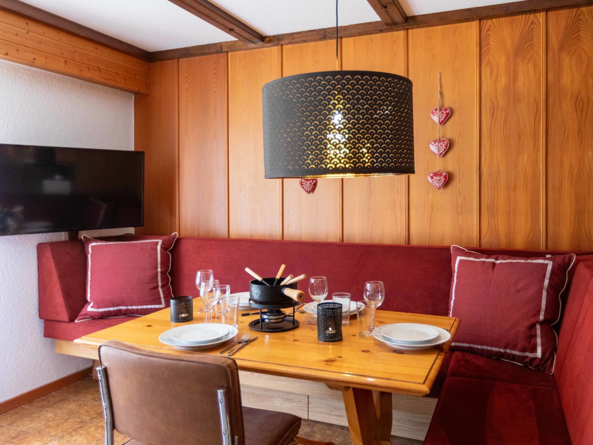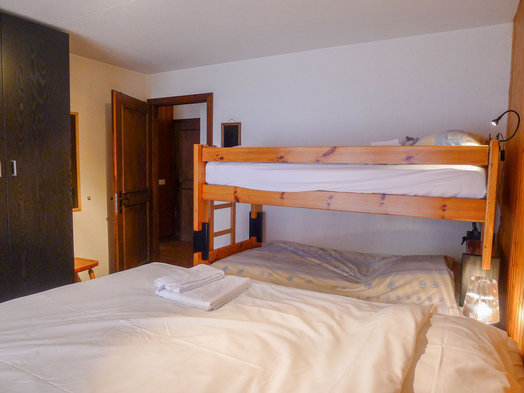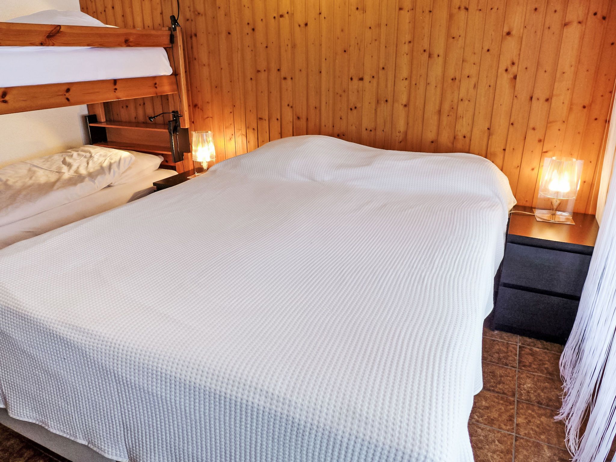 Opale 4, 2-Zimmer-Wohnung 55 m2, im Erdgeschoss, Südlage. Teilweise renoviert im Jahre 2022, zweckmässig eingerichtet: Wohn-/Esszimmer 25 m2 mit Panoramafenster mit Essecke und Kabel-TV (Flachbildschirm). Ausgang zur Terrasse. 1 Zimmer mit 1 x 2 Etagenbetten (80 cm), 1 franz. Bett (160 cm, Länge 200 cm). Ausgang zur Terrasse. Offene Küche (3 Kochplatten, Backofen, Geschirrspüler, Toaster, Wasserkocher, Tiefkühler, elektrische Kaffeemaschine, Racletteofen, Fondue Set (Käse)). Dusche/WC. Terrasse. Terrassenmöbel. Eingeschränkte Sicht auf die Berge. Zur Verfügung: Haartrockner. Internet (Wireless LAN, gratis). Garage Nr. 21.