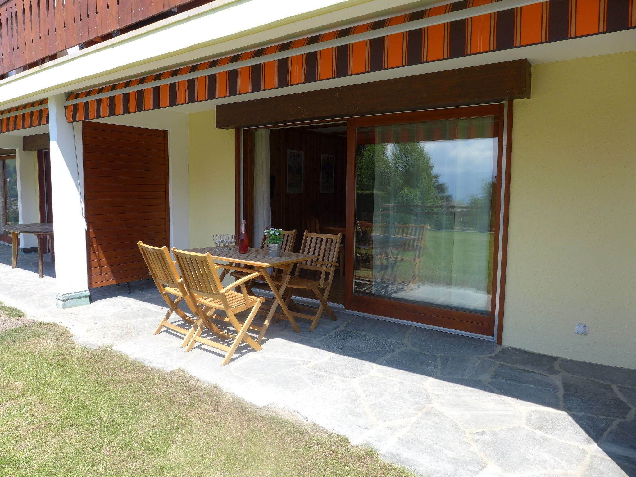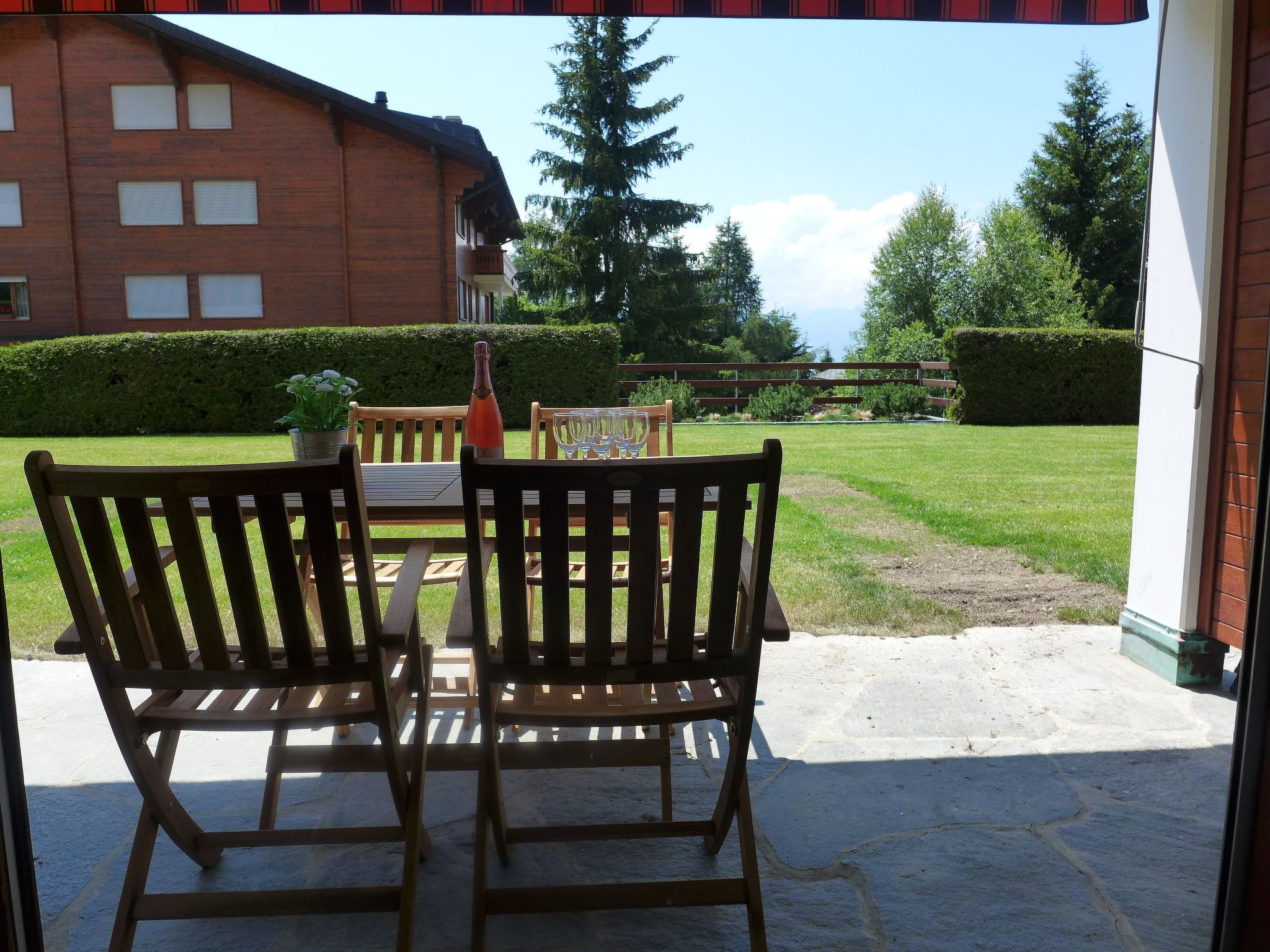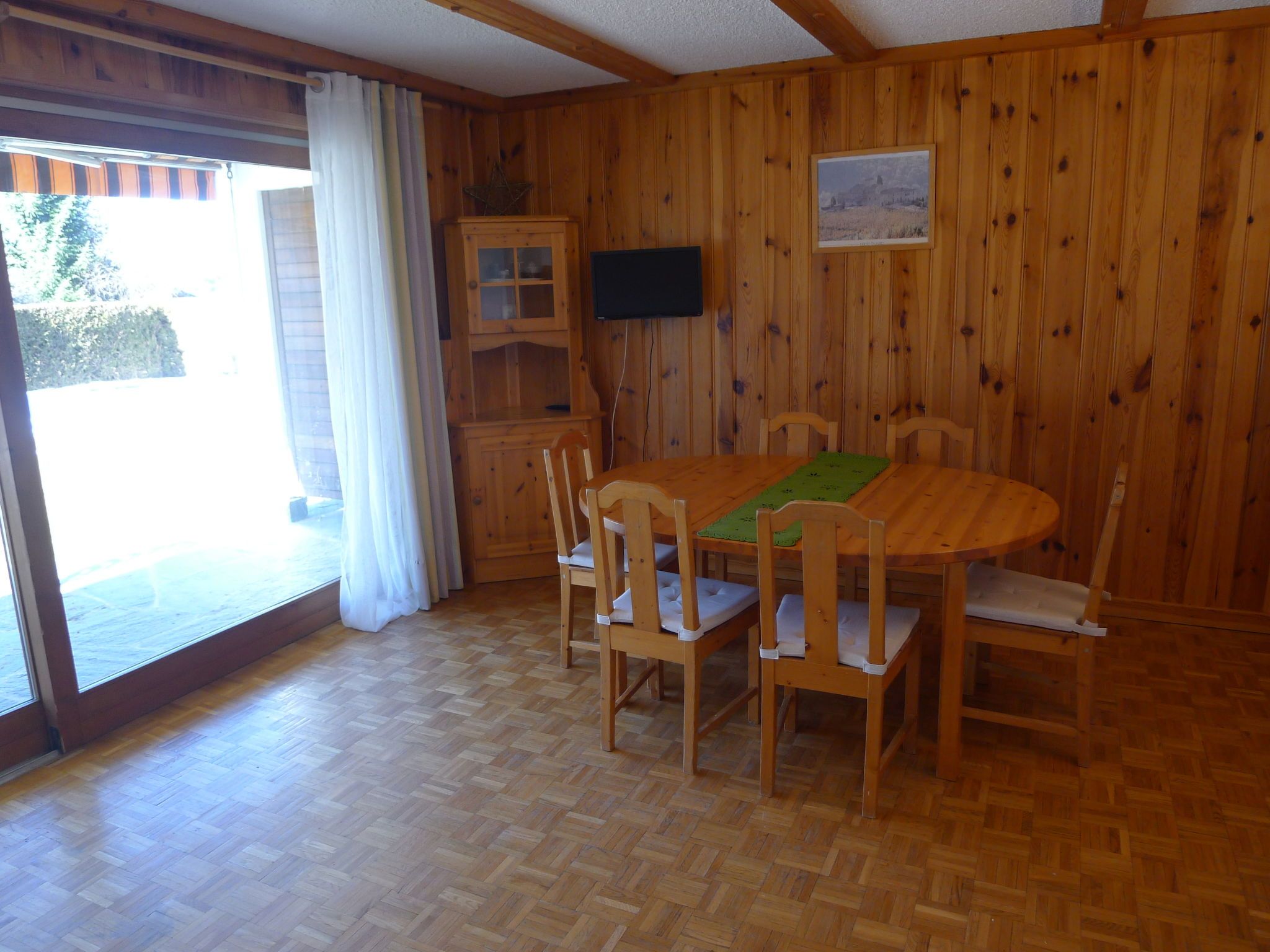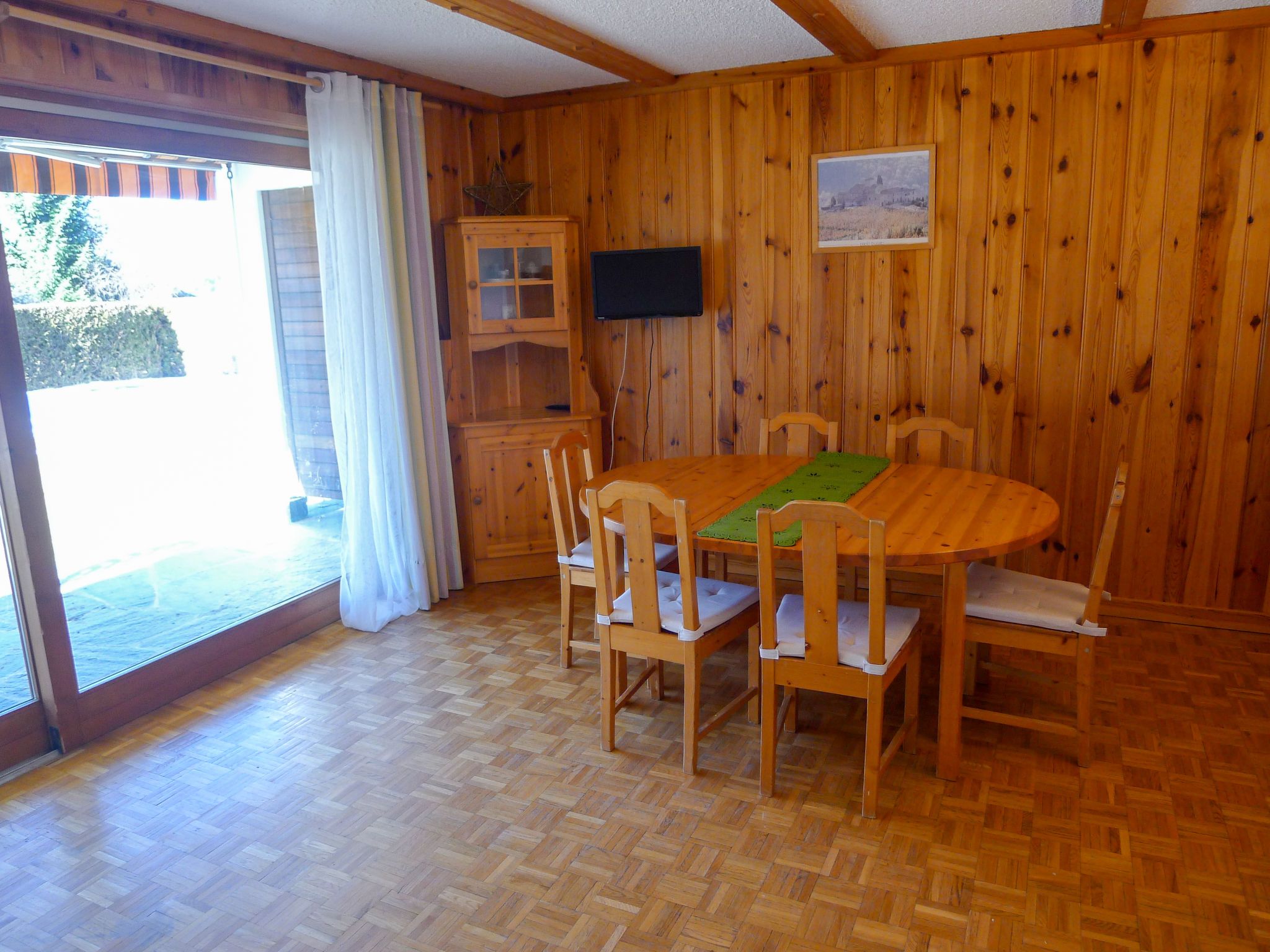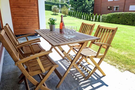 Hyacinthe 2, 3-Zimmer-Wohnung 80 m2, im Erdgeschoss, Südlage. Zweckmässig und schön eingerichtet: Wohn-/Esszimmer mit Kabel-TV. Ausgang zum Garten, zur Terrasse. 1 Zimmer, ohne Schrank mit 1 Doppelbett (160 cm, Länge 200 cm). 1 Zimmer mit 2 x 2 Etagenbetten (80 cm, Länge 190 cm). Kleine Küche (Backofen, Geschirrspüler, 4 Glaskeramikplatten, Toaster, Wasserkocher, Mikrowelle, Tiefkühler, elektrische Kaffeemaschine, Kapseln für die Kaffeemaschine (Martello) extra, Racletteofen, Fondue Set (Käse)) mit Durchreiche. Bad/Bidet/WC, Dusche/WC. Parkettboden, Teppichboden. Terrasse. Terrassenmöbel. Schöne Sicht. Zur Verfügung: Bügeleisen, Haartrockner. Internet (Wireless LAN, gratis). Garage Nr. 18.