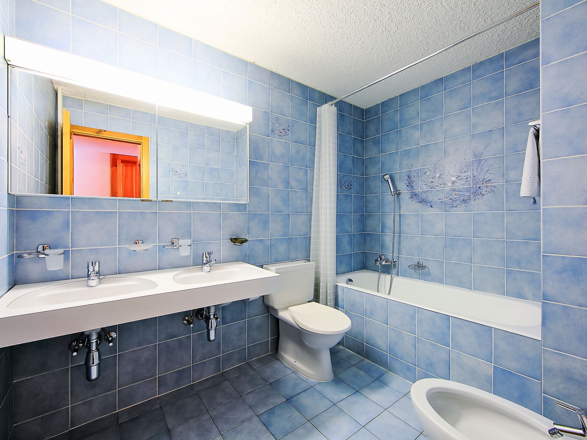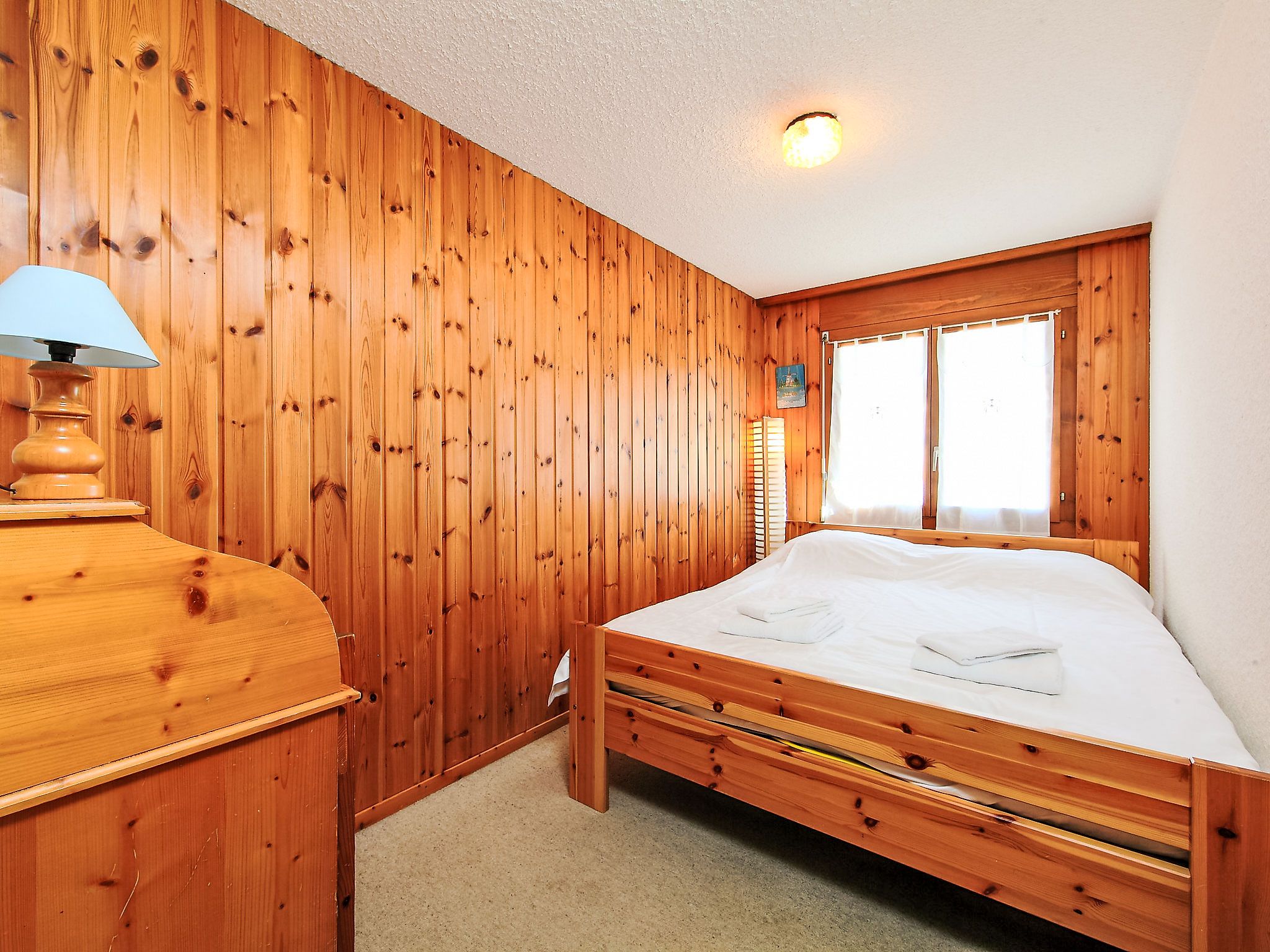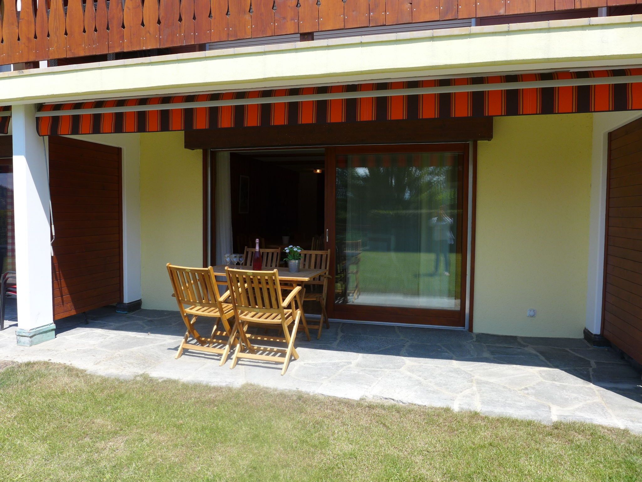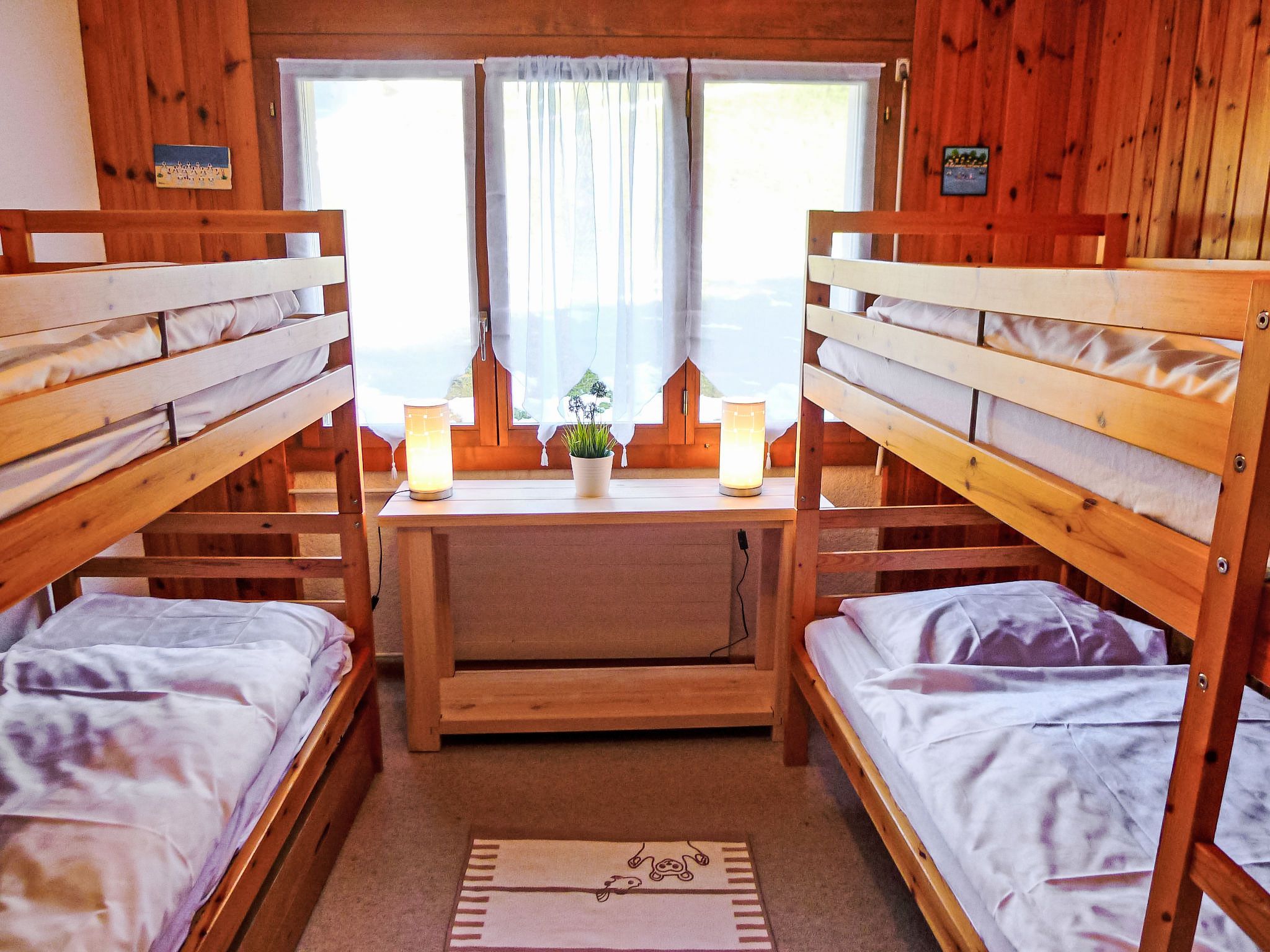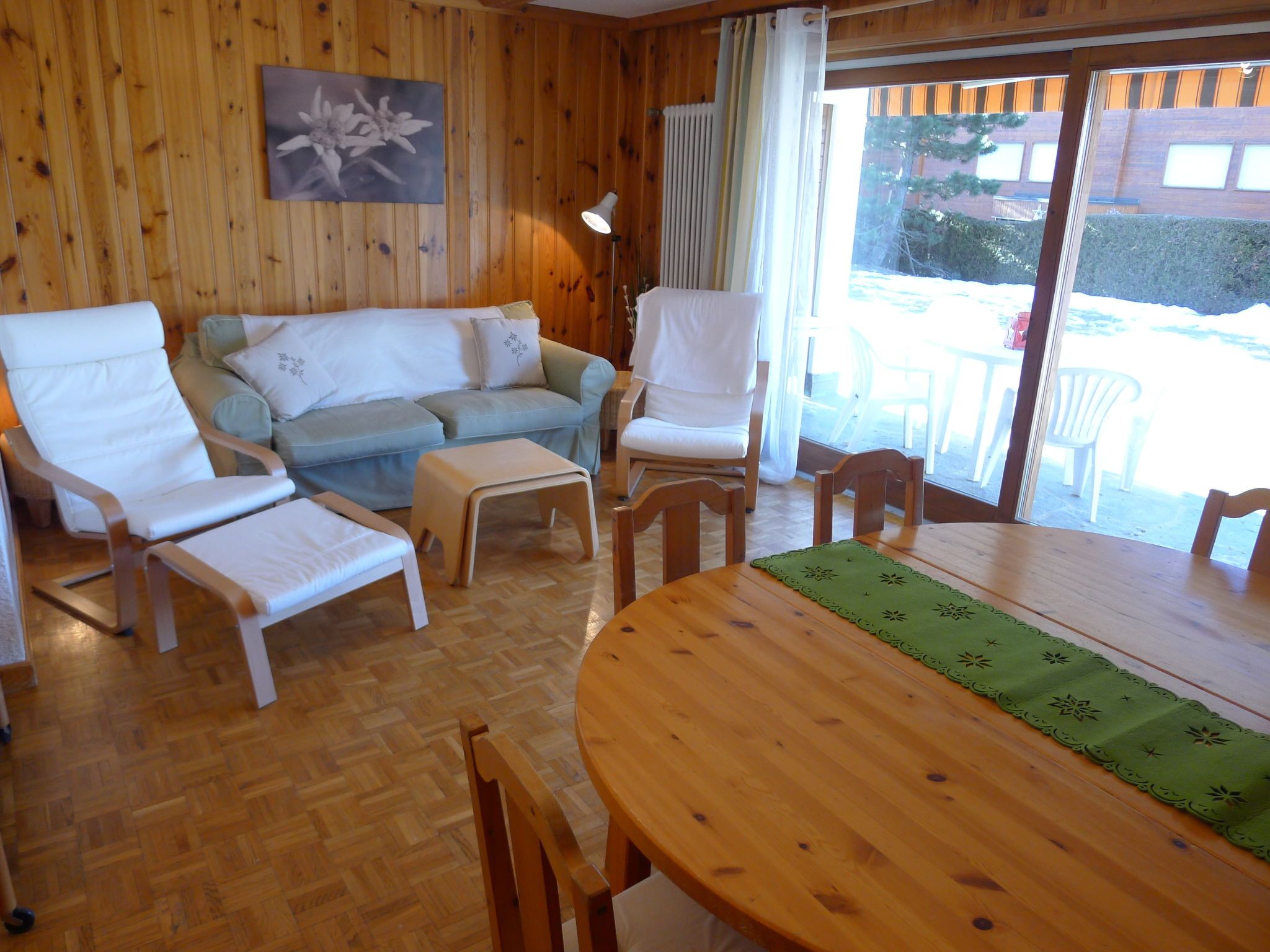 Hyacinthe 2, 3-Zimmer-Wohnung 80 m2, im Erdgeschoss, Südlage. Zweckmässig und schön eingerichtet: Wohn-/Esszimmer mit Kabel-TV. Ausgang zum Garten, zur Terrasse. 1 Zimmer, ohne Schrank mit 1 Doppelbett (160 cm, Länge 200 cm). 1 Zimmer mit 2 x 2 Etagenbetten (80 cm, Länge 190 cm). Kleine Küche (Backofen, Geschirrspüler, 4 Glaskeramikplatten, Toaster, Wasserkocher, Mikrowelle, Tiefkühler, elektrische Kaffeemaschine, Kapseln für die Kaffeemaschine (Martello) extra, Racletteofen, Fondue Set (Käse)) mit Durchreiche. Bad/Bidet/WC, Dusche/WC. Parkettboden, Teppichboden. Terrasse. Terrassenmöbel. Schöne Sicht. Zur Verfügung: Bügeleisen, Haartrockner. Internet (Wireless LAN, gratis). Garage Nr. 18.