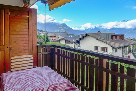 Grand Hôtel A10, 3-Zimmer-Wohnung 69 m2 im 2. Stock, Südlage. Komfortabel und mit viel Holz eingerichtet: Wohn-/Esszimmer mit Esstisch und TV. Ausgang zum Balkon, Richtung Süden. 1 Zimmer mit 1 franz. Bett (1 x 160 cm). Ausgang zum Balkon, Richtung Norden. 1 Zimmer mit 2 Betten (80 cm). Kochnische (4 Kochplatten, Backofen, Geschirrspüler, Toaster, Wasserkocher, elektrische Kaffeemaschine, Kapseln für die Kaffeemaschine (Nespresso) extra, Racletteofen, Fondue Set (Käse)). Bad/WC, sep. WC. Grosser Balkon 15 m2, Südlage, kleiner Balkon, Nordlage. Sehr schöne Panoramasicht auf die Berge. Zur Verfügung: Bügeleisen, Haartrockner. Garage Nr. 10. Bitte beachten: Nichtraucher-Unterkunft, Parkplatz nur für kleine Wagen. Maximal 1 Haustier/Hund erlaubt. CH54648