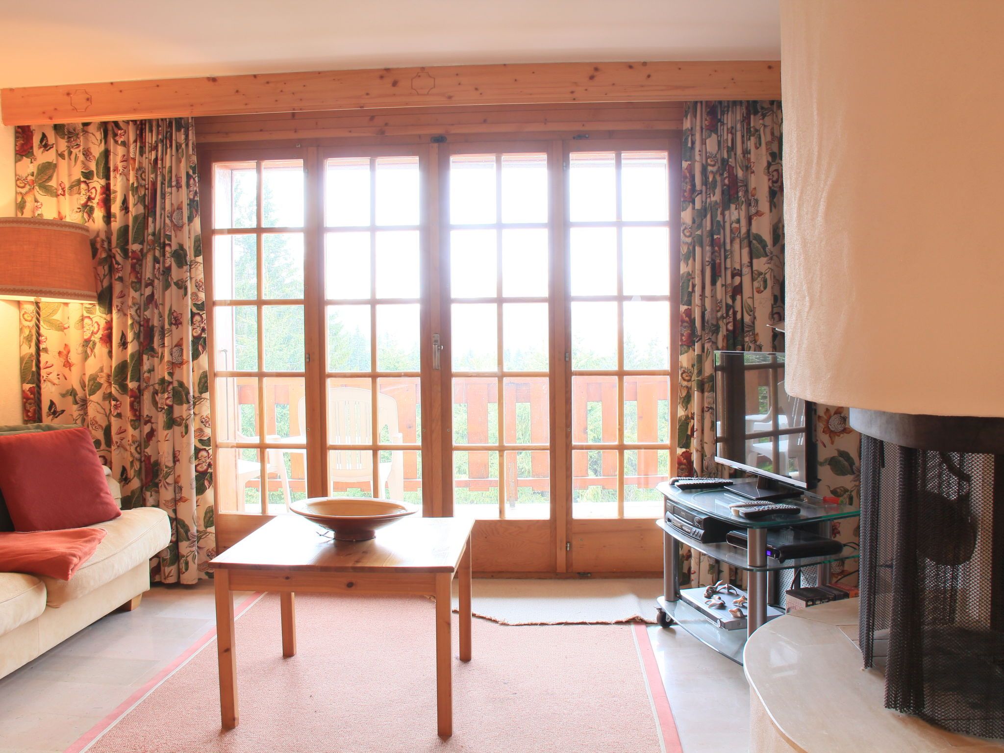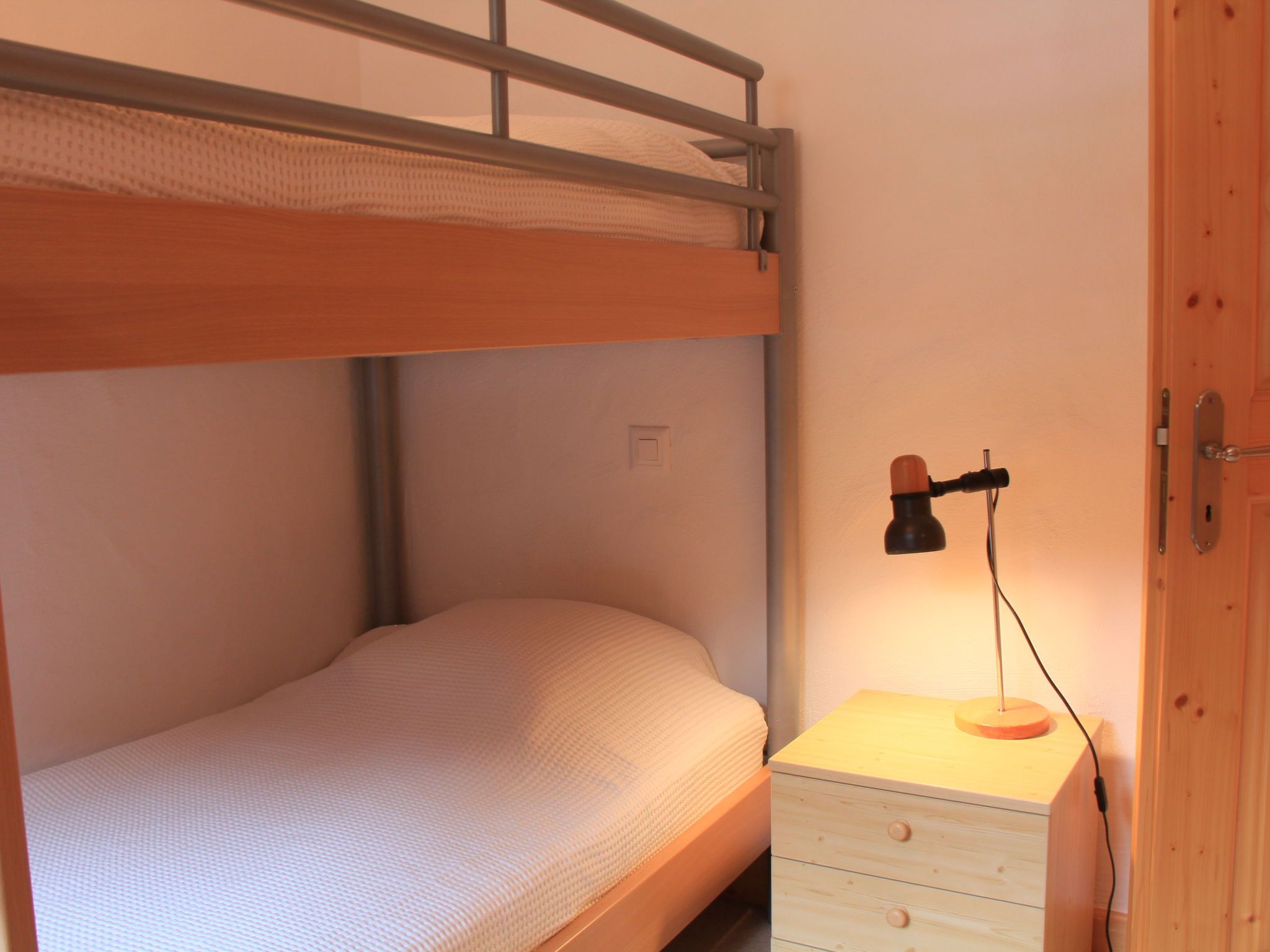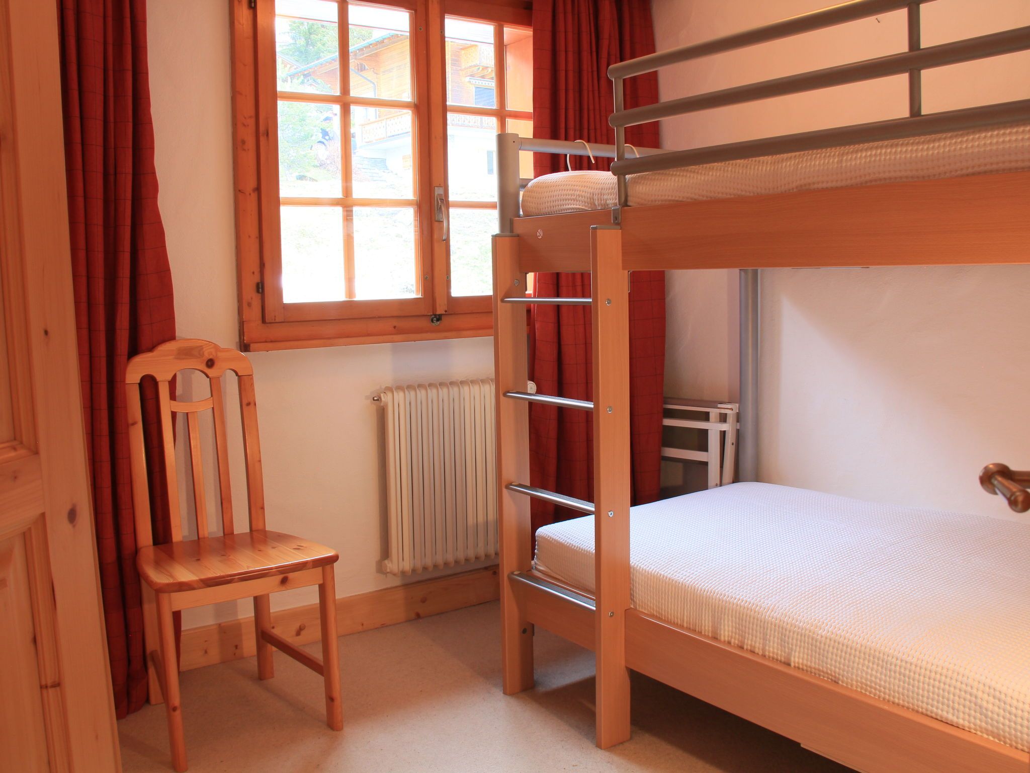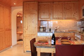 Dauphin 7, 2-Zimmer-Wohnung 36 m2 im 1. Stock, Südostlage. Schön eingerichtet: Wohn-/Esszimmer mit offenem Kamin, Esstisch und TV (Flachbildschirm). Ausgang zum Balkon, Richtung Osten und Richtung Süden. 1 Zimmer mit 1 x 2 Etagenbetten (90 cm, Länge 200 cm). Offene Küche (4 Kochplatten, Backofen, Geschirrspüler, Toaster, Wasserkocher, Mikrowelle, Tiefkühler, elektrische Kaffeemaschine, Racletteofen). Bad/WC. Kleiner Balkon 10 m2, Ostlage und Südlage. Balkonmöbel. Schöne Panoramasicht auf die Berge. Zur Verfügung: Haartrockner. Internet (Wireless LAN, gratis). Bitte beachten: Nichtraucher-Unterkunft.
