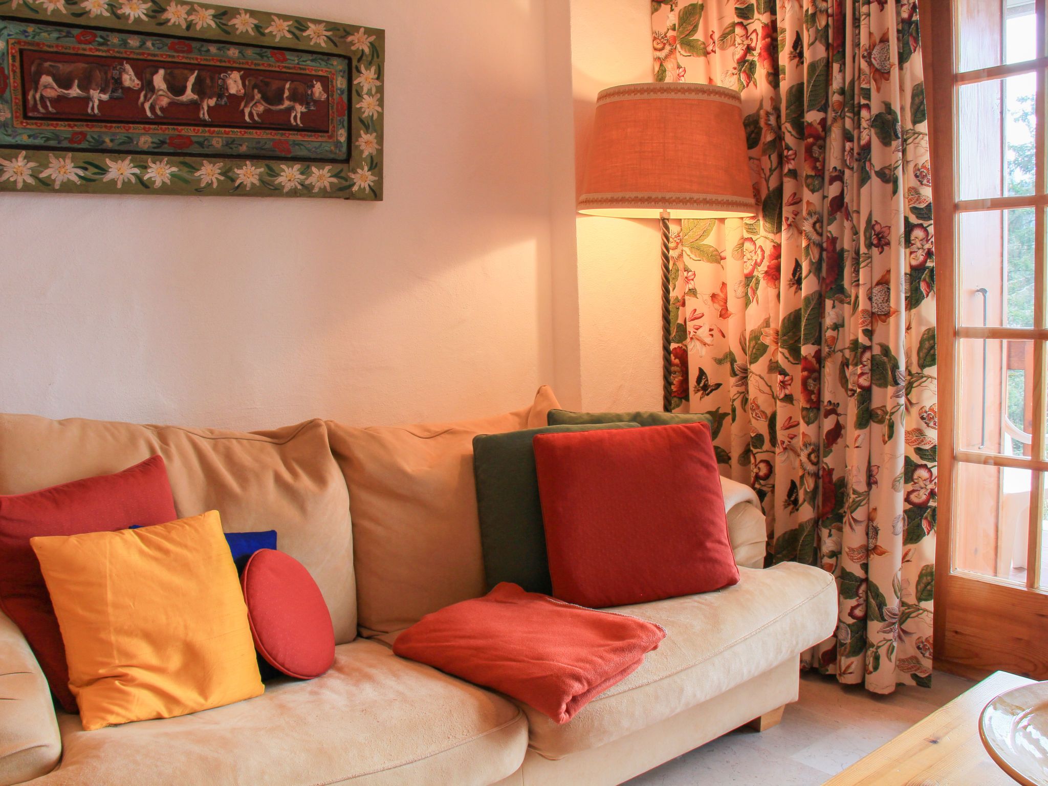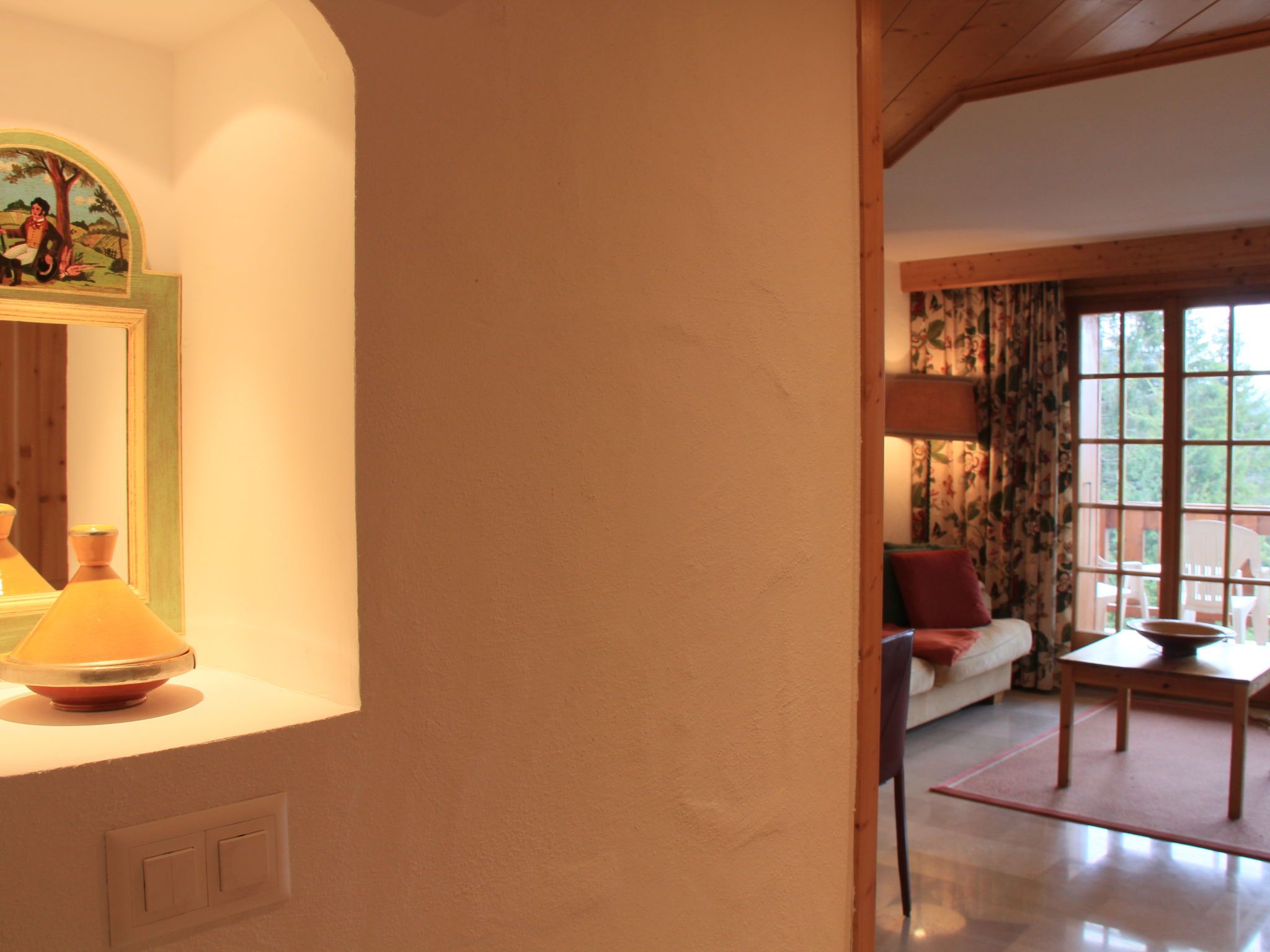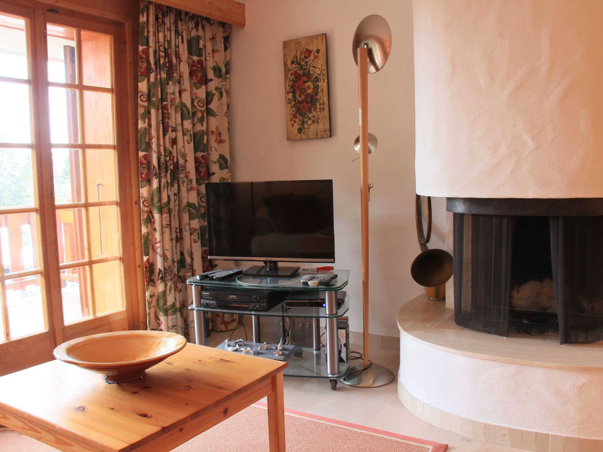 Dauphin 7, 2-Zimmer-Wohnung 36 m2 im 1. Stock, Südostlage. Schön eingerichtet: Wohn-/Esszimmer mit offenem Kamin, Esstisch und TV (Flachbildschirm). Ausgang zum Balkon, Richtung Osten und Richtung Süden. 1 Zimmer mit 1 x 2 Etagenbetten (90 cm, Länge 200 cm). Offene Küche (4 Kochplatten, Backofen, Geschirrspüler, Toaster, Wasserkocher, Mikrowelle, Tiefkühler, elektrische Kaffeemaschine, Racletteofen). Bad/WC. Kleiner Balkon 10 m2, Ostlage und Südlage. Balkonmöbel. Schöne Panoramasicht auf die Berge. Zur Verfügung: Haartrockner. Internet (Wireless LAN, gratis). Bitte beachten: Nichtraucher-Unterkunft.
