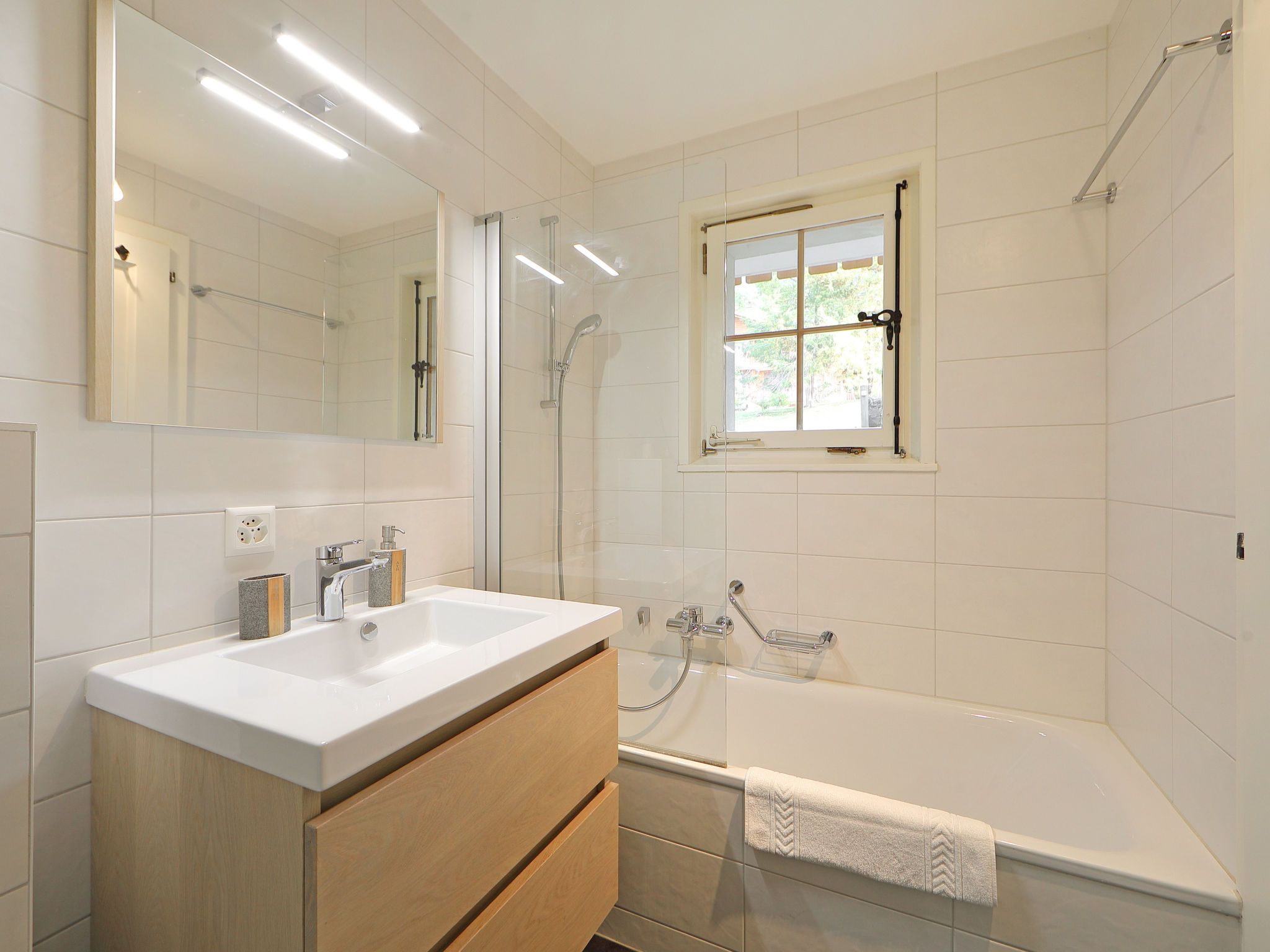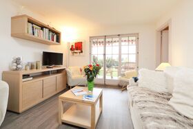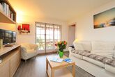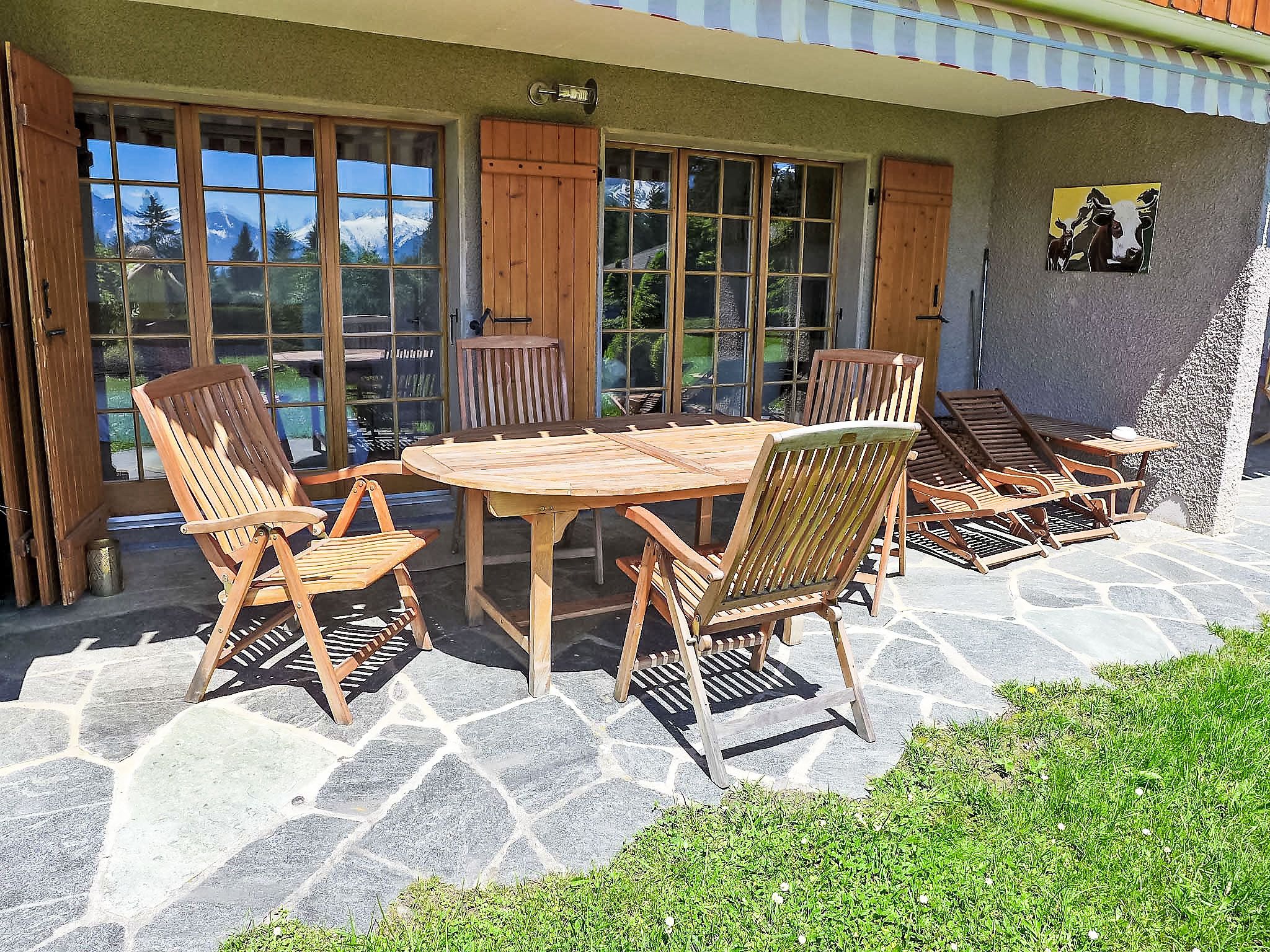 Cristel 2, 3-Zimmer-Wohnung 56 m2, im Erdgeschoss, Südlage. Vollständig renoviert im Jahre 2015, schön und modern eingerichtet: Wohn-/Esszimmer mit Esstisch und TV (Flachbildschirm). Ausgang zum Garten, zur Terrasse. 1 Kinderzimmer, ohne Fenster mit 1 x 2 Etagenbetten (80 cm, Länge 190 cm). 1 Doppelzimmer, ohne Schrank mit 1 franz. Bett (160 cm, Länge 200 cm). Ausgang zum Garten, zur Terrasse. Offene Küche (Backofen, Geschirrspüler, 4 Glaskeramikplatten, Toaster, Wasserkocher, Mikrowelle, elektrische Kaffeemaschine, Kapseln für die Kaffeemaschine (Nespresso) extra, Racletteofen, Fondue Set (Käse)). Bad/WC. Terrasse 15 m2, Garten 50 m2. Terrassenmöbel. Sehr schöne Panoramasicht auf die Berge. Zur Verfügung: Haartrockner. Internet (Wireless LAN, gratis).