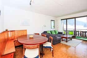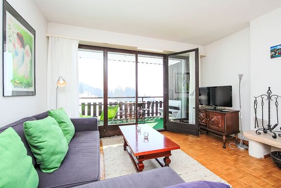 Marignac 33, 3-Zimmer-Wohnung 80 m2 im 4. Stock, Südlage. Zweckmässig und schön eingerichtet: Wohn-/Esszimmer mit offenem Kamin, Essecke und Sat-TV. Ausgang zum Balkon, Richtung Südosten. 1 Doppelzimmer, ohne Schrank mit 2 Betten. 1 Zimmer mit 1 x 2 Etagenbetten, 1 Doppelbett. Ausgang zum Balkon. Kleine Küche (Backofen, Geschirrspüler, 4 Glaskeramikplatten, Toaster, Wasserkocher, elektrische Kaffeemaschine, Racletteofen, Fondue Set (Käse)). Ausgang zum Balkon, Richtung Nordwesten. Bad, sep. WC. Balkon, Südostlage, kleiner Balkon, Nordwestlage. Schöne Sicht auf die Berge und die Skipiste. Zur Verfügung: Haartrockner. Bitte beachten: Nichtraucher-Unterkunft.