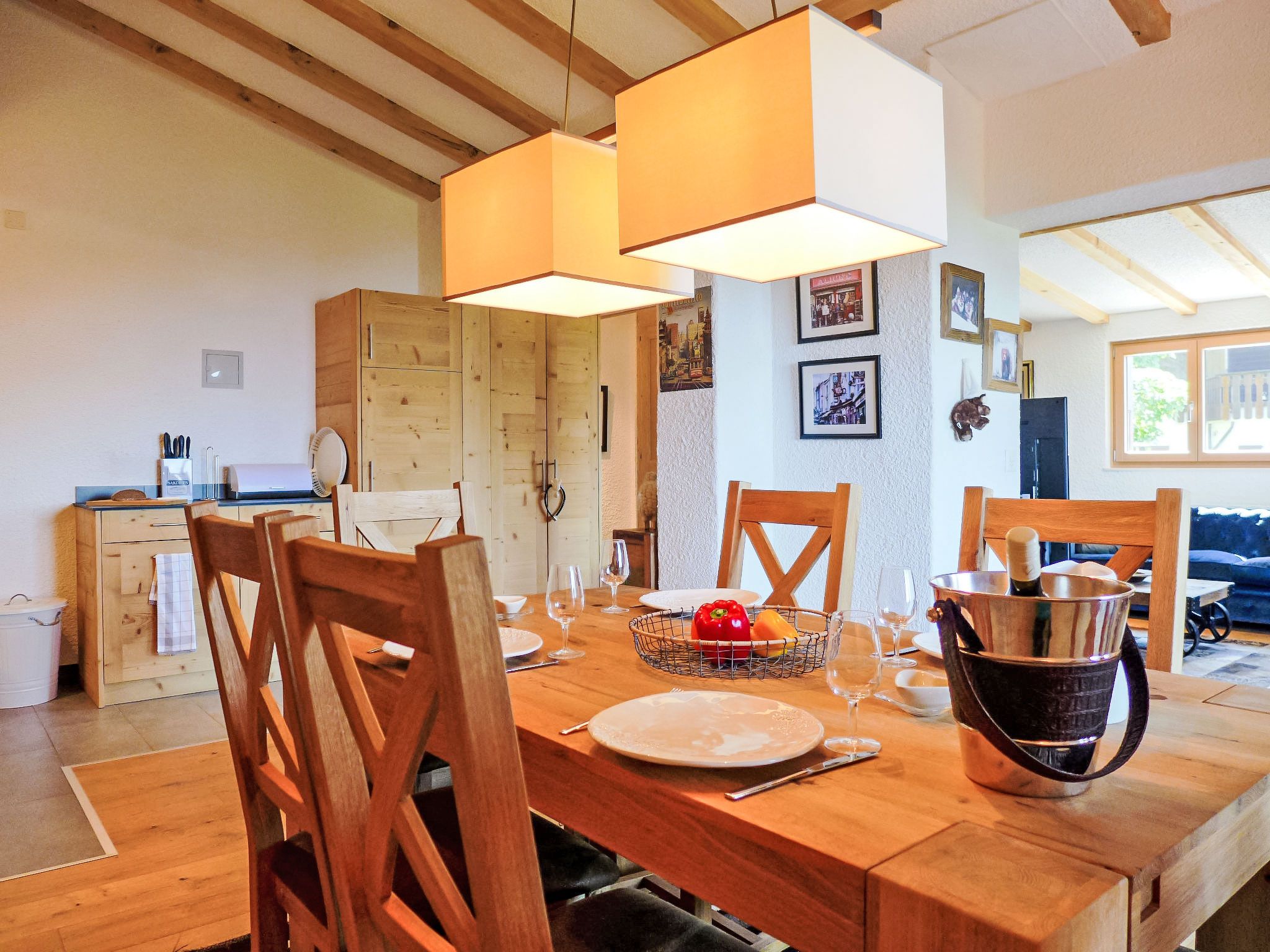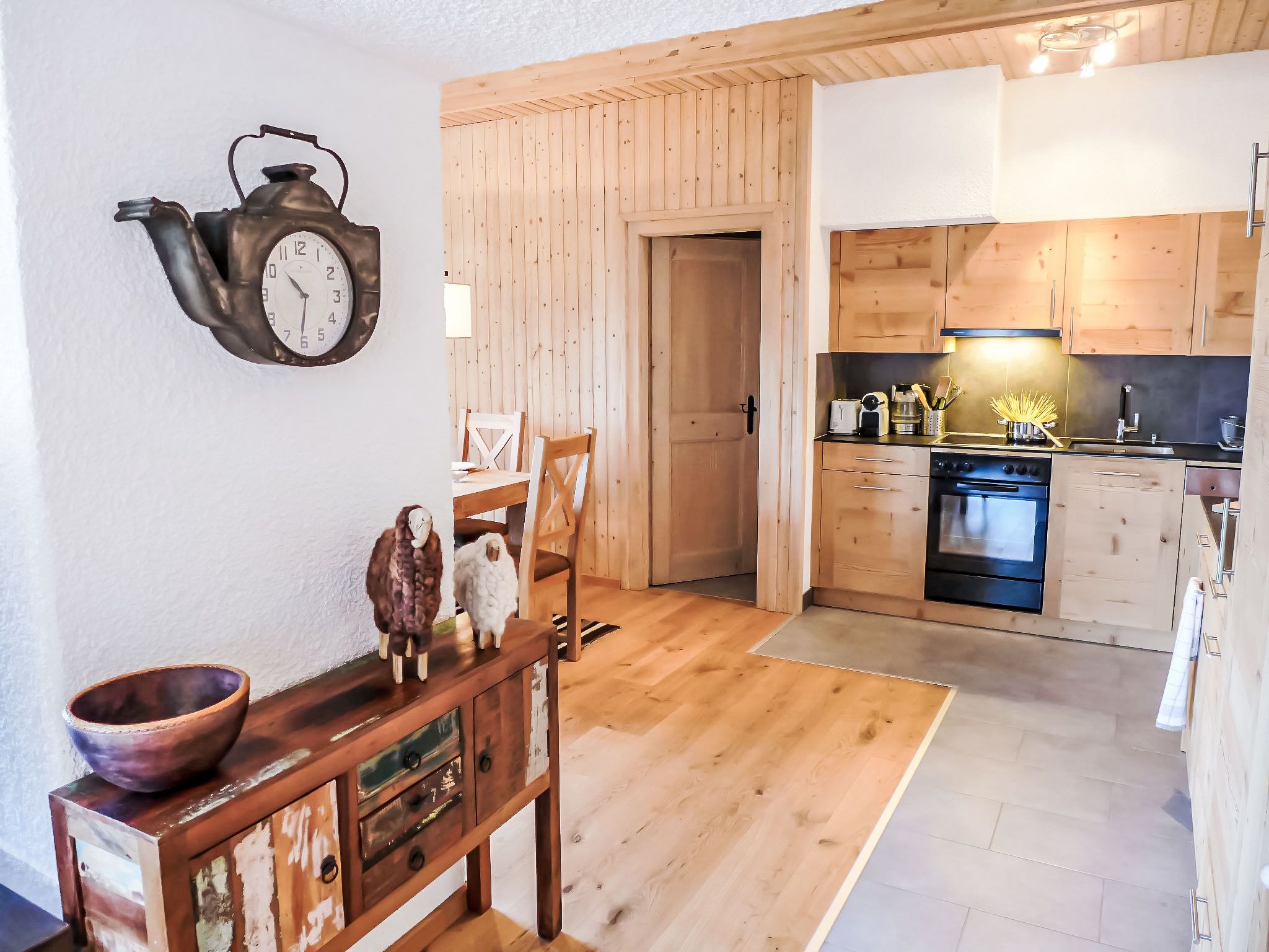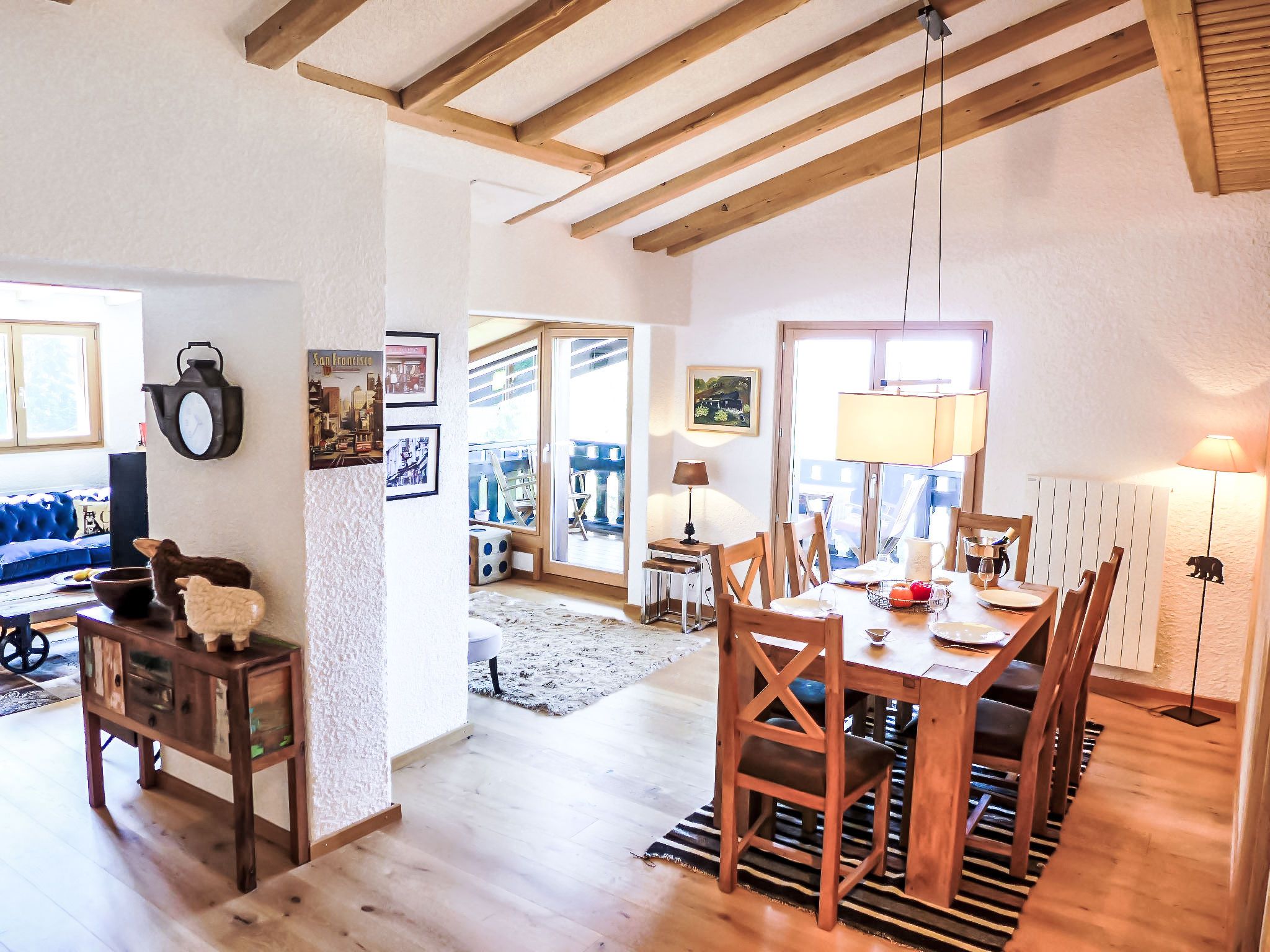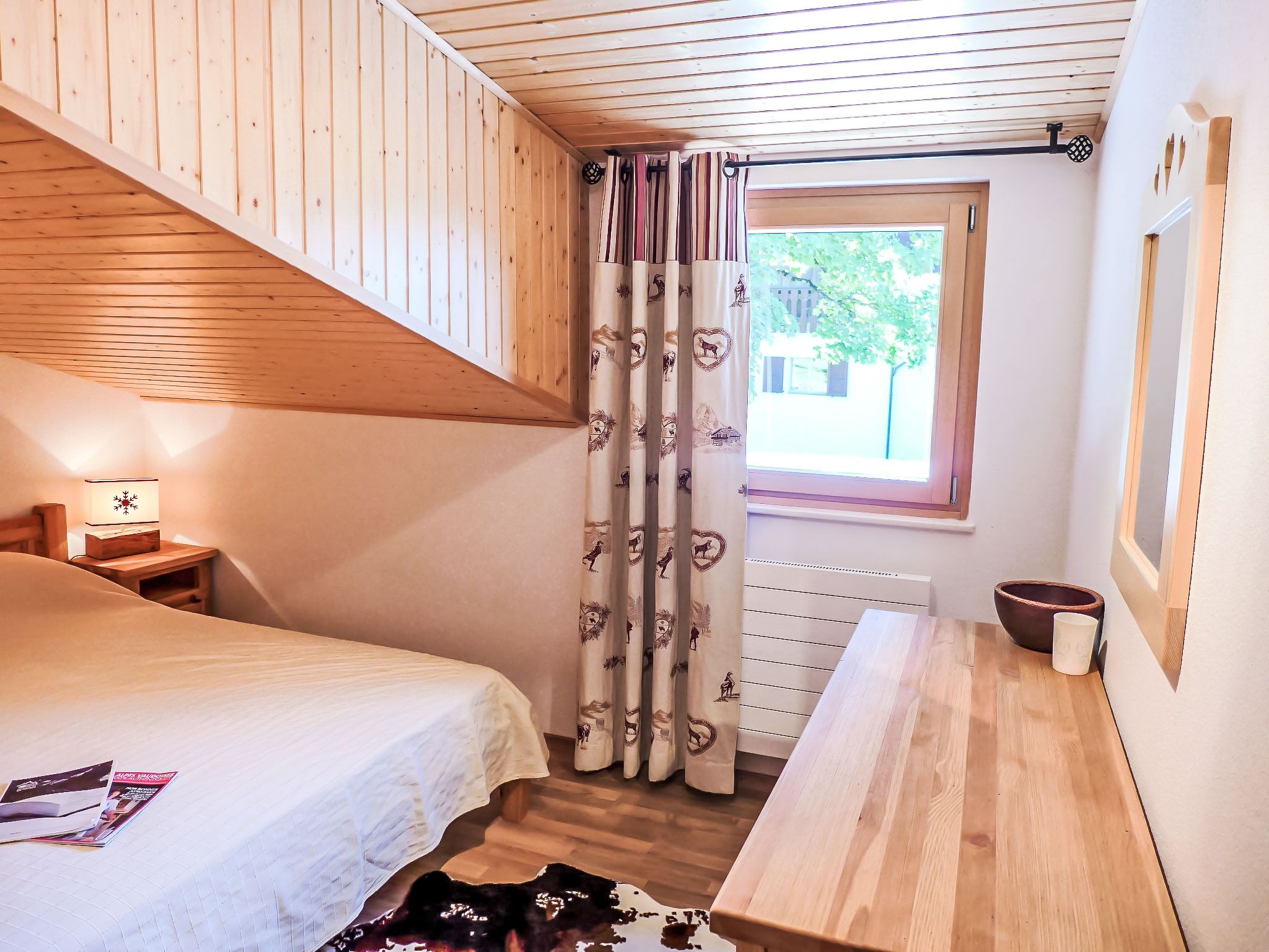 Regina B9, 3-Zimmer-Attikawohnung 80 m2 im 2. Stock, Südlage. Geräumig, abgeschrägt, vollständig renoviert im Jahre 2017, schön und geschmackvoll eingerichtet: abgeschrägtes grosses Wohn-/Esszimmer, Deckenhöhe 200 - 400 cm mit offenem Kamin, Esstisch und TV. Ausgang zum Balkon, Richtung Süden. 1 Doppelzimmer, Deckenhöhe 130 - 200 cm mit 1 franz. Bett (1 x 180 cm, Länge 200 cm). 1 Zimmer mit 1 x 2 Etagenbetten (90 cm, Länge 200 cm). Offene Küche (Backofen, Geschirrspüler, 4 Glaskeramikplatten, Toaster, Wasserkocher, Mikrowelle, elektrische Kaffeemaschine, Kapseln für die Kaffeemaschine (nespresso) extra, Racletteofen, Fondue Set (Käse)). Bad/WC, Dusche/WC. Balkon 10 m2, Südlage. Balkonmöbel. Schöne Panoramasicht auf die Berge und das Tal. Zur Verfügung: Waschmaschine, Wäschetrockner, Haartrockner. Internet (Wireless LAN). Parkplatz, Garage Nr. b9. Bitte beachten: Nichtraucher-Unterkunft.