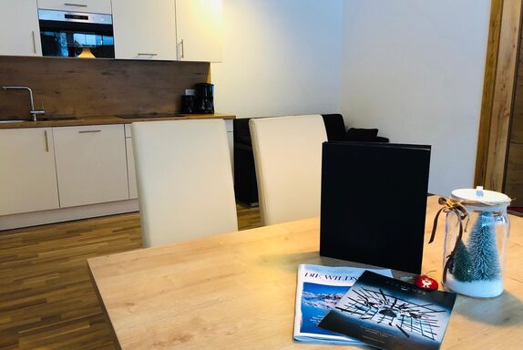 Appartement Weißer Kogel (ca. 65 m²/Tiefparterre): 2 Doppelzimmer, 2 Badezimmer mit Dusche/WC, vollausgestattete Wohnküche mit Essbereich, Schlafsofa für eine Person, Ceran-Kochfeld, Geschirrspüler, Mikrowelle, Kühlschrank, Kaffemaschine, Wasserkocher, TV uvm. Außerdem verfügt das Appartement über eine Terrasse.