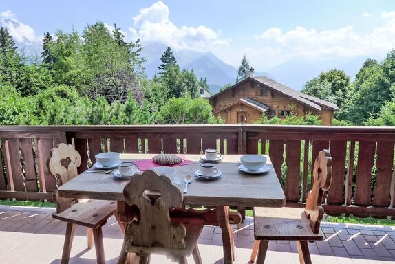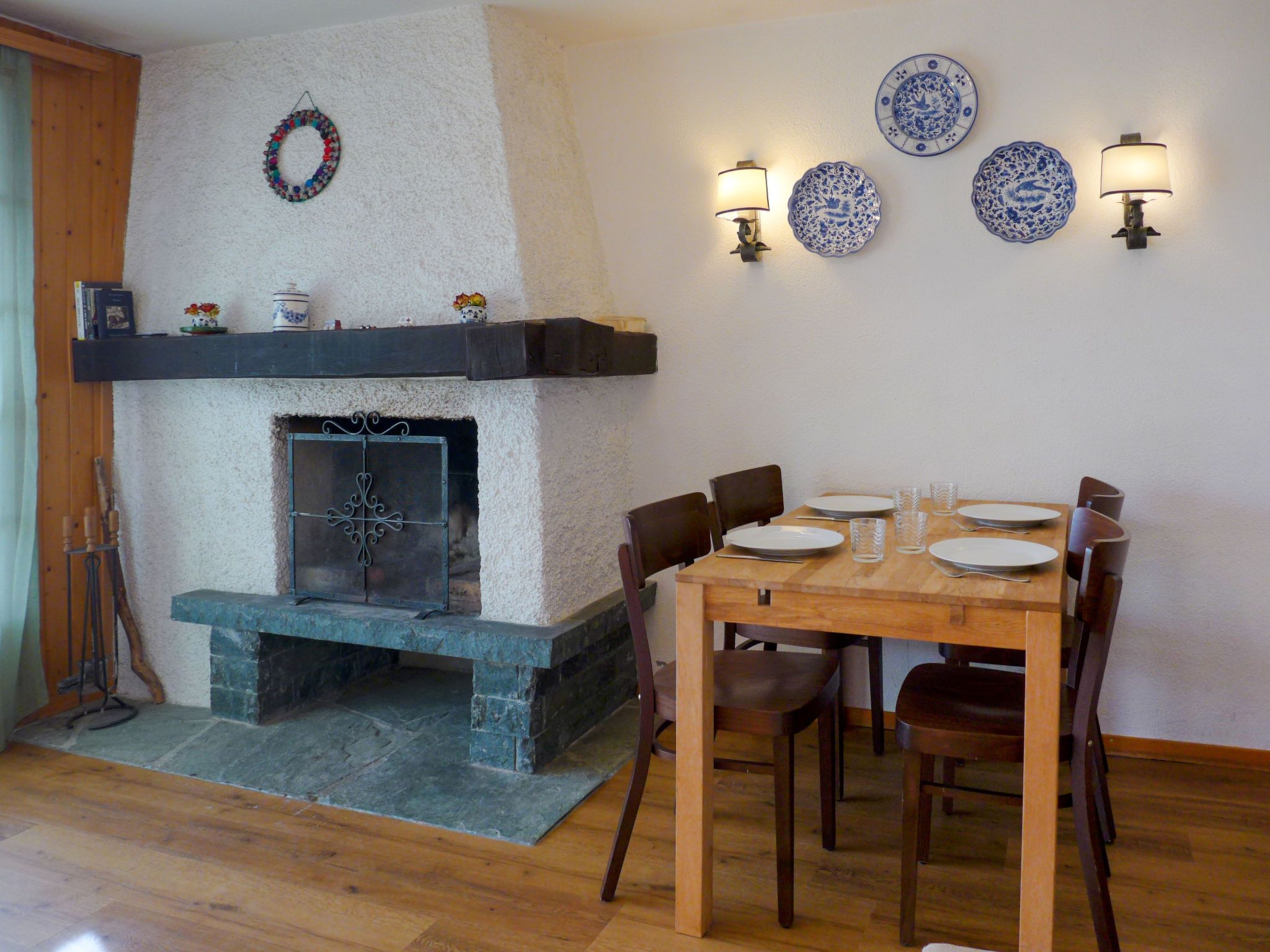 Le Mont Blanc 8, 2-Zimmer-Wohnung 45 m2 im 1. Stock, Südlage. Einfach und zweckmässig eingerichtet: Wohn-/Schlafzimmer mit 1 Doppeldiwanbett (140 cm, Länge 200 cm), offenem Kamin, Esstisch und TV (Flachbildschirm). Ausgang zum Balkon. 1 Zimmer mit 2 Betten. Kleine Küche (4 Kochplatten, Backofen, Geschirrspüler, Wasserkocher, Racletteofen, Fondue Set (Käse)). Bad/Bidet/WC. Balkon 10 m2, Südlage. Schöne Sicht auf die Berge und die Landschaft. Zur Verfügung: Haartrockner. Internet (WLAN, gratis). Bitte beachten: Kühlschrank ohne Gefrierfach. Maximal 1 Haustier/Hund erlaubt.