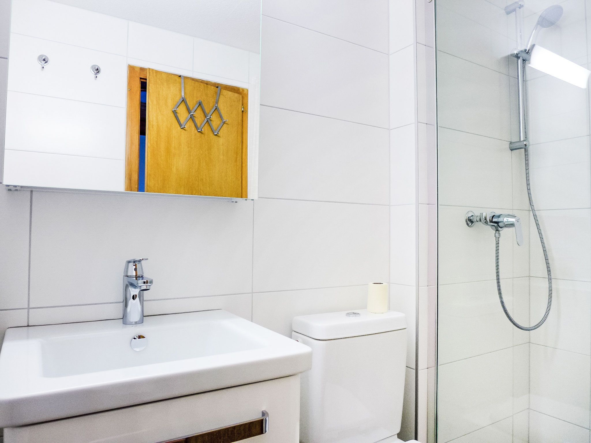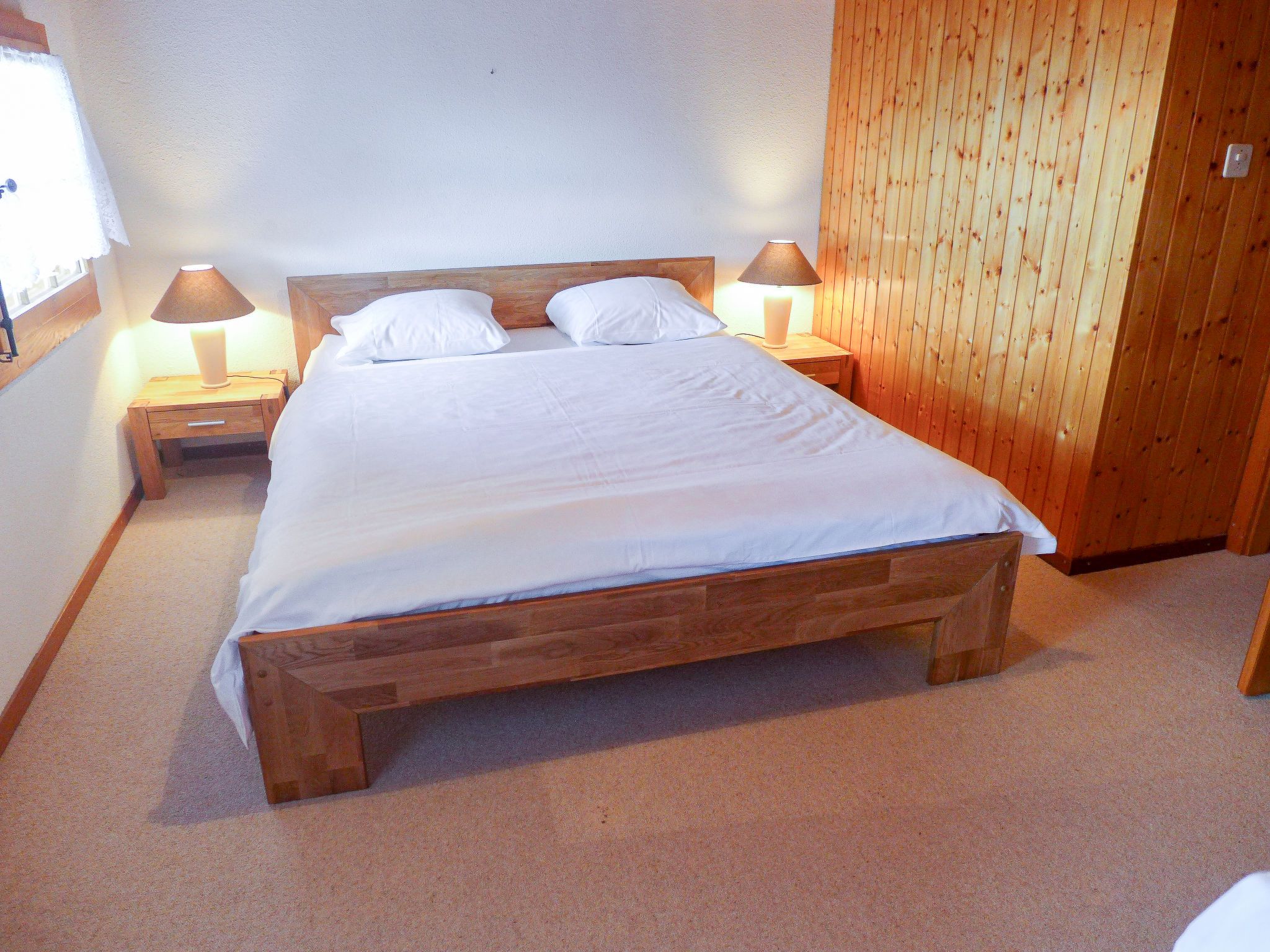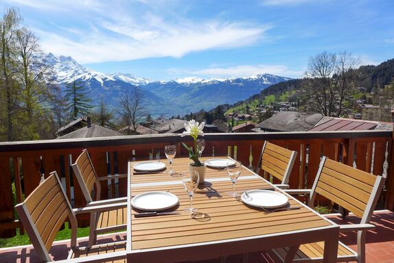Ermitage 13, 3-Zimmer-Wohnung 66 m2 auf 2 Stockwerken im 2. Stock, Südlage. Komfortabel und schön eingerichtet: Wohn-/Esszimmer mit TV und DVD. Ausgang zum Balkon, Richtung Süden. Kochnische (4 Kochplatten, Backofen, Toaster, Wasserkocher, elektrische Kaffeemaschine, Racletteofen, Fondue Set (Käse)). Bad/WC. Heizung. Obergeschoss: (steile Treppe) 1 Zimmer mit 2 Betten. 1 Zimmer mit 2 Betten. Kleiner Balkon 9 m2, Südlage. Balkonmöbel. Schöne Panoramasicht auf die Berge und das Tal. Zur Verfügung: Bügeleisen, Haartrockner. Internet (Wireless LAN, gratis). Bitte beachten: Nichtraucher-Unterkunft.