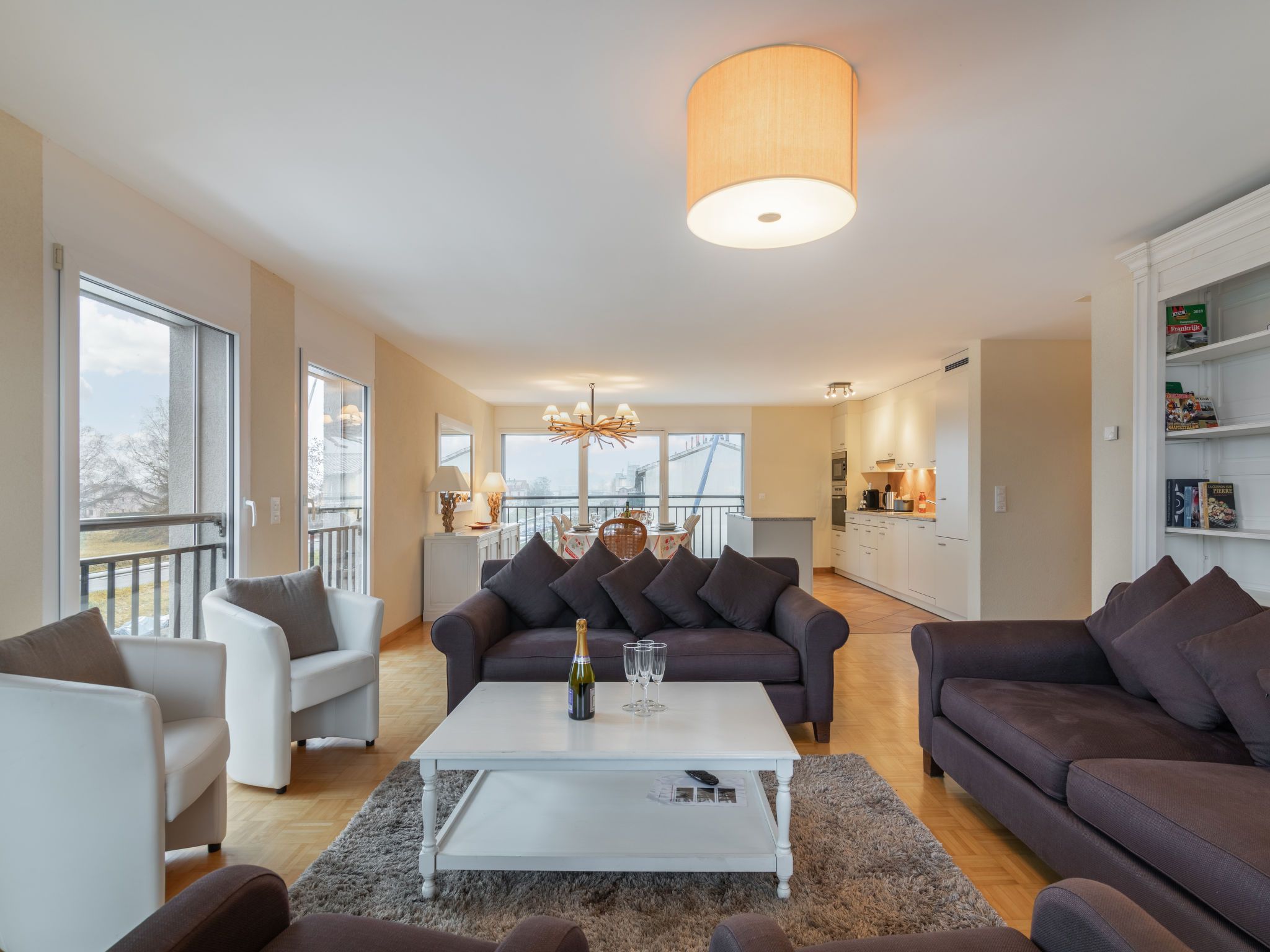 Cook P1/2, 4-Zimmer-Wohnung im 2. Stock. Objekt geeignet für 6 Erwachsene + 2 Kinder. Geräumig und hell, schön und geschmackvoll eingerichtet: offenes grosses Wohn-/Esszimmer mit Panoramafenster mit Esstisch, Kabel-TV und Flachbildschirm. Ausgang zum Balkon. 1 Zimmer mit 1 Doppelbett (160 cm, Länge 200 cm), Bad/WC. 1 Zimmer mit 1 Doppelbett (160 cm, Länge 200 cm). Ausgang zum Balkon. 1 Zimmer mit 1 Bett (90 cm, Länge 190 cm), 1 x 2 Etagenbetten (90 cm, Länge 190 cm), 1 Ausziehbett (1 Pers. 2 x 90 cm, Länge 190 cm). Offene Küche (Backofen, Geschirrspüler, 4 Glaskeramikplatten, Toaster, Wasserkocher, Mikrowelle, Tiefkühler, elektrische Kaffeemaschine, Kapseln für die Kaffeemaschine (Nespresso) extra, Fondue Set (Käse)) mit Bar. Dusche/WC, sep. WC. Parkettboden. Balkon 7 m2. Balkonmöbel, Elektrogrill (mobil), Liegestühle (2). Sicht auf die Berge und den Kanal. Zur Verfügung: Waschmaschine, Wäschetrockner, Kinderhochstuhl, Babybett bis 3 Jahre (extra), Haartrockner. Internet (WLAN, gratis). Parkplatz Nr. 189. Bitte beachten: geeignet für Familien. Nichtraucher-Unterkunft. CH49185