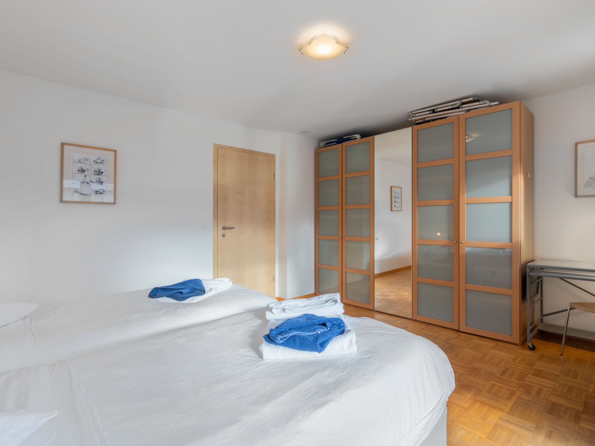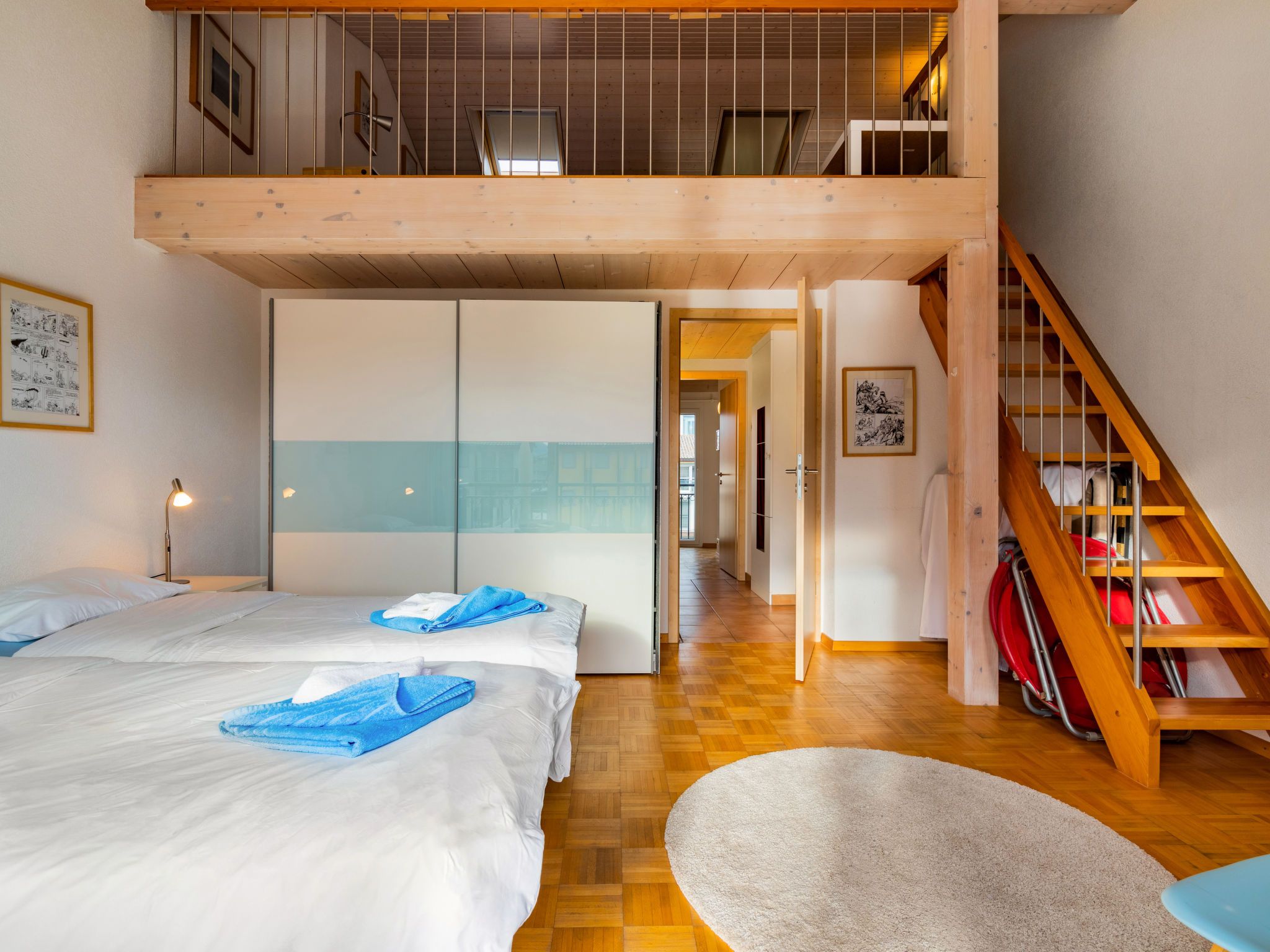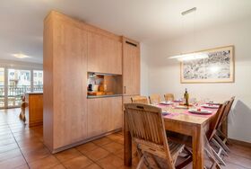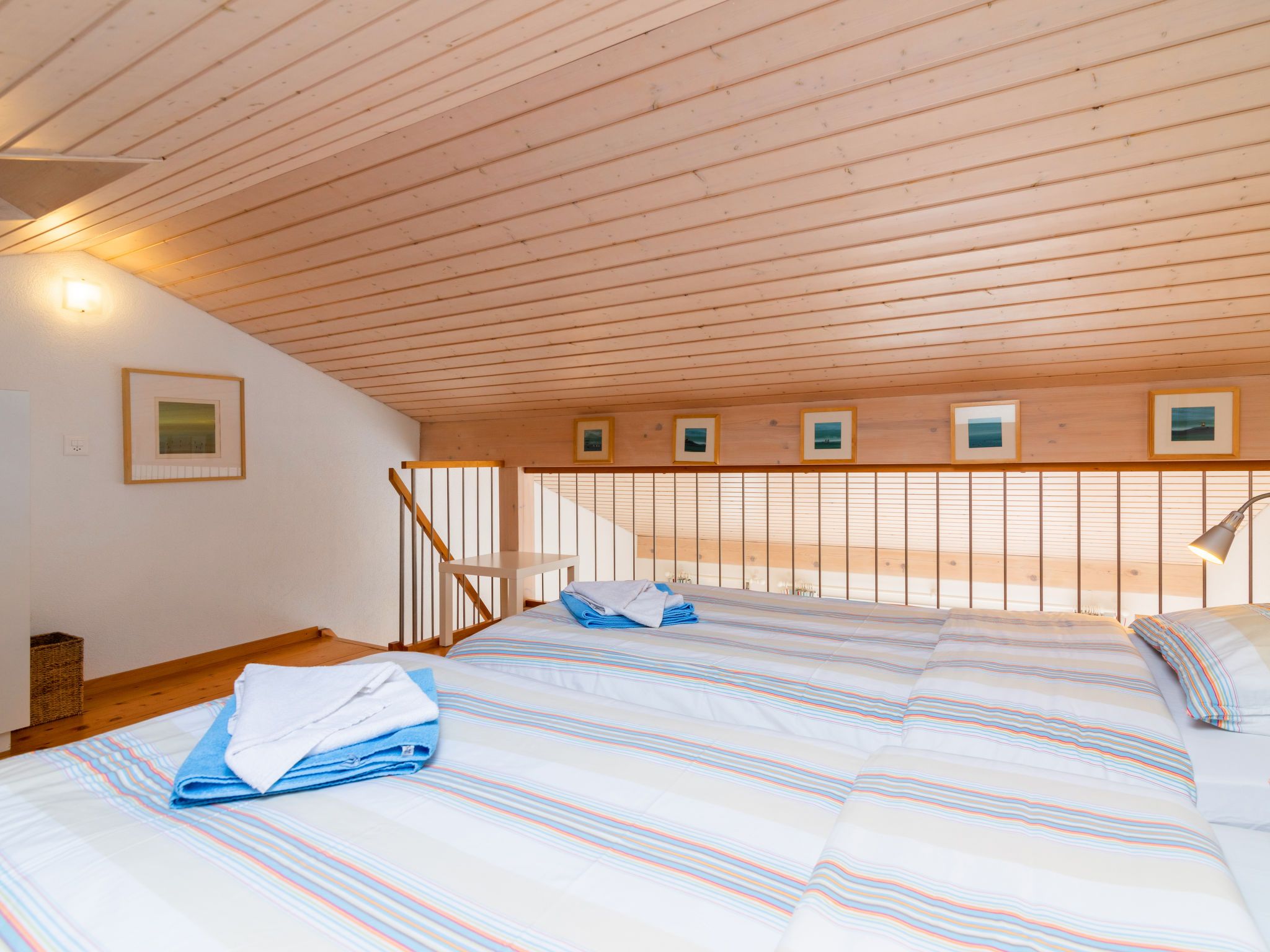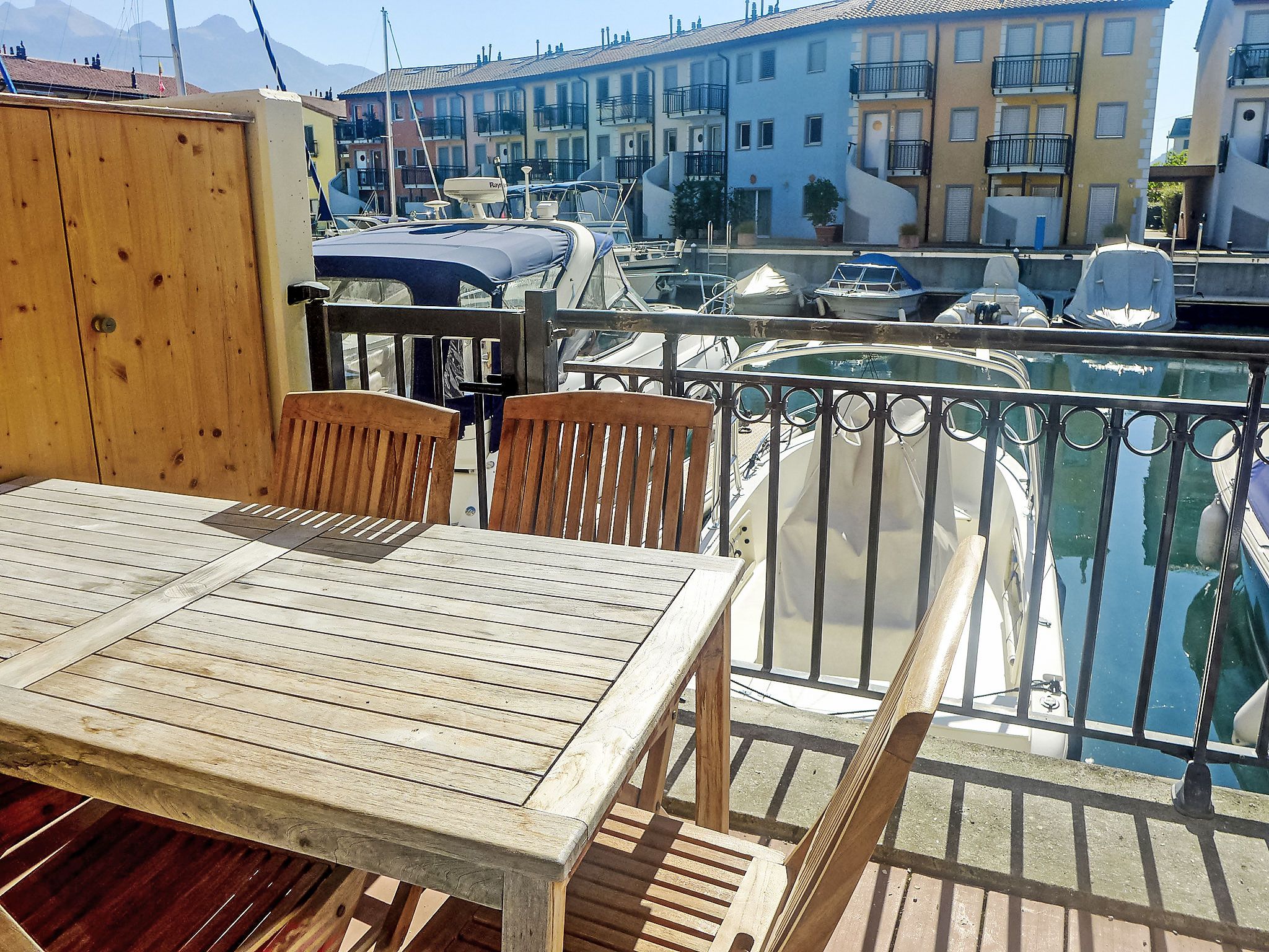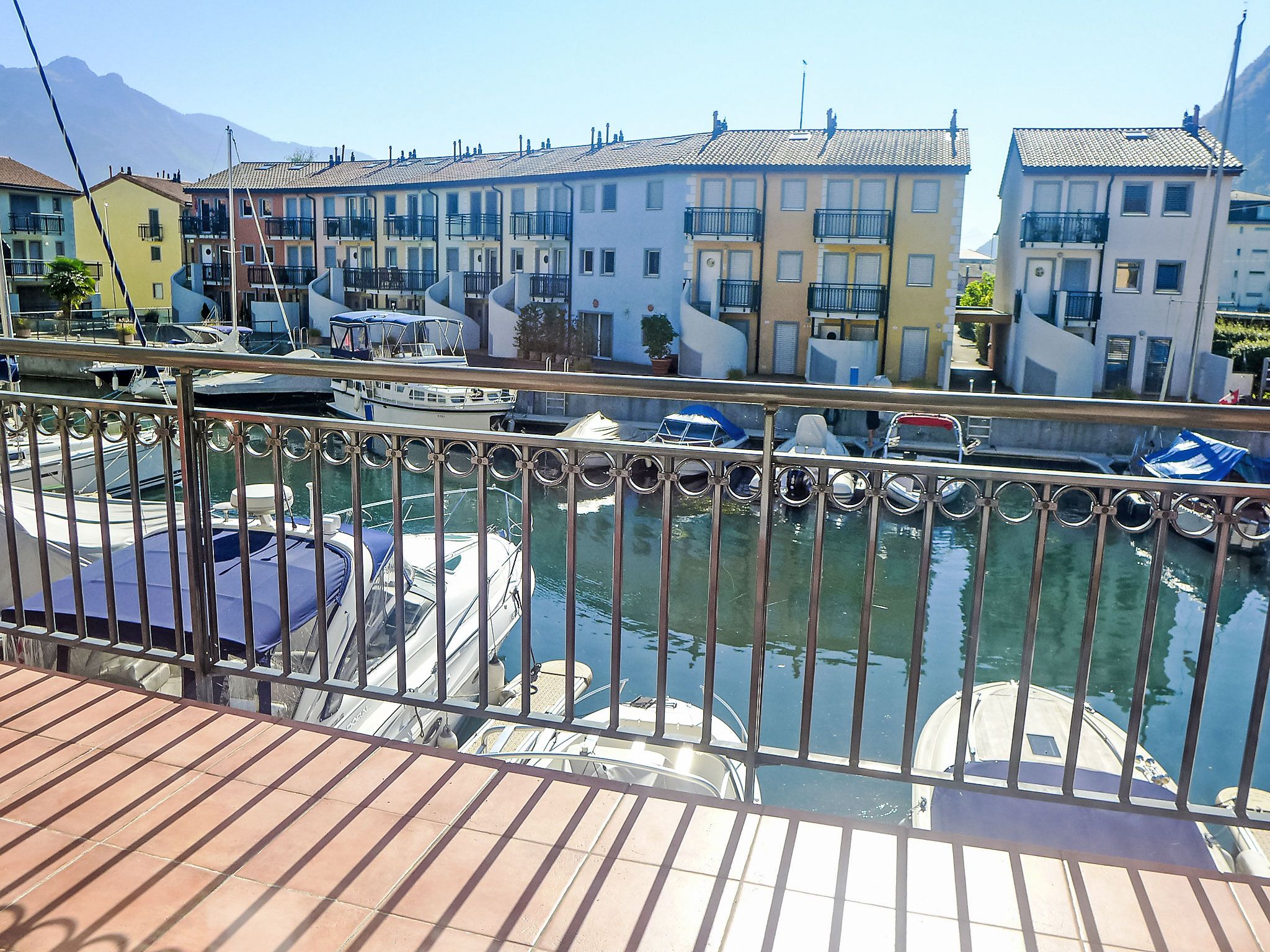 Vasco de Gama B8/R, 5-Zimmer-Reihenhaus 173 m2 auf 3 Stockwerken, Südostlage. Teilweise abgeschrägt, komfortabel und geschmackvoll eingerichtet: Wohn-/Esszimmer mit Essecke, sep. WC, Sat-TV, Radio, CD, Stereoanlage, DVD, Heimkino und Boiler (100 Liter). Ausgang zum Balkon, Richtung Südosten. Offene Küche (Backofen, Geschirrspüler, 4 Glaskeramikplatten, Mikrowelle, Tiefkühler, elektrische Kaffeemaschine, Kapseln für die Kaffeemaschine (Nespresso) extra). Obergeschoss: 1 Zimmer mit 2 Betten (90 cm, Länge 190 cm). Ausgang zum Balkon, Richtung Südosten. 1 Zimmer mit 1 Bett (90 cm, Länge 190 cm). Bad/WC. 2. Obergeschoss: 1 Zimmer mit 2 Betten (90 cm, Länge 190 cm). Ausgang zum Balkon, Richtung Südosten. 1 Zimmer mit 1 Bett (90 cm, Länge 190 cm). Ausgang zum Balkon, Richtung Süden und Richtung Osten. Galerie mit 2 Betten (90 cm, Länge 190 cm). Bad/WC. Balkon, Südostlage. Terrassenmöbel. Schöne Sicht auf die Berge, den Kanal und den Hafen. Zur Verfügung: Waschmaschine, Wäschetrockner, Bügeleisen. Internet (Wireless LAN, gratis). Parkplatz Nr. 40 (überdacht). Anstelle eines abgeschlossenen Schlafzimmers befinden sich manche Schlafplätze in einem offenen Bereich (Galerie, Nische etc.).