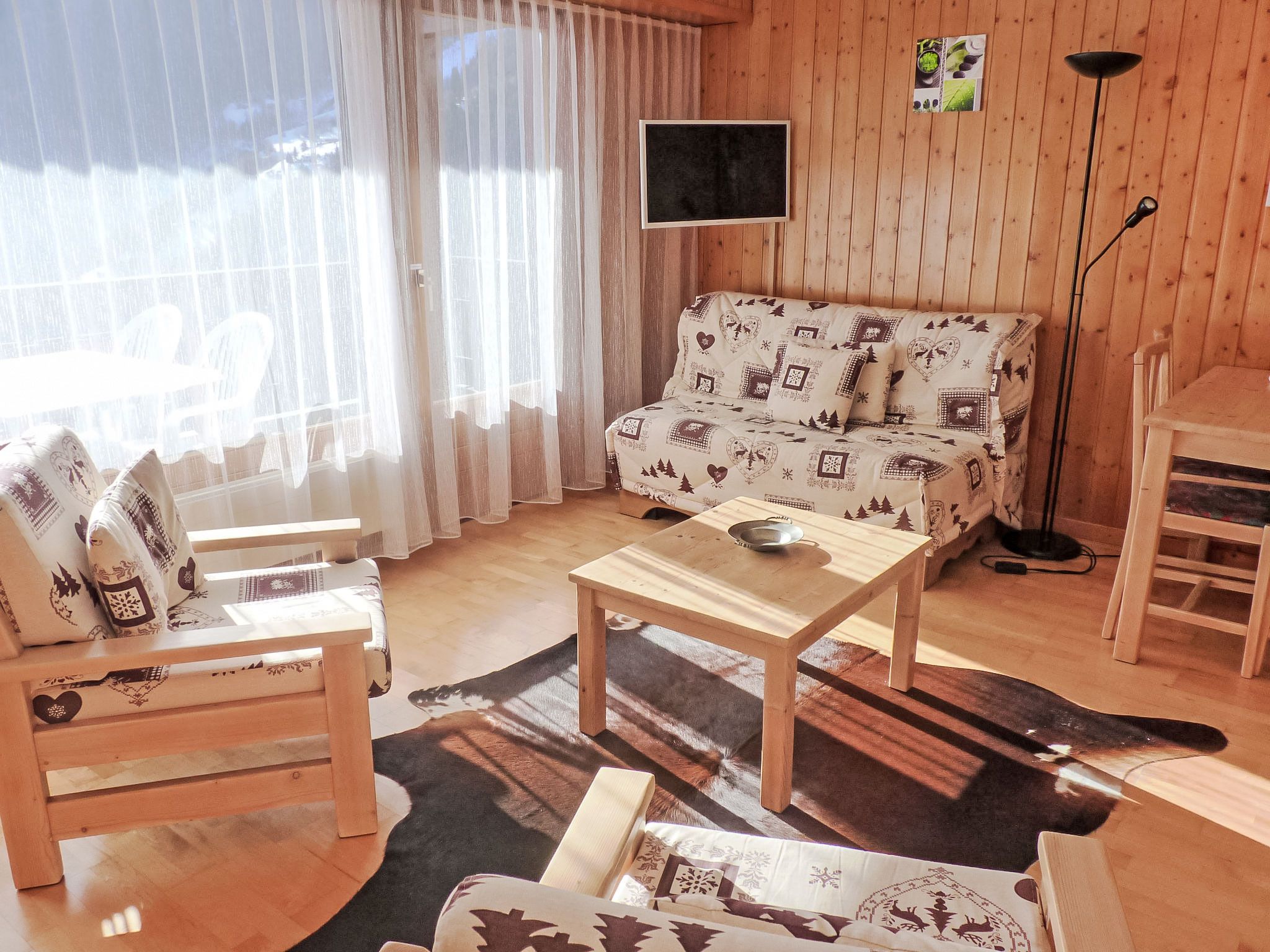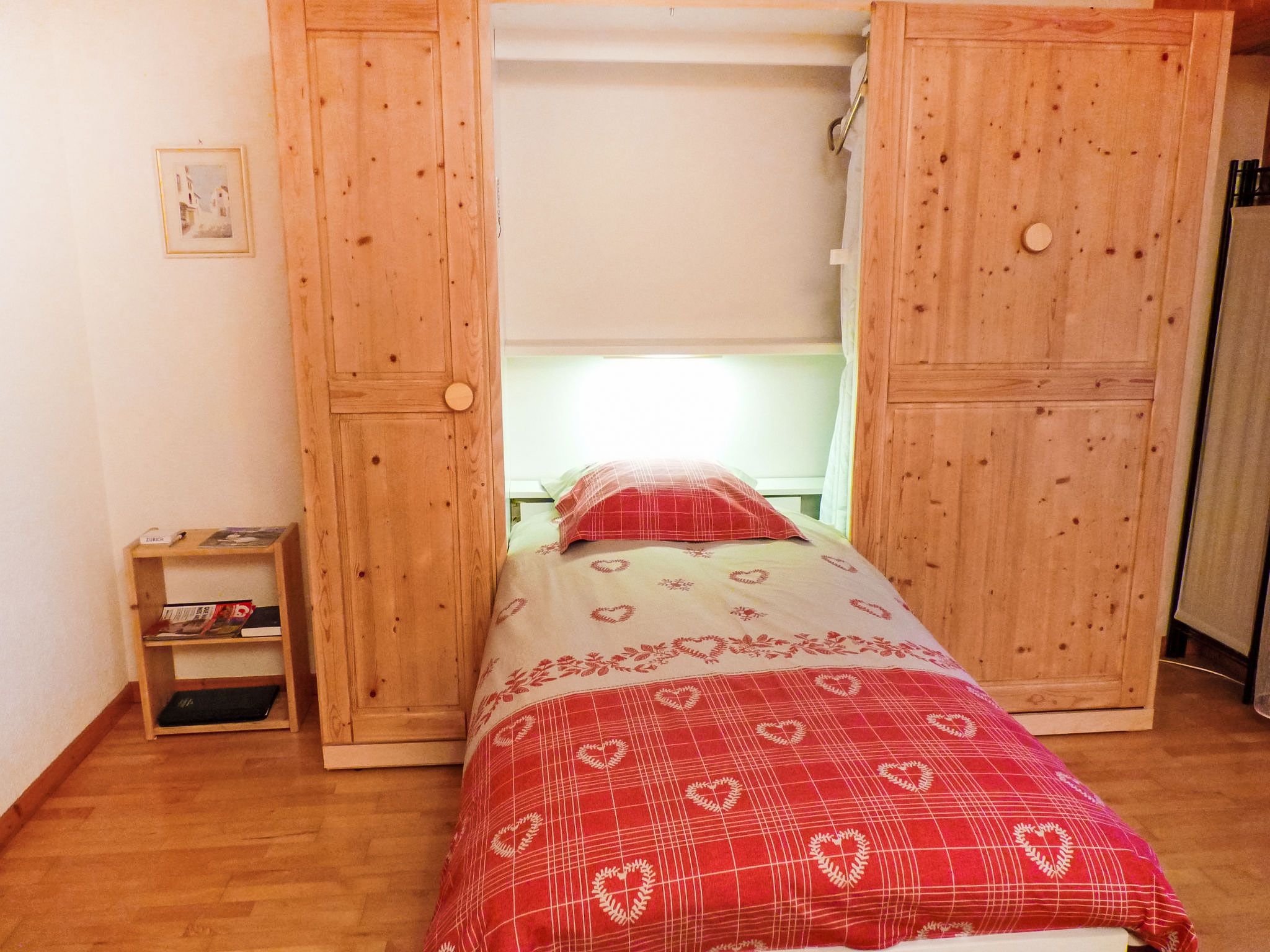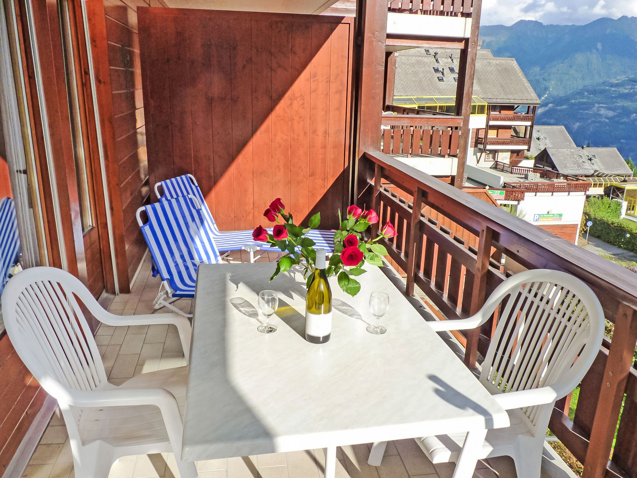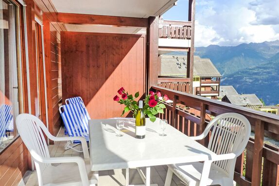 Sources 4109, 1-Zimmer-Studio 33 m2 im 1. Stock, Südlage. Hell, komfortabel und geschmackvoll eingerichtet: Wohn-/Schlafzimmer mit 2 Wandschrankbetten (90 cm, Länge 190 cm), Kabel-TV und Flachbildschirm. Ausgang zum Balkon. Kochnische (4 Kochplatten, Backofen, Geschirrspüler, Mikrowelle, elektrische Kaffeemaschine, Kapseln für die Kaffeemaschine (Nespresso) extra, Racletteofen, Fondue Set (Chinoise, Käse)) mit Esstisch. Bad/WC. Balkon 11 m2, Südlage. Balkonmöbel, Liegestühle (2). Sehr schöne Panoramasicht auf das Tal und das Schwimmbad. Zur Verfügung: Safe, Bügeleisen, Haartrockner. Internet (WLAN, gratis). Garage Nr. C11. Bitte beachten: Nichtraucher-Unterkunft.